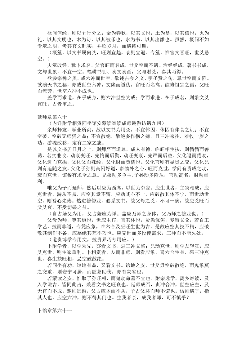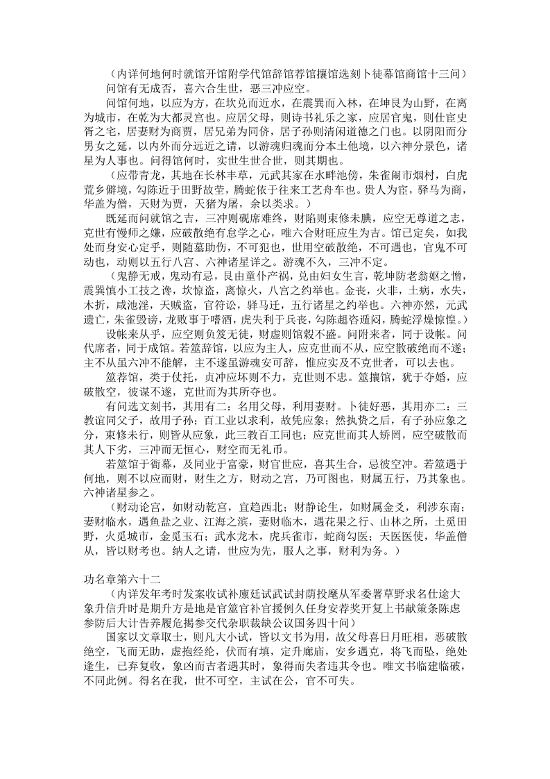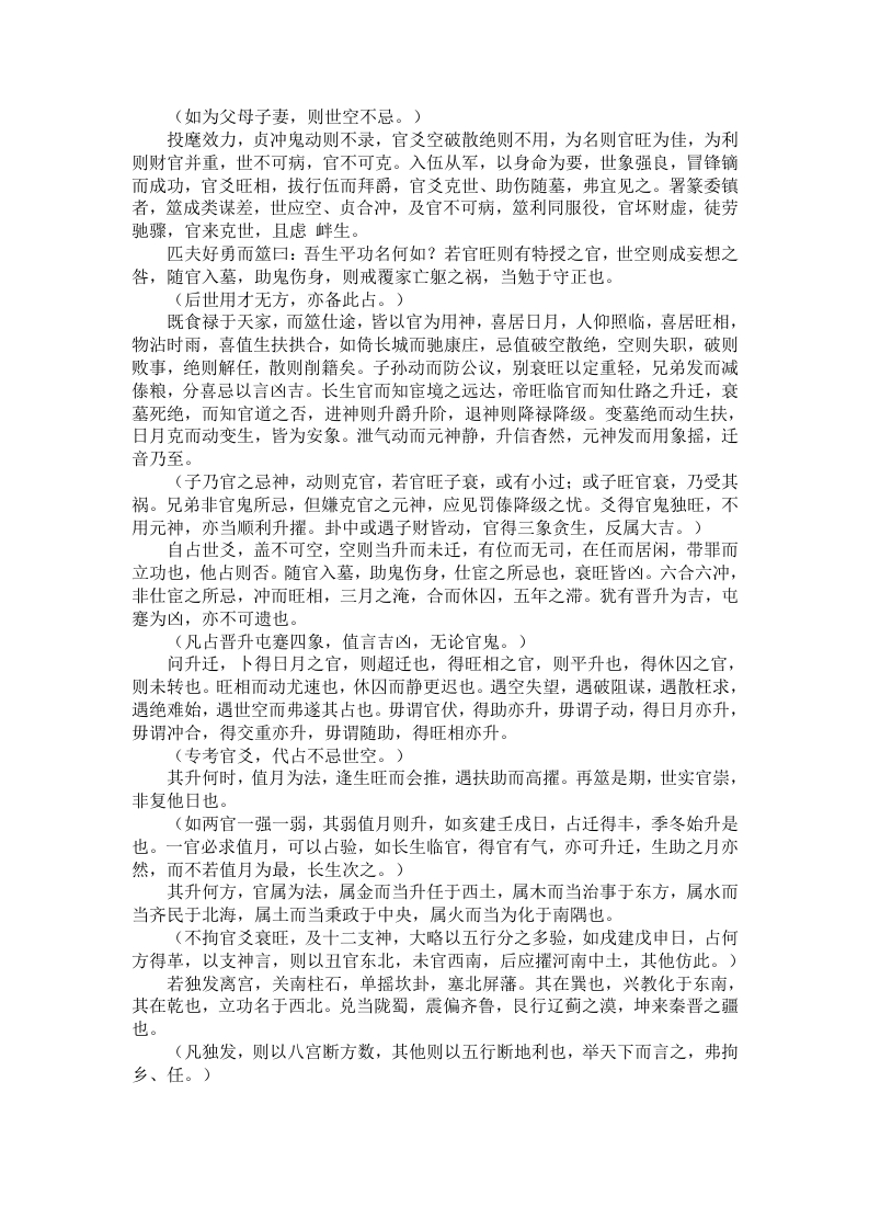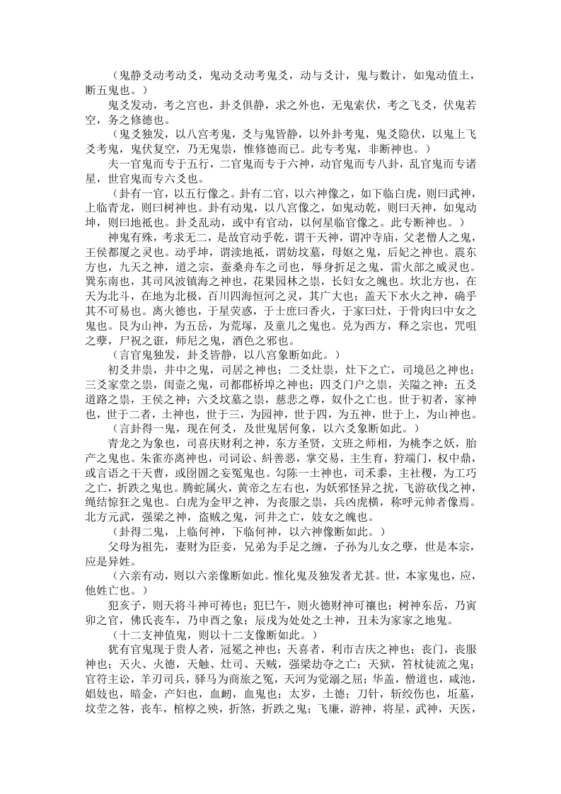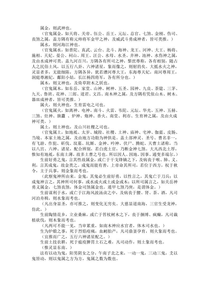 属金,则武神也。(官鬼属金,如天将、关帝、伍公、岳王、元坛、总官、七煞、金刚、伤司、丧煞之属,盖方隅有称元帅将军金甲之神,及威武斗勇成神者,皆可类推。)属水,则河海江神也。(官鬼属水,如普陀、真武、云台、北斗、海神、龙王、河神、大王、杨将、施相、天妃、晏公、祠山、周王、汪公、水母、水圣、井神、池神、水伤神之属,及由水成神可类。盖九河百川,方隅各有所司之神,黎庶尊称,各有相别,随占人之民俗土风,以五行八卦、六神诸星,象而像之,则射的矣。大抵水火之神,灵显者多,无能细陈,方隅各异,犹若漕河尊大王,东海尊天妃,南河尊周王,洞庭尊湘妃,鄱阳小姑,长江杨四将军,各有所分也。)属木,则文神也,及倚草附木之妖也。(官鬼属木,如东岳、家堂、山神、树神、五圣、园神、九良、茶筵、三茅、九天、鲁班、花神、三郎、道君、文昌、南木神之属,及方隅有凭依山木、树木、器皿成神者,皆可类推。)属火,则火神也,生育雷电之司也。(官鬼属火,如离神、电神、南斗、火雷、韦陀、元坛、华光、五神、五赫、三煞、灶神、旗纛、炉神、炮神、香火、南堂、利市、生育神之属,及由火成神可类。)属土,则土神也,及山川社稷之司也(官鬼属土,如地祗、太岁、城隍、社稷、土神、庙神、宅神、伽蓝、皮肠、当境、本家土地之属,及由地方功勣为神俱是。盖土部神灵、圣号、曹名非一,有飞游、作犯、斫伐、坟墓、坑厮、金神、吟神、伏尸、腾蛇、天曹土诸称,当以八宫、六神、诸星,配合辨别,若白虎土官,乃断金神七煞。大凡西北土厚,惟知有地祗,东南土薄,故多土曹之号也。所以因人、因地、因事、通变多端尔。)生前好勇之鬼,言其性故属金,或亡于干戈锋镝之下,及病丧于喉、肺、义、利,言其成鬼,故金类之。成鬼而能有善,上帝命其所司,若位于西方,权于秋令,主于兵事,则金象而考也。(此察鬼神所由来。金鬼,其鬼必生前好勇,以性言之,其鬼亡于刀兵;以成鬼神言之,其神所司何事,或水或火或土或金或木:以所司属言之,如关岳神勇义属金,七煞丧煞,体金司煞属金也。遁甲七煞乃庚,是谓体金。)生前谋利于水,或亡于江海风波汤卤之中,及病丧于腰、肾、茶、酒,凡司河泊舟楫,则水象而考也。(凡出身显圣,亦可推之,则变化无穷矣。大慈显道南海,三官生受龙神,仿此。)生前陶情花乡,立业桑麻,或亡于笞杖树木之下,丧于捆缚、疯癫,凡司栽植砍伐,则木象而考也。(凡两可不能一见,当审累重,如南木神应水官者,体木司水也。)生为炉煅之事,死于烈焰疮痍,血衂胎产,凡司鼎釜孕育,则火象而考也。(宜推而广之,五行六神诸星配之。)生前土技农耕,死于瘟疫脾胃土石之难,凡司动作,则土象而考也。(惟灵显东南。)法有以动为鬼,阳男阴女之分,午南子北之来,一动一鬼,三动三鬼,爻以鬼皆动,则以鬼属之方为方,鬼属之数为数也。