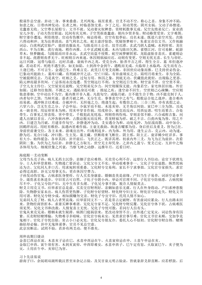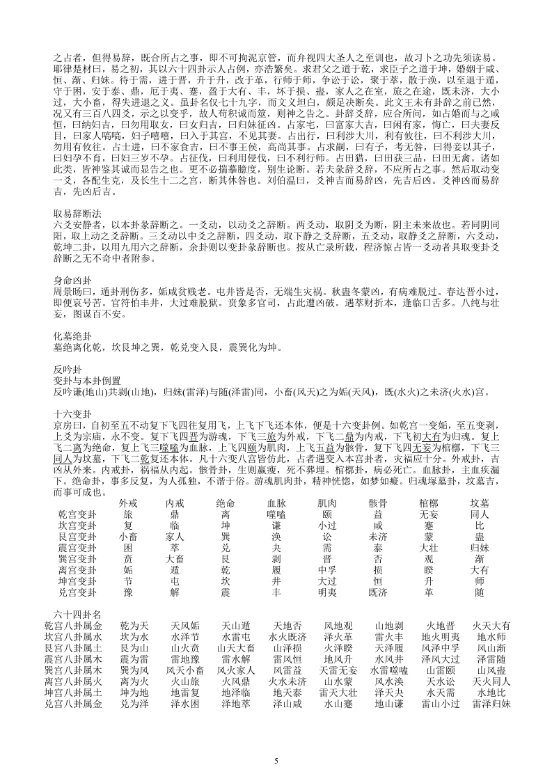 谋望占求财占贸易占开店占寄物占卷八疾病占讼狱占逃亡占遗失占盜贼占卜筮之道惟身命,家宅坟茔婚姻行人疾病数者尤难,故弁之于首,以示所重,非敢颠紊旧目也。易隐参引书目黄帝常阳经夏连山易商归藏易周易周易乾坤鉴度王诩麻衣赋鬼谷百部篇孙膑探玄歌张子房筮法东方曼倩射覆诀君平秘授罗冲心法焦氏易林京君明海底眼京氏易传京君明火珠林扬雄太玄晁以道京氏易式荀爽易传关子明易传董贺筮秘武侯全州山藏书管氏照心神鉴经管公明十三篇管公金书六事口诀管公问答口诀管氏五星秘要郭景纯青囊集郭公八纯筮法郭氏洞林秘诀隗炤燃犀集袁天罡太乙命诀袁客师占验目录李淳风周易玄悟李淳风占灯法郭雍著卦辨疑孔颗达正义李鼎祚集解一行师卜诀卫元嵩元包陆德明指草诀杜氏遗编程圣俞集筮法丘寺丞易鉴麻衣道者正论陈希夷紫微数曹子虚源髓论周杰松经玄谈司马温公潜虚邵康节观梅数程邵朱三儒理数罗止菴卜易统宗黄士瑶占易龟鉴高沧鹤前知集皮台峰筮诀柳隆玉灵经王梦菴义通僧明睿抄本林开蜀市日记耶律楚材锦囊集范畴惊人鸣汤通玄卜学渊海刘伯温黄金策程济从亡录王希明筮法指南尹铁口惊破胆集沈景赐课要袁子占法提纲颗师问答录周仲高易译季彭山易学四同张星元易林补遗吴甘泉要抄魏道南日录卜筮元龟卜易玄机金锁玄关问卜易览心易大成卜筮全书六壬神定经六王心机绝法六壬磨镜药六王毕法赋灵棋经通玄赋天玄赋万金赋碎金赋六爻穿断法白玉赋行限歌限门赋井底赋坚命赋沧海赋逼运赋千金赋赛国赋壶中赋天象赋分野图参舟赋舟居赋新创赋详基赋柳神经何知章五行赋六神赋性情赋容貌赋宅秘鬼料穷鬼惊胆易隐卷首八卦象例乾三连坤六断震仰盂艮覆碗离中虚坎中满兑上缺巽下断五行生克金生水,水生木,木生火,火生土,土生金,金克木,木克土,土克水,水克火,火克金。天干所属甲乙丙丁戊己庚辛壬癸2