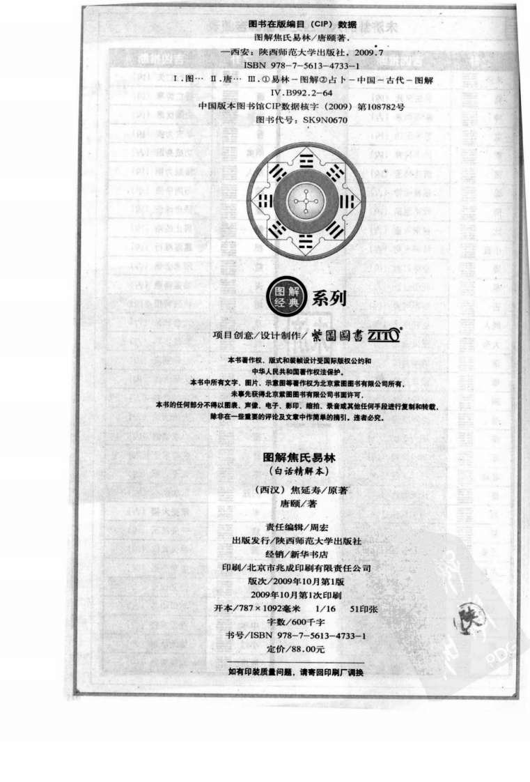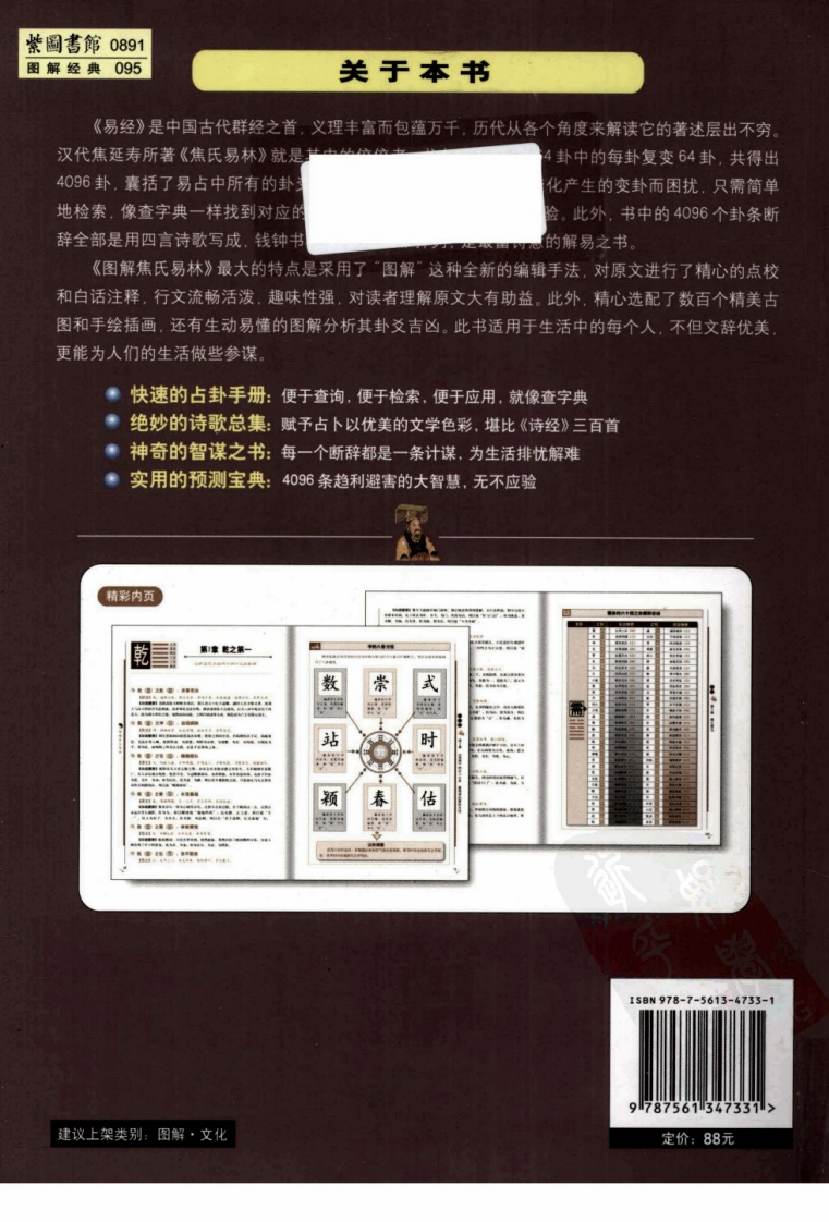 紫国書第0891图解经典095关于本书《易经》是中国古代群经之首,义理丰富而包蕴万千,历代从各个角度来解读它的著述层出不穷。汉代焦延寿所著《焦氏易林》就是4卦中的每卦复变64卦,共得出4096卦,囊括了易占中所有的卦化产生的变卦而困扰,只需简单地检索,像查字典一样找到对应日验。此外,书中的4096个卦条断辞全部是用四言诗歌写成,钱钟书心的解易之书。《图解焦氏易林》最大的特点是采用了“图解”这种全新的编辑手法,对原文进行了精心的点校和白话注释,行文流畅活泼,趣味性强,对读者理解原文大有助益。此外,精心选配了数百个精美古图和手绘插画,还有生动易懂的图解分析其卦爻吉凶。此书适用于生活中的每个人,不但文辞优美更能为人们的生活做些参谋。●快速的占卦手册:便于查询,便于检索,便于应用,就像查字典●绝妙的诗歌总集:赋予占卜以优美的文学色彩,堪比《诗经》三百首●神奇的智谋之书:每一个断辞都是一条计谋,为生活排忧解难。实用的预测宝典:4096条趋利避害的大智慧,无不应验精彩内页】第家乾之第数崇式站时7春估I5BN978-7-5613-4733-197875611347331>建议上架类别:图解·文化定价:88元