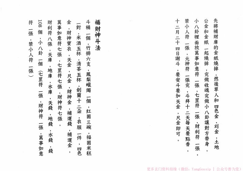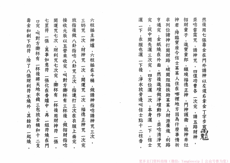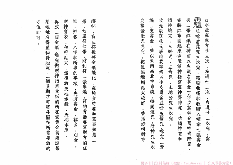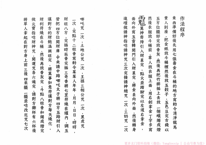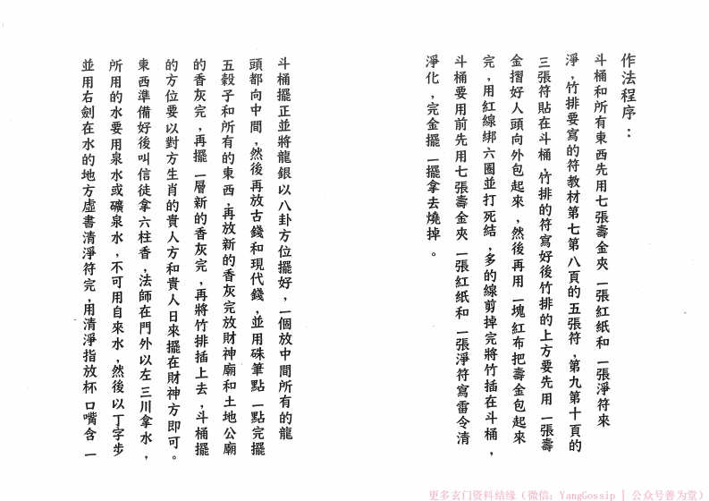 作法程序:並用右劍在水的地方虚書清净符完,用清淨指放杯口嘴含一所用的水要用泉水或碳泉水,不可用自來水,然後以丁字步東西準備好後叫信徒拿六柱香,法師在門外以左三川拿水,的方位要以對方生肖的貴人方和貴人日來播在財神方即可。的香灰完,再擺净化,完金擺一擺拿去燒掉。一層新的香灰完,再將竹排插上去,斗桶援五穀子和所有的東西,再放新的香灰完放財神廟和土地公廟頭都向中間,然後再放古錢和現代錢,並用珠筆點一點完擺斗桶擺正並將龍銀以八卦方位擺好,一個放中間所有的龍斗桶要用前先用七張壽金央一張紅紙和一張净符寫雷令清完,用紅線绑六圈並打死結,多的線剪掉完將竹插在斗桶,金糟好人頭向外包起來,然後再用一塊紅布把壽金包起來三張符點在斗桶竹排的符寫好後竹排的上方要先用一張壽净,竹排要寫的符教材第七第八真的五張符,第九第十真的斗桶和所有東西先用七張壽金爽一張紅纸和一張净符來YangGossip公众号善为堂)
