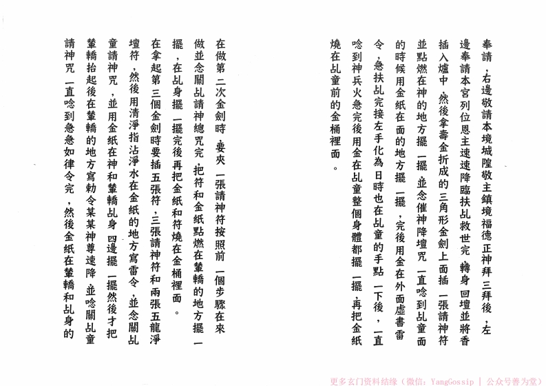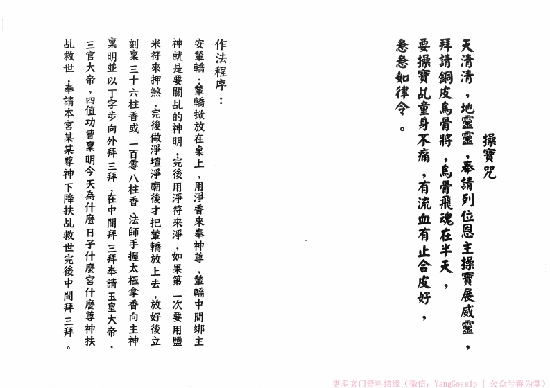 作法程序:乩救世·奉請本宫某某尊神下降扶扒救世完後中間拜三拜。三官大帝,四值功曹明今天為什麼日子什麼宫什麼尊神扶明並以丁字步向外拜三拜,在中間拜三拜奉請玉皇大帝刻烹三十六柱香或一百零八柱香法師手握太極拿香向主神米符來押煞,完後做淨壇淨廟後才把鼙轎放上去,放好後立神就是要關的神明,完後用淨符來淨,如果第一次要用安梦轎:·鼙轎掀放在桌上,用淨香來奉神尊,梦轎中間绑主急急如律令要操寶童身不痛,有流血有止合皮好,拜請銅皮鳥骨將,烏骨飛魂在半天,天清清,地靈靈,奉請列位恩主操寶展威靈,操寶咒更多玄门资料结缘(微信:YangGossip公众号善为堂)