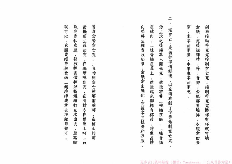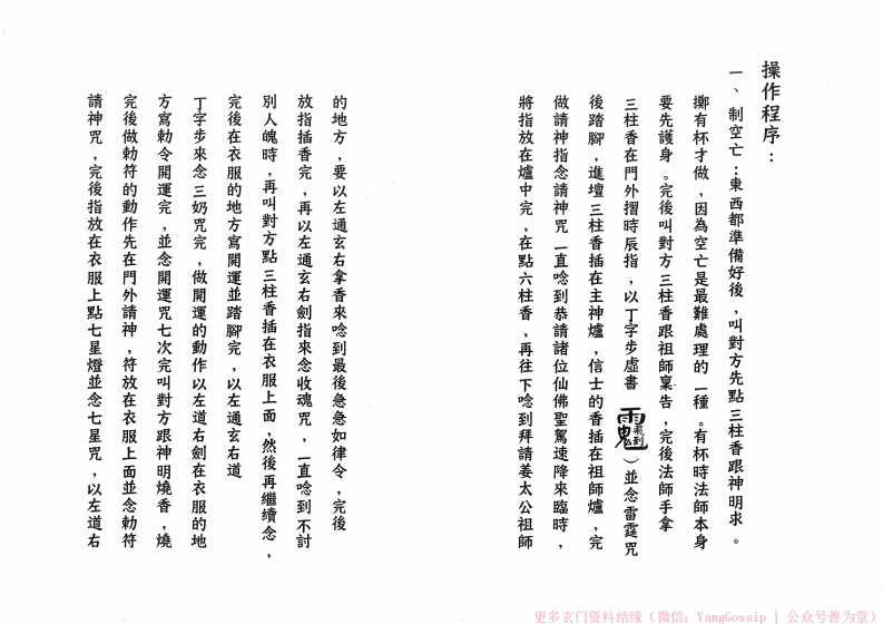 闾山祭空亡飞蛇sishuge3天前发布关注私信4.53MB16页0479闾山祭空亡飞蛇此内容为付费资源,请付费后查看¥3¥6VIP会员免费钻石会员免费立即购买您当前未登录!建议登陆后购买,可保存购买订单付费资源 第1页 / 共16页 第2页 / 共16页 第3页 / 共16页 第4页 / 共16页 第5页 / 共16页 第6页 / 共16页 第7页 / 共16页 第8页 / 共16页 试读已结束,还剩8页,您可下载完整版后进行离线阅读 © 版权声明文章版权归作者所有,未经允许请勿转载。THE END道法符咒# 道家# 闾山# 120本闾山法师 文本预览 神桌主静心)门门©清茶姜太公三十六把J祖師牌一個(⑧紅蠟燭一對制空亡法準備物品:神桌前金桶盤金)香爐一個。()水果三樣()四方桶盤一個⊙)自家米男左女右衣服二件,一件要,另外一件不要。)七星燈兩組。七星婚要用耳梨小蝶燭由上往下贴更多玄门资料结缘(微信:YangGossip公众号善为堂) 查看更多 收起部分 喜欢就支持一下吧点赞9 分享QQ空间微博QQ好友海报分享复制链接收藏