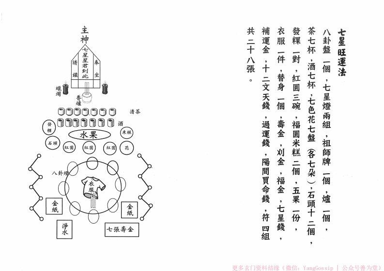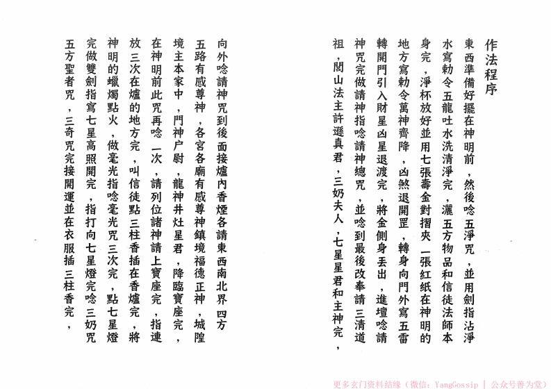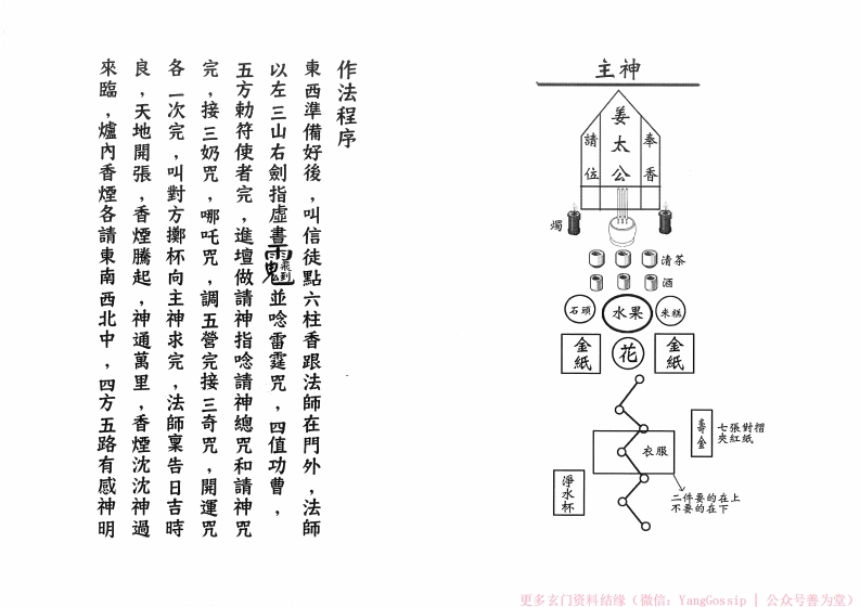 主神作法程序姜太來臨,爐内香煙各請東南西北中,四方五路有威神明良,天地開張,香煙腾起,神通萬里,香煙沈沈神過各一次完,叫對方擲杯向主神求完,法師稟告日吉時完,接三奶咒,哪吒咒,調五營完接三奇咒,開運咒五方刺符使者完,進壇做請神指隐請神總咒和請神咒以左三山右劍指虚書雨盟並哈雷霆咒,四值功會,東西準備好後,叫信徒點六柱香跟法師在門外,法師位公香0清茶⑤3酒石项水果来糕花壽金夫發我超衣服净水杯二件要的在上不要的在下更多玄门资料结缘(微信:YangGossip公众号普为堂)
