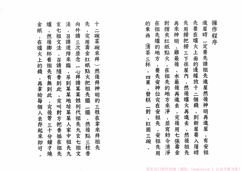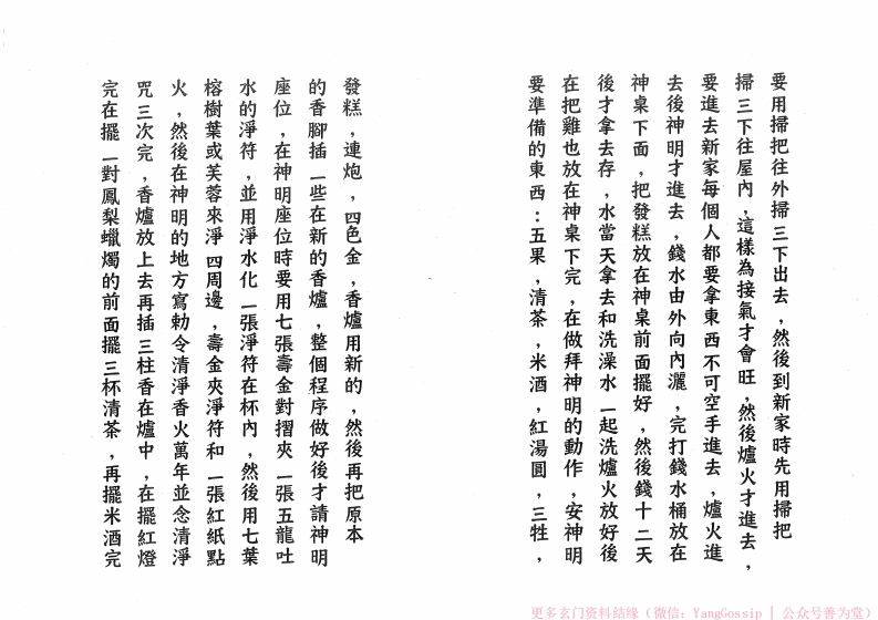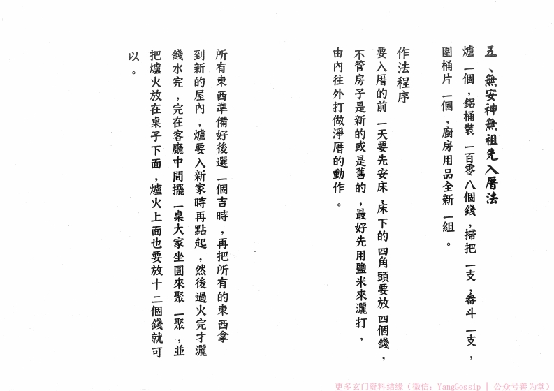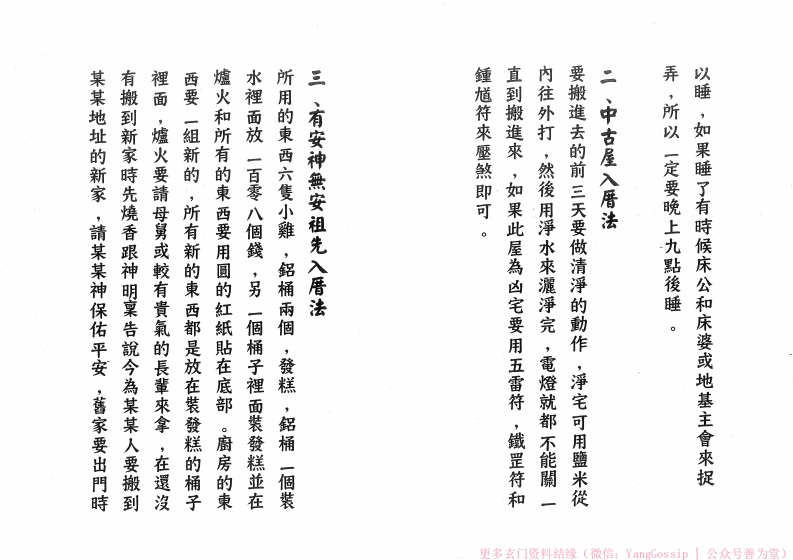 一定要先淨厝,在搬進新厝時還不到晚上,床是不可所用的金纸是婆姐衣或壽金在還沒有搬進去新厝時,在保護未满十六歲的小孩,在拜床公和床婆的時候,他們的房間一定要拜床公和床婆,因為床公和床婆是然後再把床放下,家中如有未满十六歲的孩子,碗來拜床公和床婆,然後床下的四角頭要放四個錢,入厝時要先安床,在安床時要用發糕一入厝要缺和禁忌清净咒一個,紅湯圓一除穢除氛萬邪歸正·绪厄不侵急急如律令天靈地靈神符清净,九風破穢五龍吐水,更多玄门资料结缘(微信:YangGossip公众号善为堂)