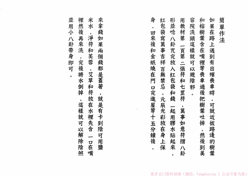 並用小八卦带身即可。簡單作法裡然後再來洗,完後將水倒掉,這樣就可以解除陰熟然米水,净符和芙蓉,艾草和符放在水裡先含一口在嘴來拿錢如果兩個錢都是蓋著,就是有卡到陰可用鹽身,回來後和金紙燒在門口完進屋等十五分鐘後紅包袋寫萬事吉祥百無禁忌,元辰光彩放在身上保形並隐八卦咒完放入紅包袋和錢一起用膠水贴起來用教材第一真第二張符和七罡符,萬事如意符糟八卦容院洗頭這樣就可以避陰邪。和榕樹葉含在嘴裡等喪車過後把樹葉吐掉,然後到美如果在路上遇到有出殯喪車時,可就近拔路邊的樹葉更多玄门资料结缘(微信:YangGos sip公众号善为堂)