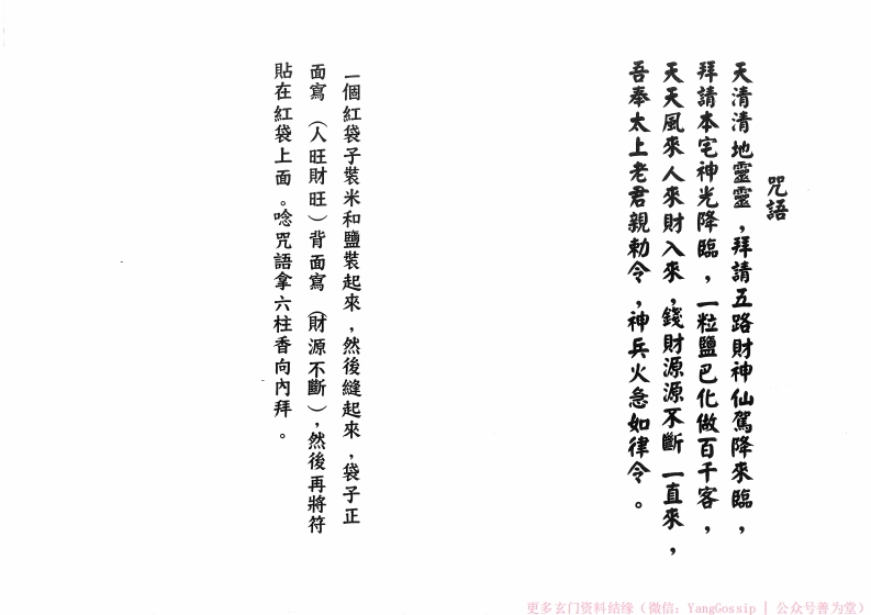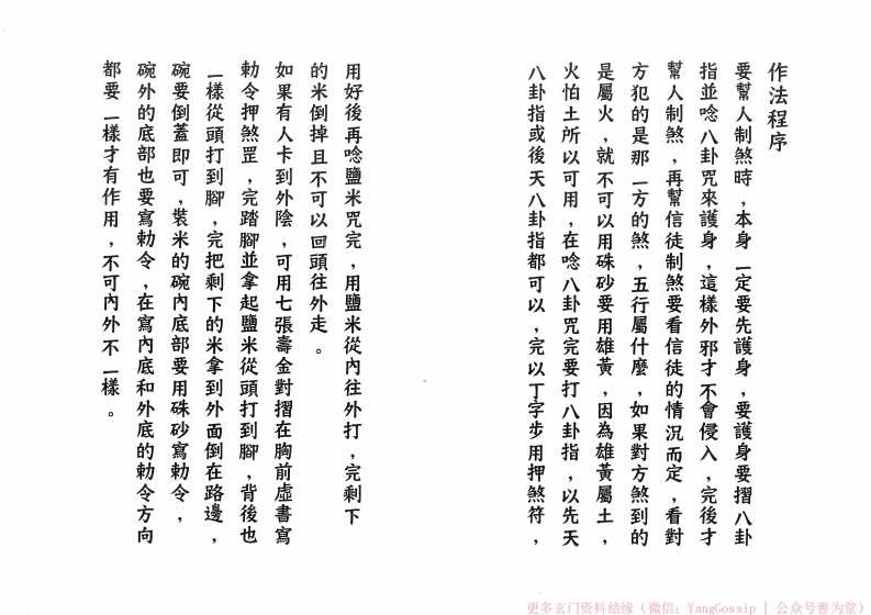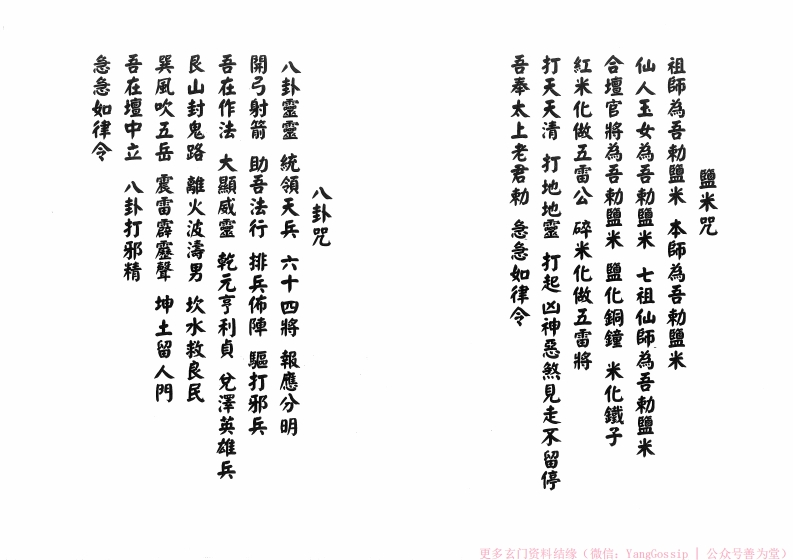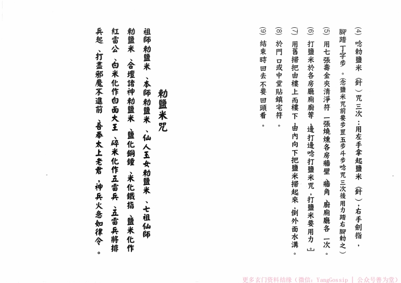 )哈勵壁米兵起、打盡邪魔不進前、吾奉太上老君,神兵火急如律令。红雷公、白米化作白面大王、碎米化作五雷兵、五雷兵將排勒鹽米、合壇绪神刺蟹米、鹽化銅鐘、米化鐵指、鹽米化作祖师勒盟米、本師勒盟米、仙人玉女利蟹米、七祖仙師勒盟米咒9)結東時回去不要回頭看。於門口或中堂贴鎮宅符用舊掃把由樓上而樓下由内向下把鹽米掃起來,倒外面水溝。打鹽米於各房廳厕廚等·逢打邊打鹽米咒,打鹽米要用力G)用七張壽金夾清净符一張燒煤各房牆壁牆角廚扁廳各一次。脚踏丁字步。念鹽米咒前要步显五步斗步哈咒三次後用力踏右腳物之)針)咒三次:用左手拿起鹽米針),右手劍指,更多玄门资料结缘(微信:YangGossip公众号善为堂)