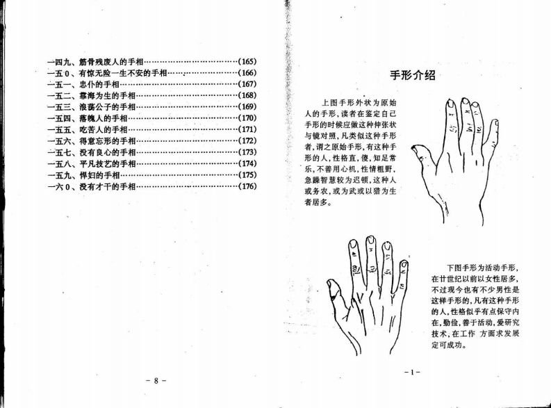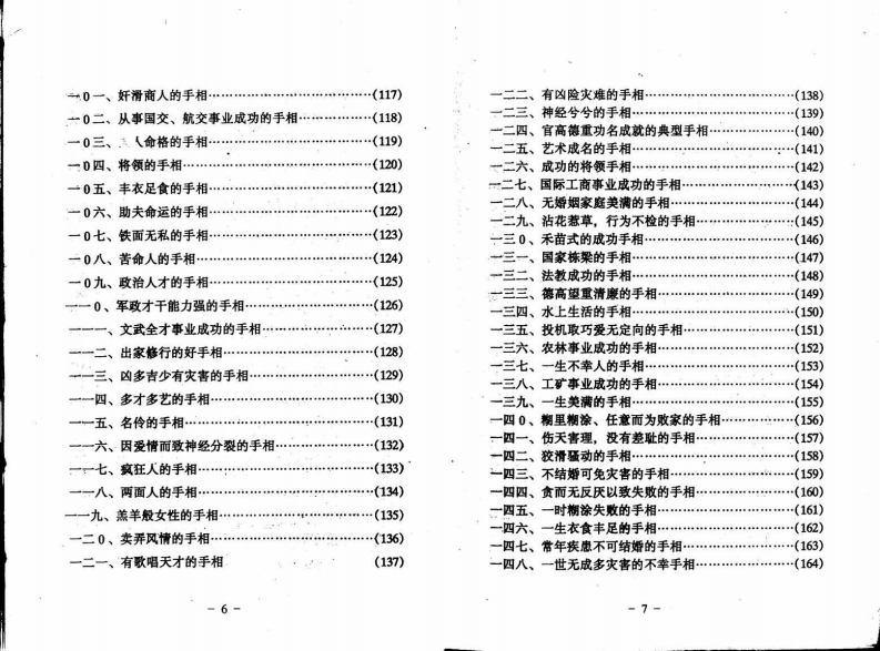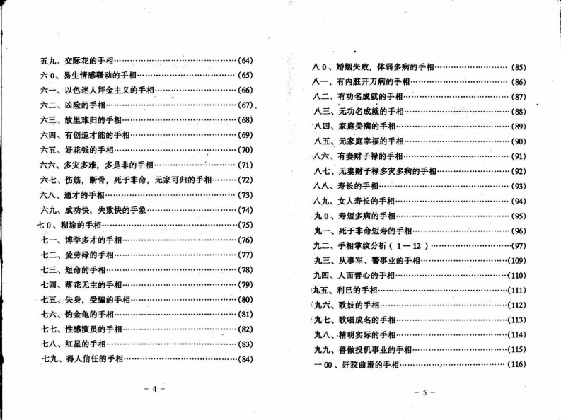 目录手形介绍:(一)附图(一、二、三、四、五、六)…(1)手相掌纹与部位名称图解……………(4)实录:一、多灾,多害的手相…………(6)二、克夫克子的手相………(7)三、个性影响而遭不幸的手相…………(8)四、不幸的女人手相…(9)五、婚烟失败的手相………(10)六、六亲无靠的手相……(11)七、没有家庭美满的手相…(12)八、多才多艺的手相………(13)九、有内驻病的手相(14)十、多病的手相…(们5)一一、不无正业的手相…(16)一二、易生残疾的手相………17)一三、婚烟多变的手相·(18)一四、厉害的手相…(19)一五、克子的手相…(20)一六、婚难成的手相(21)-1-