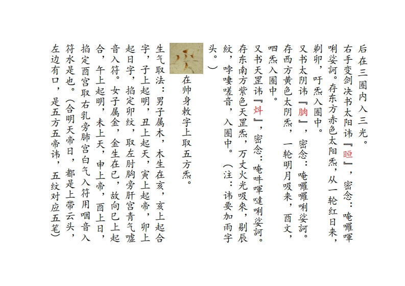 头。)左边有口,是五方五帝讳,五纹对应五笔)符水是也。(合明天帝日,都是上带云头:掐定西宫取右乳旁肺宫白气入符用咽音入合,午上起明,未上天,申上帝,酉上日,音入符。女子属金,金生在已,故向已上起起日字,招定卯纹,取左肘胸旁肝宫青气虚字,子上起明,丑上起天,寅上起帝,卵上生气取法:男子属木,木生在亥,亥上起合在帅身救字上取五方源。纹,呼咳嗟音,入圈中。(注:伟要加雨字存东南方紫色天罡然,万丈火光吸來,剔辰又书天罡讳「料」,密念:喹畔軍娃刚婆詞。四然入圈中。存西方黄色太阴乐,一轮明月吸来,西文,又书太阴讳「脑」,密念:掩囉哪刚姿詞。别卯,呼然入圈中。刚姿詞。存东方赤色太阳然,从一轮红日来,右手变剑决书太阳讳「晅」,密念:掩羅軍后在三圈内入三光。