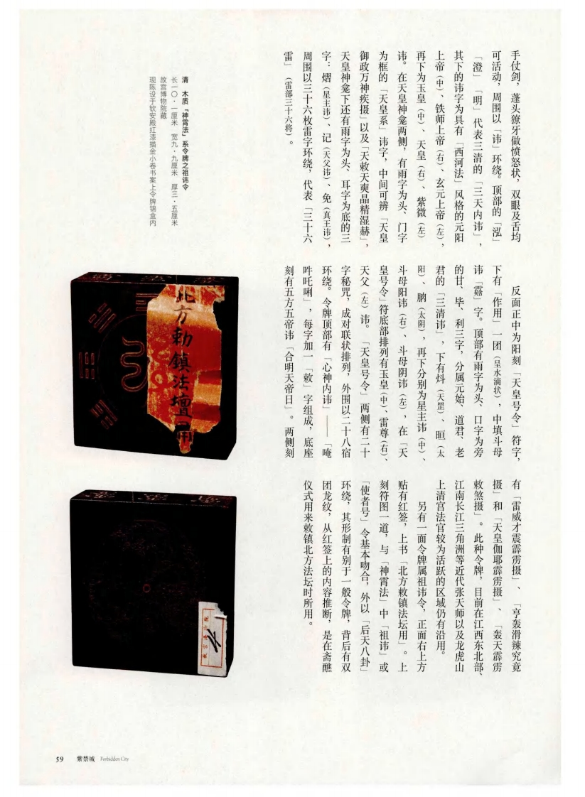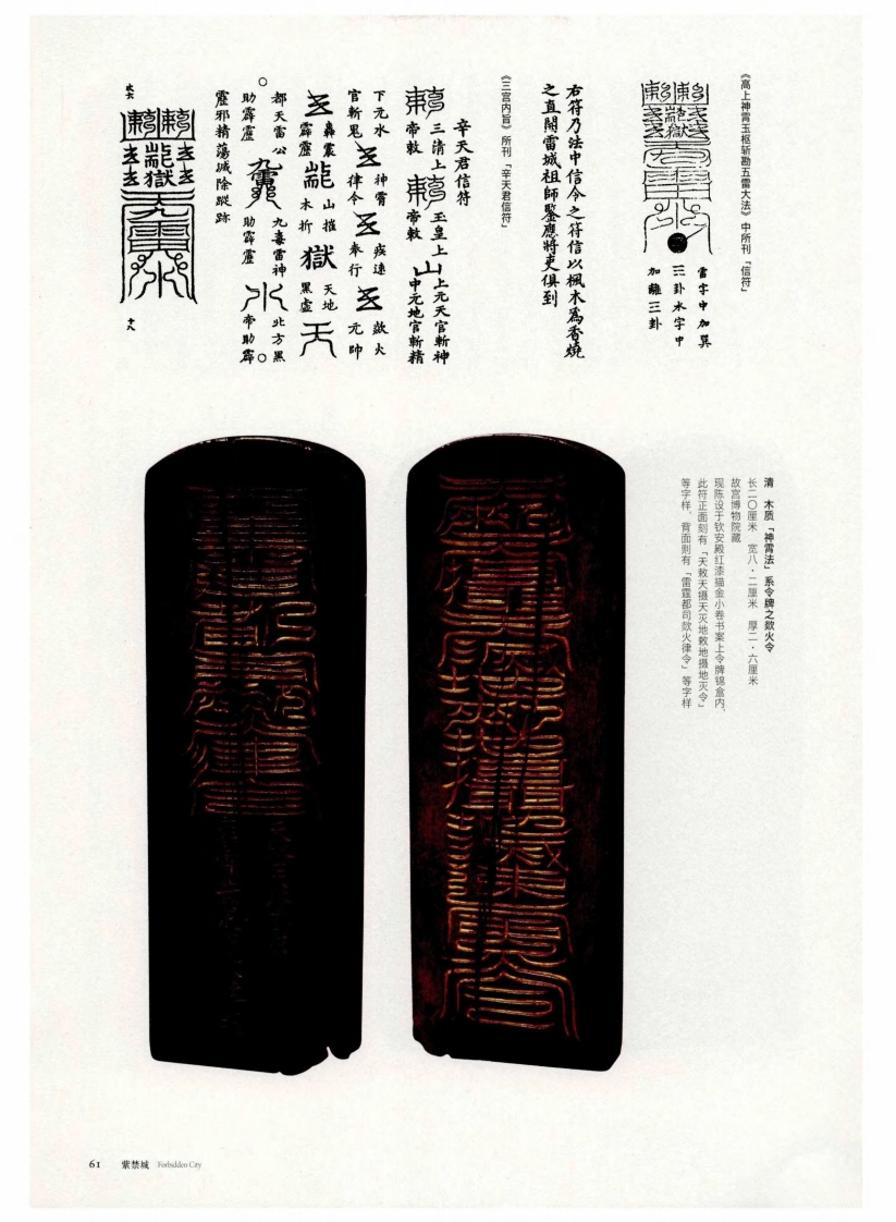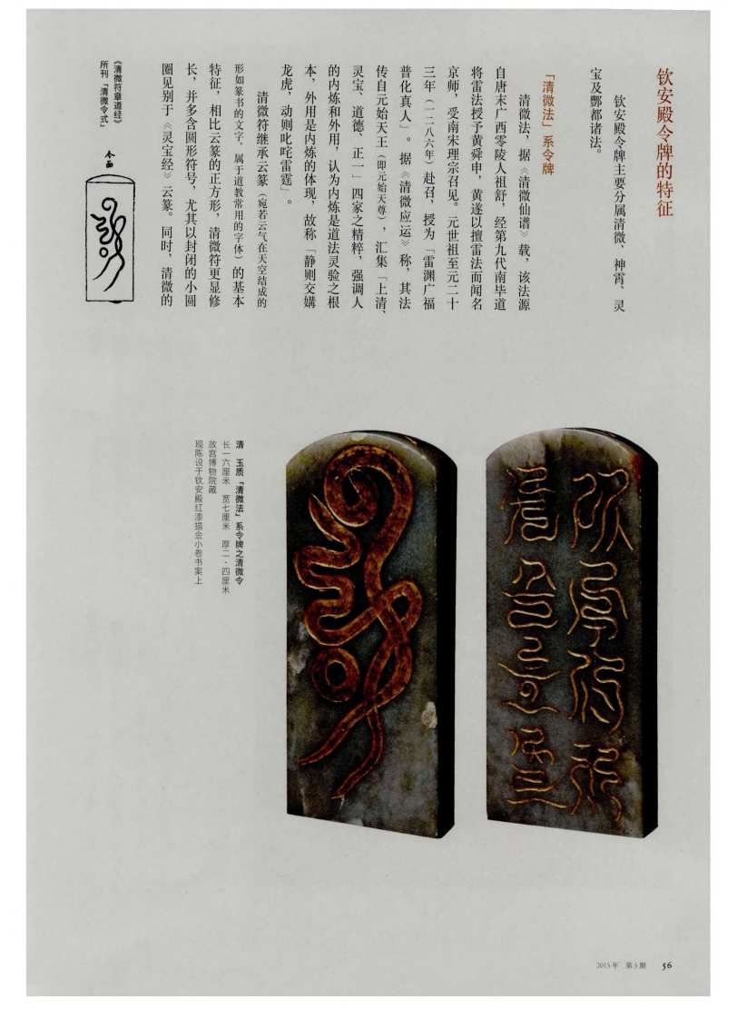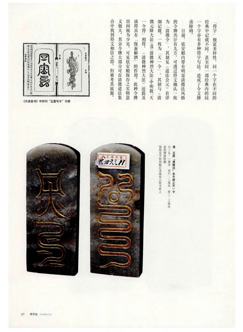 所刊「清微令式】《清微符章道经》圈见别于《灵宝经》云篆。同时,清微的长,并多含圆形符号,尤其以封闭的小圆特征,相比云篆的正方形,清微符更显修形如篆书的文字,属于道教常用的字体)的基本清微符继承云篆(宛若云气在天空结成的龙虎,动则此陀雷霆」。本,外用是内炼的体现,故称「静则交媾的内炼和外用,认为内炼是道法灵验之根灵宝、道德、正一二四家之精粹,强调人传自元始天王(即元始天尊),汇集「上清普化真人」。据《清微应运》称,其法三年(一二八六年)赴召,授为「雷渊广福京师,受南宋理宗召见。元世祖至元二十将雷法授予黄舜申,黄遂以擅雷法而闻名自唐末广西零陵人祖舒,经第九代南毕道清微法,据《清微仙谱》载,该法源「清微法」系令牌宝及哪都诸法。钦安殿令牌主要分属清微、钦安殿令牌的特征神霄、灵现陈设于钦安毅红漆描金小卷书案上故宫博物院藏长一六厘米宽七厘米厚二·四厘米清玉质「清微法」系令牌之清微令205年第5期56