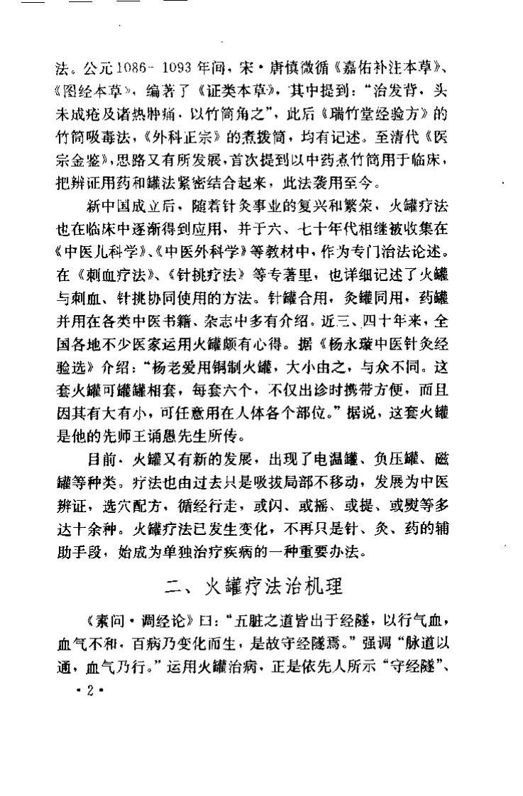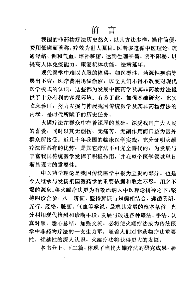 前言我国的非药物疗法历史悠久,以其方法多样,操作简便、费用低廉而著称。疗效为世人瞩目。医者多遵循中医理论,疏通经络,调和气血、培补脏腑,达到生理平衡,阴平阳秘,以提高人体免疫能力,康复机体功能,祛病延年。现代医学中难以克服的障碍、如医源性、药源性疾病等层出不穷,医疗费用迅猛激涨、以至人们不得不改变对现代医学模式的认识,这些都为发展中医药学及其非药物疗法提供了十分有利的客观环境。有鉴于此,加强基础研究,充实临床验证,努力发掘与伸展我国传统医学及其非药物疗法的内涵,是时代所赋予的历史任务火罐疗法在群众中有着深厚的基础、深受我国广大人民的喜爱,同时以其无创伤,无痛苦、无副作用而日益为国外群众所接受。近几十年我国的临床医学实践,充分证明火罐疗法所其有的优势,是其它疗法不可完全替代的、为发展与丰富我国传统医学发挥了积极作用,并在整个医学领域里目渐显现它的重要性。中医药学理论是我国传统医学中极为宝贵的部分,也是今人继承与发扬祖国医药学的重要依据和取之不尽,用之不竭的源泉。将火罐疗法更为有效地纳入中医理论指导之下,坚持四诊合参,八辨证,坚持辨证与辨病相结合,遵循阴阳、五行、经络、脏腑、气血等学说,是求其发展的根本条件。充分利用现代检测和诊晰手段,发展与改进各种罐法、手法,认真对照,悉心总结,加强交流,必将使火罐疗法成为传统医学中非药物疗法的一支生力军。随着人们对非药物疗法重要性、优越性的深人认识,火罐疗法将获得更大的发展。本书分上、下二篇,体现了当代火罐疗法的研究成果,展