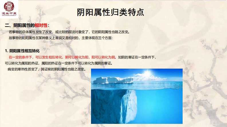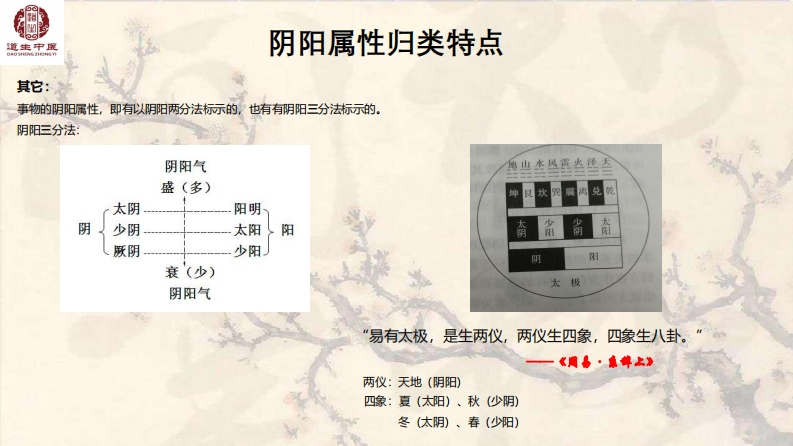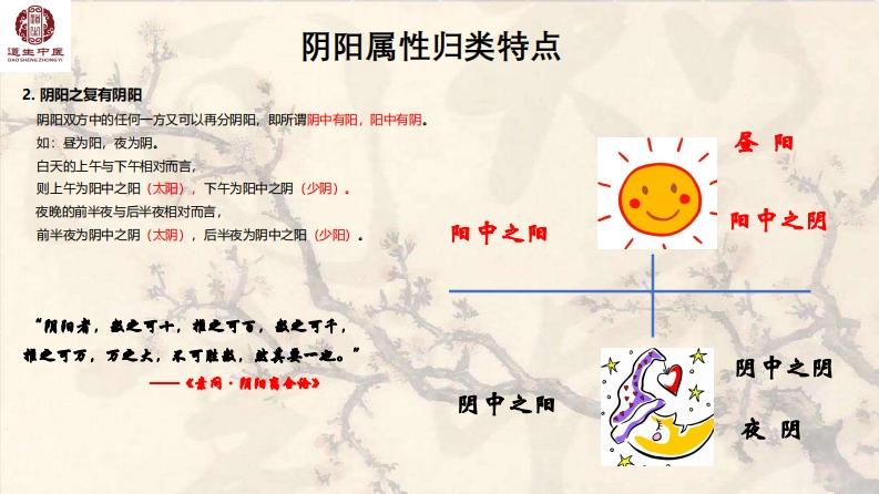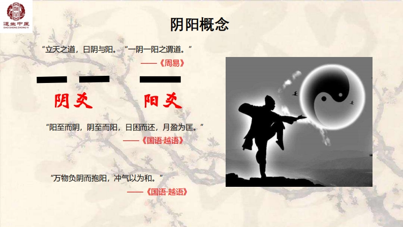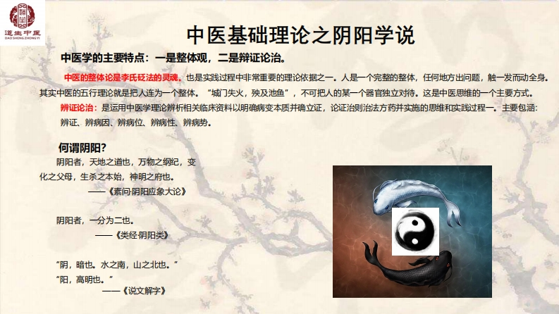 道生中宝中医基础理论之阴阳学说中医学的主要特点:一是整体观,二是辩证论治。中医的整体论是李氏砭法的灵魂。也是实践过程中非常重要的理论依据之一。人是一个完整的整体,任何地方出问题,触一发而动全身。其实中医的五行理论就是把人连为一个整体。“城门失火,殃及池鱼”,不可把人的某一个器官独立对待。这是中医思维的一个主要方式。辨证论治:是运用中医学理论辨析相关临床资料以明确病变本质并确立证,论证治则治法方药并实施的思维和实践过程一。主要包酒:辨证、辨病因、辨病位、辨病性、辨病势。何谓阴阳?阴阳者,天地之道也,万物之纲纪,变化之父母,生杀之本始,神明之府也。一《素问阴阳应象大论》阴阳者,一分为二也。《类经阴阳类》“阴,暗也。水之南,山之北也。““阳,高明驰。"一一《说文解字》