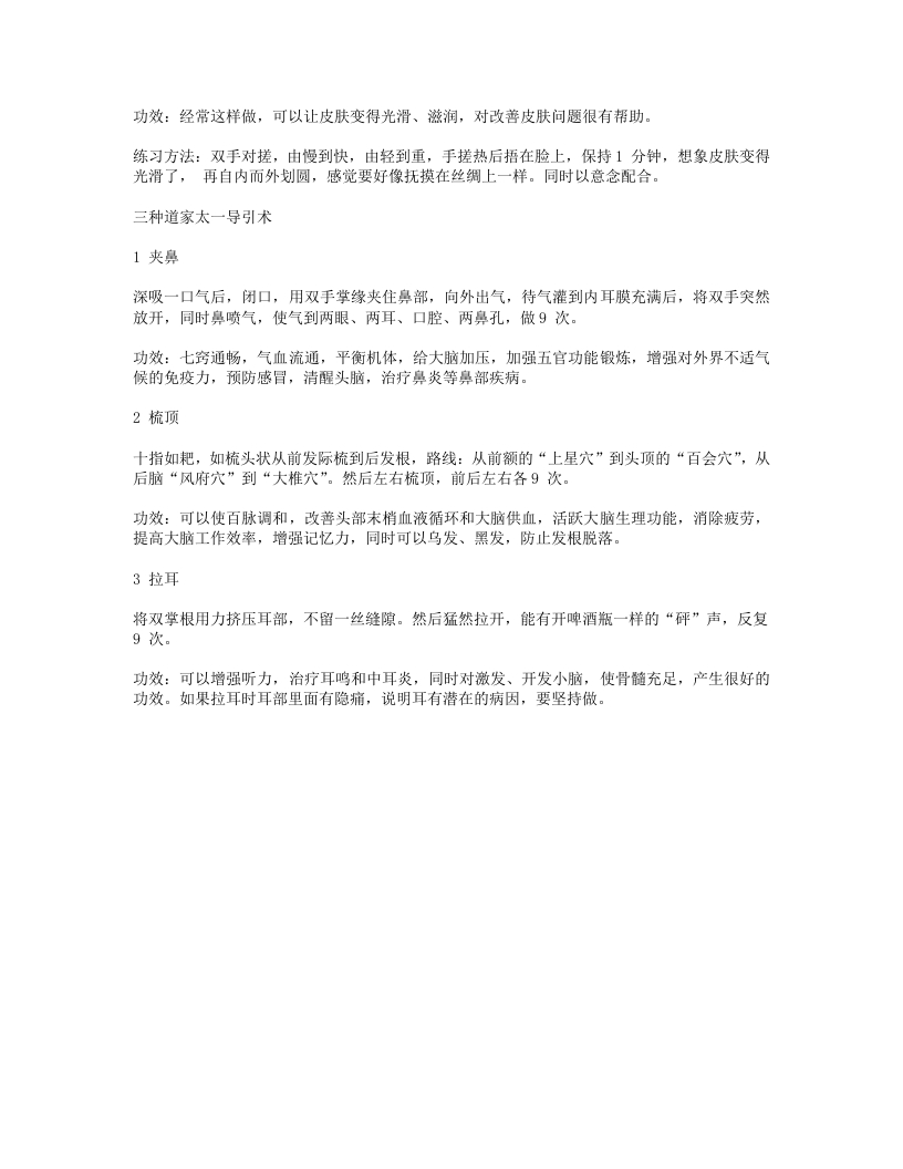 中国古典哲学包括儒、释、道三大体系,唯有道家重视今生,认为人生在世是件快乐的事。道家的宗旨是把握人生,争取竞其天年,因而道家人物均以自身为试验,寻求、探索能够使人长寿的方法,这些方法就是养生之术。这个理念也是最适合现代的。道家养生中进行养气、修身的练习,恰好满足了现代人关注身体健康、祛病延寿的要求。本文就为您介绍几招简单易学的道家养生术。拍打头颈法功效:此健身方法可防治头晕、头痛等头部疾病,有延缓脑力衰退、增强记忆力的作用。练习方法:坐于椅子上或站立,双眼平视前方,全身放松。然后举起双臂,用双掌同时拍打颈部,左手拍打左侧颈部,右手拍打右侧颈部。先从后颈开始,逐渐向上拍打,一直拍打到前额部,再从前额部往后拍打,直到后颈部,这样反复拍打5~8遍为一次。每日晨起与临睡前可各做一次。踮脚健身法功效:这种方法适合在办公室久坐的人,可以缓解久坐或久站后的下肢酸胀、乏力,促进下肢血液回流,预防下肢静脉曲张。练习方法:将脚跟抬起,脚后跟离地面约1厘米,然后用力着地,这样为1次,1秒钟内不得多于1次,30次为1组,休息5~10秒钟。每次锻炼1~2分钟,每天锻炼3~5次。要注意锻炼时抬高脚后跟不能超过1厘米,否则不仅不会有效,反而还会引起脚掌的疲劳。大呼大吸法功效:这是一种以扩大肺活量为主的呼吸法,类似深呼吸,能调动机体的内气,增强体质和免疫力,同时对某些慢性病、疑难病均有一定的疗效。练习方法:大呼大吸法是一种古代吐纳、导引法。具体的方法是用鼻使劲地吸气,用口呼气,或用鼻使劲地大呼大吸。要求每一吸一呼都尽量延长时间,并要求每一吸一呼都发出较大的声音,所以称为大呼大吸法。太乙站桩功功效:根据屈腿的程度有不同作用:高桩增肥,中桩减肥,低桩练武。收势为双手交叉放在身前(女性右手在内),用力收腹提肛,脚趾抠地,收缩肌肉,可防治便秘、痔疮。练习方法:舌头抵上颚,提肛,双手抱圆放在胸前,双腿弯屈,调整呼吸,吸气时默念“静”,呼气时默念“松”,坚持半小时女性驻颜法