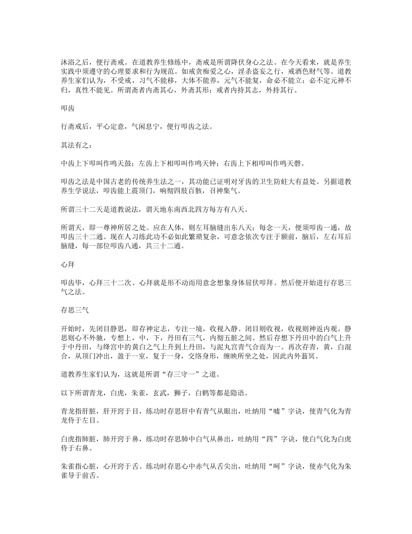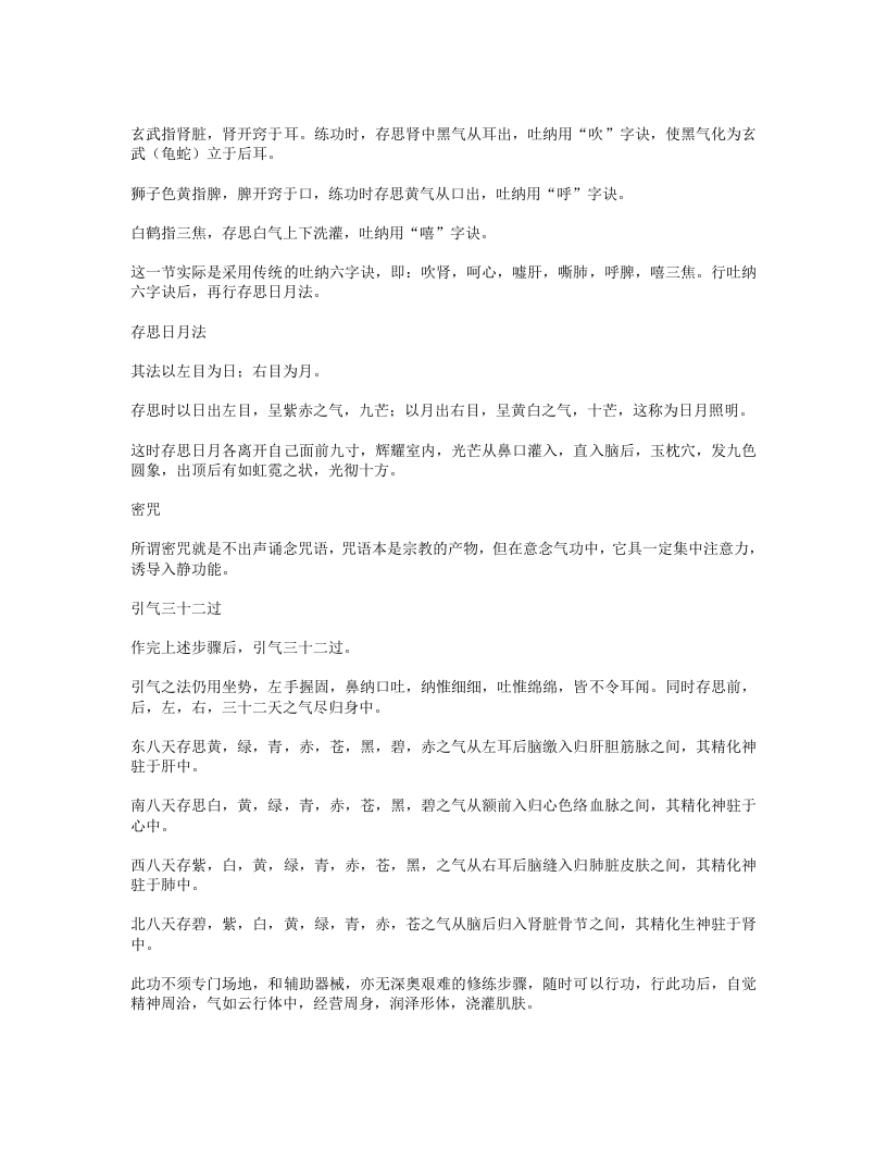 玄武指肾脏,肾开窍于耳。练功时,存思肾中黑气从耳出,吐纳用“吹”字诀,使黑气化为玄武(龟蛇)立于后耳。狮子色黄指脾,脾开窍于口,练功时存思黄气从口出,吐纳用“呼”字诀。白鹤指三焦,存思白气上下洗灌,吐纳用“嘻”字诀。这一节实际是采用传统的吐纳六字诀,即:吹肾,呵心,嘘肝,嘶肺,呼脾,嘻三焦。行吐纳六字诀后,再行存思日月法。存思日月法其法以左目为日:右目为月。存思时以日出左目,呈紫赤之气,九芒:以月出右目,呈黄白之气,十芒,这称为日月照明。这时存思日月各离开自己面前九寸,辉耀室内,光芒从鼻口灌入,直入脑后,玉枕穴,发九色圆象,出顶后有如虹霓之状,光彻十方。密咒所谓密咒就是不出声诵念咒语,咒语本是宗教的产物,但在意念气功中,它具一定集中注意力,诱导入静功能。引气三十二过作完上述步骤后,引气三十二过。引气之法仍用坐势,左手握固,鼻纳口吐,纳惟细细,吐惟绵绵,皆不令耳闻。同时存思前,后,左,右,三十二天之气尽归身中。东八天存思黄,绿,青,赤,苍,黑,碧,赤之气从左耳后脑缴入归肝胆筋脉之间,其精化神驻于肝中。南八天存思白,黄,绿,青,赤,苍,黑,碧之气从额前入归心色络血脉之间,其精化神驻于心中。西八天存紫,白,黄,绿,青,赤,苍,黑,之气从右耳后脑缝入归肺脏皮肤之间,其精化神驻于肺中。北八天存碧,紫,白,黄,绿,青,赤,苍之气从脑后归入肾脏骨节之间,其精化生神驻于肾中。此功不须专门场地,和辅助器械,亦无深奥艰难的修练步骤,随时可以行功,行此功后,自觉精神周洽,气如云行体中,经营周身,润泽形体,浇灌肌肤。