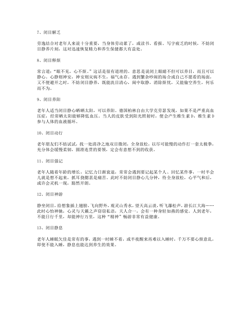 闭目养神是养神修性的一种简便易行而又收效明显的方法。祖国医学认为,神是人体生命活动和精神活动的总称,对身心健康关系重大。《黄帝内经》曰:“得神者昌,失神者亡。”可见神的充耗,关系到人的壮老:神的得失又关系到人的昌亡,人体五脏六腑的精气都上注于目。闭目可以养生,闭目养神对于中老年人以及终日劳心用脑或长期使用目力者,是大有裨益的。中老年人日常生活中的闭目养生法主要有以下13种:1、闭目养心:在日常诸事纷扰、头昏脑胀时,找一清静之地,正襟危坐,双目闭合,眼脸下沉,调匀呼吸,意守丹田。良久则头脑清醒,心平气和,心静如水,烦恼渐渐消失,进入静谧祥和状态,机体阴阳气血通达顺畅,心理平衡,情绪愉悦,头脑清晰,浑身轻松。2、闭目降气凡遇愤愤不平或遭受屈辱,于暴躁难捺之时,要理智地控制情绪,离开是非之地,闭目思量。同时用自己的双手食指轻轻压在眼脸上,微微揉搓,到眼珠发热发胀,便觉胸膛闷塞顿开,肝火胃气下降,躁怒平息,心情和缓。3、闭目行悦在忧郁悲伤、失望空虚、心烦意乱之时,退避静舍,闭目独坐,尽量默忆,想象以往得意欢愉之事,即会觉得心神平衡,悲伤烦乱之情就会逐渐消失。4、闭目卧思人有三种思维方式:第一为睁眼思维方式,第二为梦境思维方式,第三即是闭目思维方式。闭目思维是一种临界思维“现象”,即卧而不寐,闭目臆想联翩。在这种思维状态下,大脑排除了外界的干扰,又处于充血、充氧状态。如此,可促使大脑细胞的潜能最大限度地发挥作用,以提高思维的深度和广度。5、闭目消食吃完饭后闭目休息10~30分钟,再去睡午觉、散步或是做别的事情。这对肝脏的保养,尤其是对有肝病的人来说是非常必要的。人们吃完饭(尤其是午饭,因为吃的一般都比较多)后,体内的血液集中到消化道内参与食物消化,如果再行走、运动,血液就会有一部分流向手足,此时,流入肝脏的血流量就要减少到50%以上。如果肝脏处在供血量不足的情况下,正常的新陈代谢就会受到影响,从而导致对肝脏的损害。6、闭目赏乐你可以常常闭目听一些自己喜爱的音乐和戏曲。优美的旋律可增进大脑活动,调节中枢神经系统的功能,使人产生心旷神怡的感觉,对身体健康十分有益。