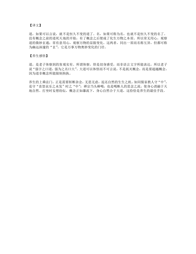 宇宙与生命之[道]一一养生之本据《太上老君说常清静经》载:[大道玄寂]无所不在,为[虚无之系,造化之根],是宇宙万物的本原与主宰者,天地、阴阳、四时、五行等无不由[大道]所化生。道的本原【原文】道可道,非常道①:名可名,非常名②。无名,天地之始:有名,万物之母③。故常无,欲以观其妙:常有,欲以观其徼④。此两者,同出而异名⑤,同谓之玄。玄之有玄⑥,众妙之门⑦。(《道德经》第一章)【注解】①道可道,非常道:第一个“道”为名词。《老子》的“道”论中,此“道”指世界的本体,是亘古不变的世界本原:第二个“道”为动词,用言语解说之意:常,恒久不变。作为欲走万物本原的大道,具有时间与空间的整体性,对道的概念思维无法代替对道的整体体悟,所以道无法解释和论证。人类本来就是道的产物,如果站在自我的角度去谈天论道,实际上已经造成了主客观的对立,如此认识道,必定不能合于道。整句是说:道作为世界的本原是不可言说的,如果道可以用语言讲解,就己经不是那个永恒不变的大道了,②名可名,非常名:第一个“名”为名词,意为概念、名词:第二个“名”为动词,称谓,叫得出之意。意为如果“名”可以叫得出,就不是恒久不变的概念了。③无名,天地之始:有名,万物之母:没有任何该男的原始状态,就是天地形成的初始:已形成有概念的物质,就是生育万物之母。《老子》有“道生一,一生二,二生三,三生万物”之句,在最初道的阶段不可言说,没有概念,是万物的开始,以后混元一气逐渐分化、研进,便有了阴阳、万物的概念,万物也就由此得以化生了。④故常无,欲以观其妙:常有,欲以观其徼(jiao):常无,以“无”的境界运用意识,就是“无所用心”、“无为”之意,心与道的虚无合一。妙,王弼注“妙者微之极也”,荀(xu)悦《申鉴》:“理微谓之妙也。”意为用无为的心态去观察微妙之道。常有,有为,人为地调整意识,用各种方法。徼,后世借为“皎”,光明,指事理的显明昭彰。意为用有为的方法去观察事物的显明昭彰之理。⑤同出而异名:韩《解老》:“始,谓之出。”所以出油开端、始萌之意。意为两者都是道这个本原的产物。⑥玄:《说文》:“玄,幽远也。”又玄,深黑色。用玄形容道的本性,幽远深邃难以窥测度量。⑦众妙之门:门,门径,必经路径。所谓万事万物的生化转变是奥妙难测现象的必经之路。