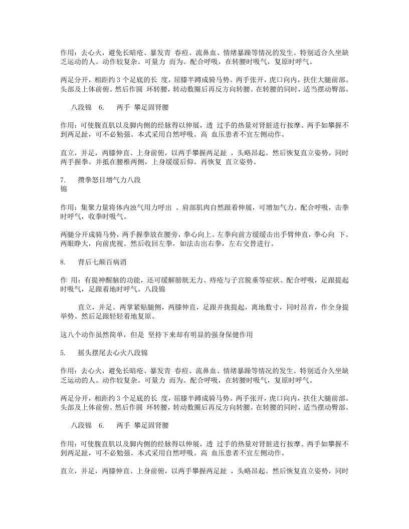 两手握拳。并抵在腰椎两侧,上身缓缓后仰。再恢复直立姿势。7.攒拳怒目增气力八段锦作用:集聚力量将体内浊气用力呼出。肩部肌肉自然跟着伸展,可增加气力。配合呼吸,击拳时呼气,收拳时吸气。两腿分开成骑马势,两手握拳放在腰旁,拳心向上。左拳向前方缓缓击出手臂伸直,拳心向下。两眼睁大,向前虎视。然后收回左拳,如法击出右拳,左右交替进行。8.背后七颠百病消作用:有提神醒脑的功能,还可缓解膀胱无力、痔疮与子宫脱垂等症状。配合呼吸,足跟提起时吸气,足跟着地时呼气。八段锦直立,并足。两掌紧贴腿侧,两膝伸直,足跟并拢提起,离地数寸,同时昂首,作全身提举势。然后足跟轻轻着地复原。这八个动作虽然简单,但是坚持下来却有明显的强身保健作用!