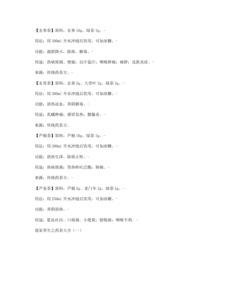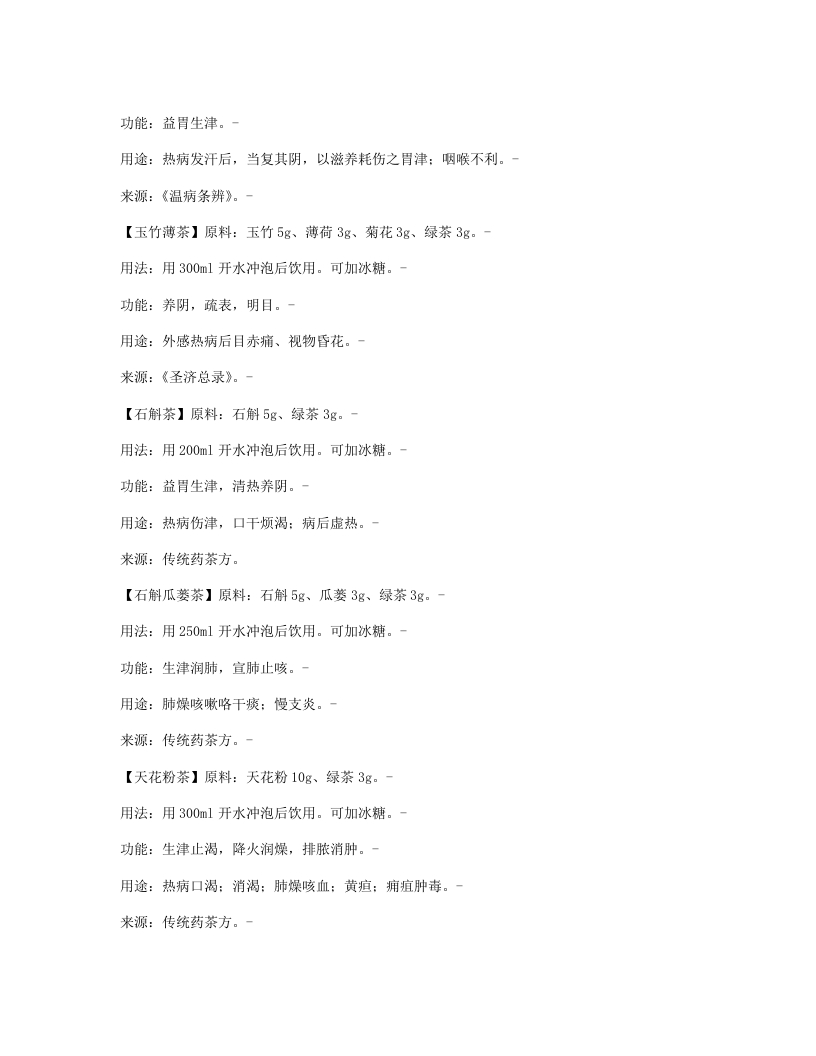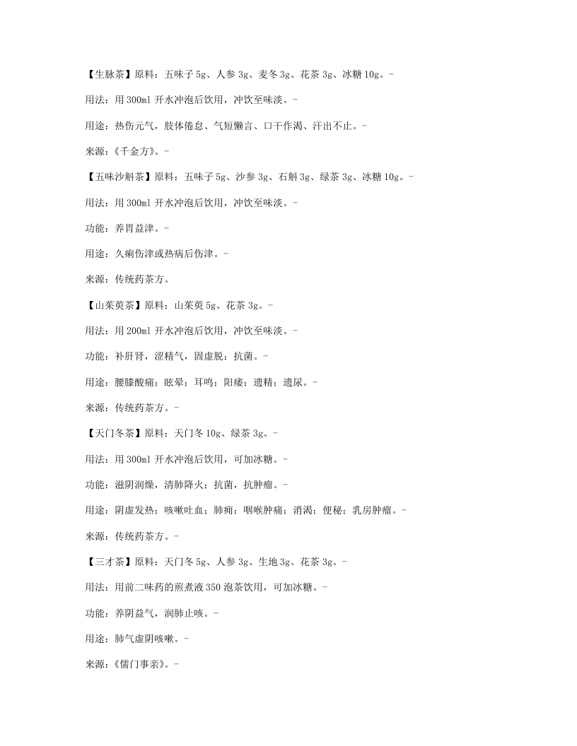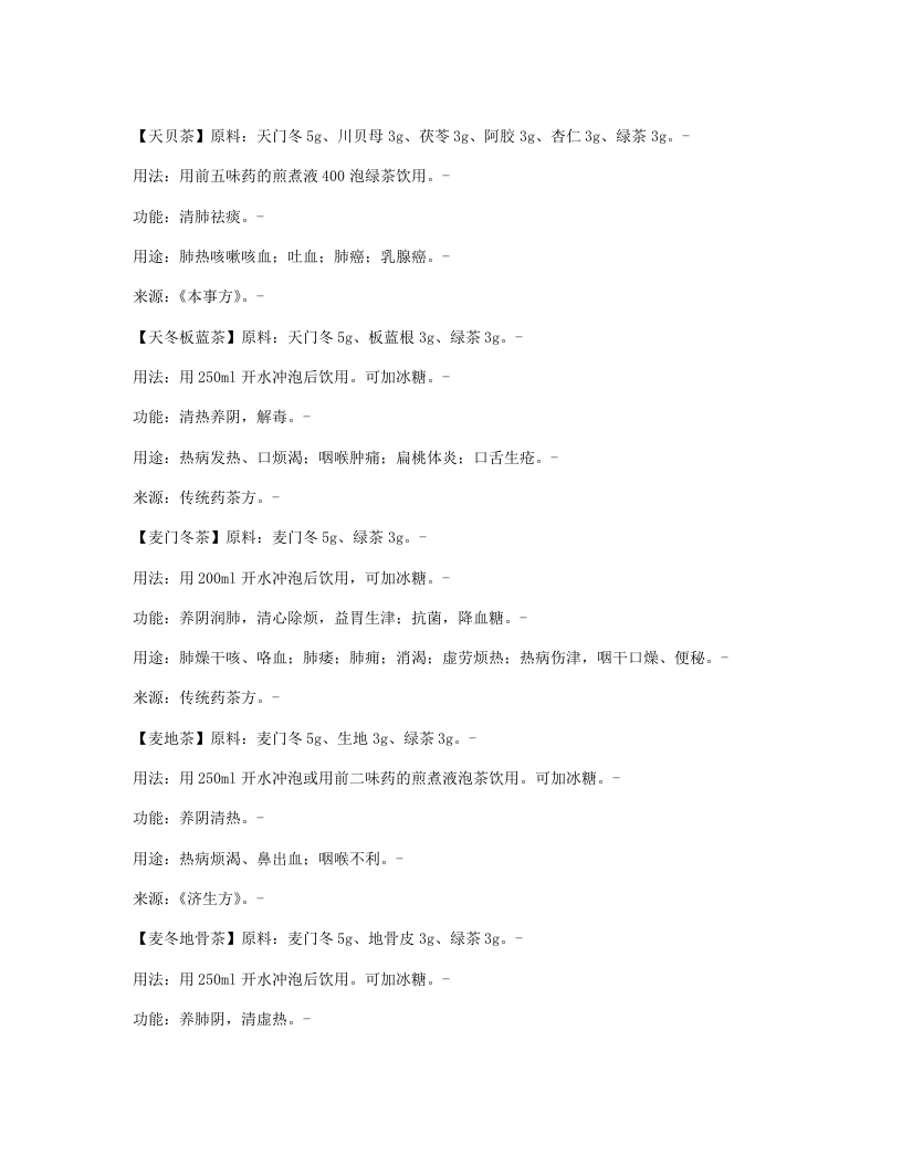 【天贝茶】原料:天门冬5g、川贝母3g、茯苓3g、阿胶3g、杏仁3g、绿茶3g。用法:用前五味药的煎煮液400泡绿茶饮用。-功能:清肺祛痰。一用途:肺热咳嗽咳血:吐血:肺癌:乳腺癌。来源:《本事方》。一【天冬板蓝茶】原料:天门冬5g、板蓝根3g、绿茶3g。用法:用250ml开水冲泡后饮用。可加冰糖。-功能:清热养阴,解毒。一用途:热病发热、口烦渴:咽喉肿痛:扁桃体炎:口舌生疮。来源:传统药茶方。【麦门冬茶】原料:麦门冬5g、绿茶3g。用法:用200ml开水冲泡后饮用,可加冰糖。-功能:养阴润肺,清心除烦,益胃生津:抗菌,降血糖。一用途:肺燥干咳、咯血:肺痿:肺痈:消褐:虚劳烦热:热病伤津,咽干口燥、便秘。一来源:传统药茶方。【麦地茶】原料:麦门冬5g、生地3g、绿茶3g。-用法:用250l开水冲泡或用前二味药的煎煮液泡茶饮用。可加冰糖。-功能:养阴清热。一用途:热病烦渴、鼻出血:咽喉不利。一来源:《济生方》。【麦冬地骨茶】原料:麦门冬5g、地骨皮3g、绿茶3g。用法:用250m1开水冲泡后饮用。可加冰糖。-功能:养肺阴,清虚热。