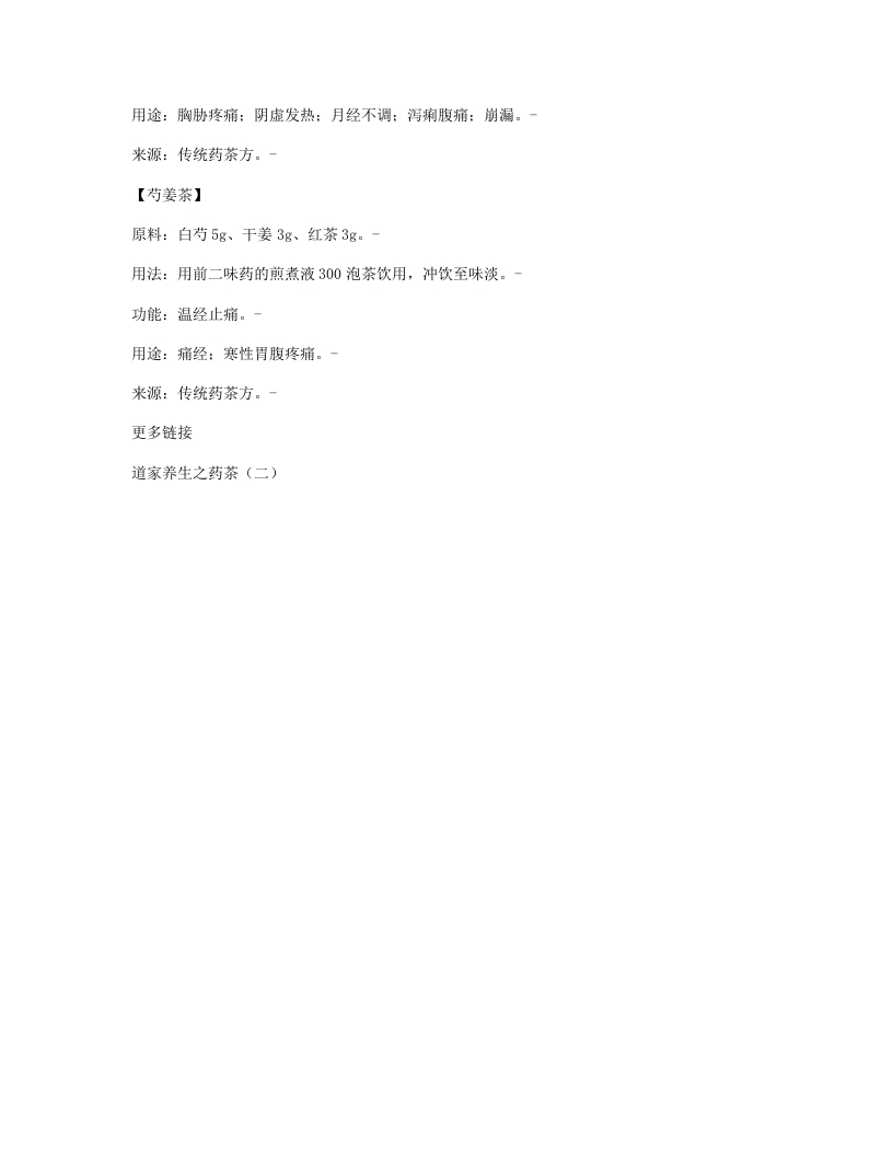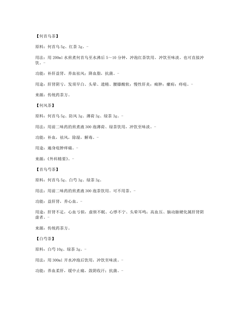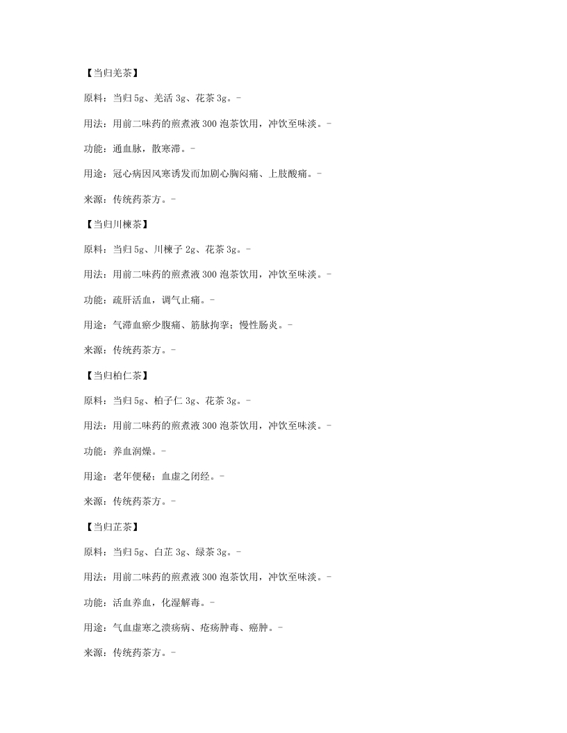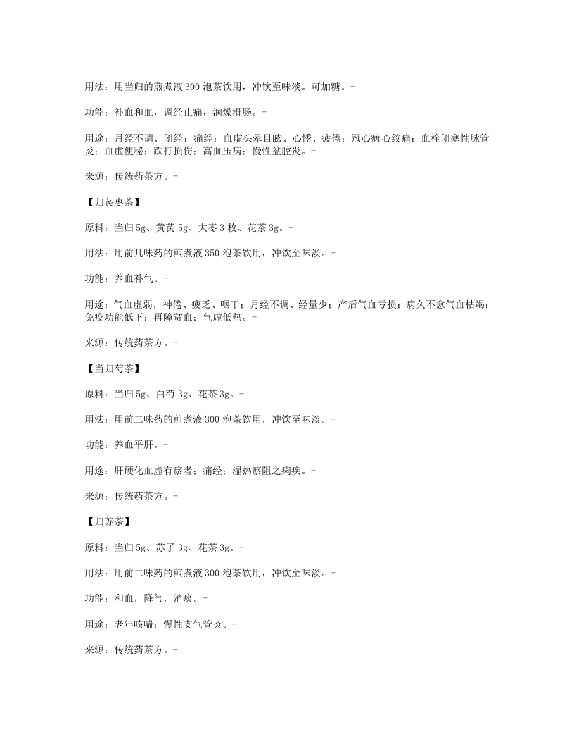 原料:生地5g、麦冬3g、天冬3g、绿茶3g。用法:用250ml开水冲泡后饮用,冲饮至味淡。-功能:清热生津。一用途:热病后伤津,口烦渴、汗出:消渴。一来源:传统药茶方。一【地苍茶】原料:生地5g、苍术3g、绿茶3g。-用法:用前二味药的煎煮液300泡茶饮用,冲饮至味淡。一功能:燥湿养阴,敛脾精。用途:慢性肾炎肾病己久,肾阴虚而湿邪阻滞不化,出现阴虚挟湿的症状,腰膝酸软、口渴咽干、盗汗、潮热、苔黄厚腻、水肿、蛋白尿:慢性湿疹。一【生地英茶】原料:生地5g、蒲公英3g、绿茶3g。用法:用前二味药的煎煮液300泡茶饮用,冲饮至味淡。一功能:凉血解毒,散结除痹。一用途:风湿性关节炎,关节红肿热痛:痈疮肿毒。来源:传统药茶方。一【生地豆卷茶】原料:生地5g、豆卷3g、绿茶3g。-用法:用前二味药的煎煮液300泡茶饮用,冲饮至味淡。一功能:通达宣利,养阴解表。用途:湿热入营血而致身热、发红疹、烦燥不安:乳痈初起:胃热烦渴。一来源:传统药茶方。-【当归茶】原料:当归10g、红茶3g。