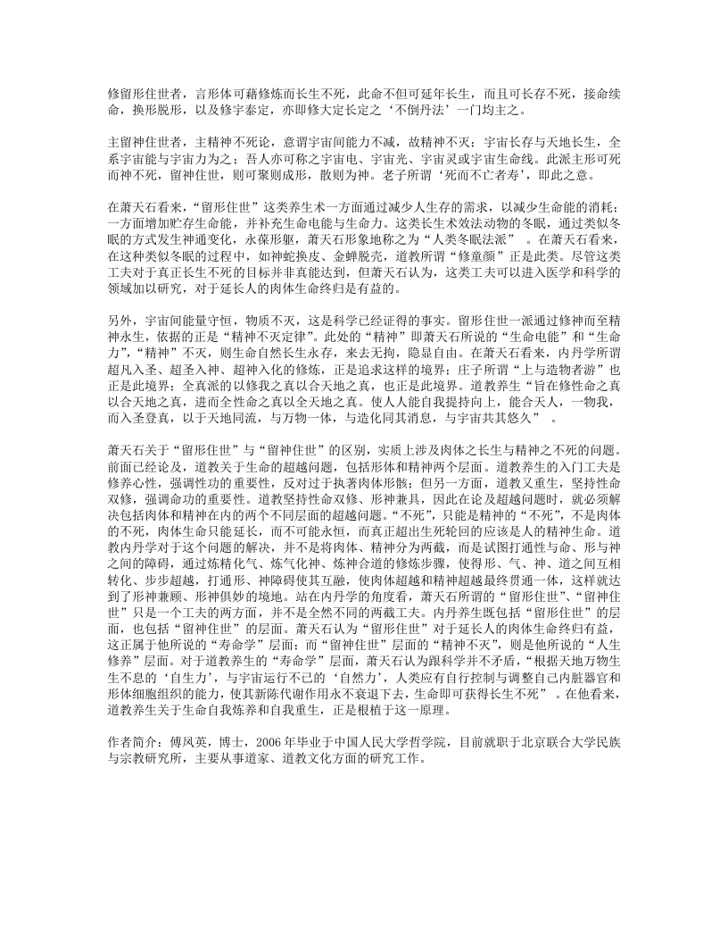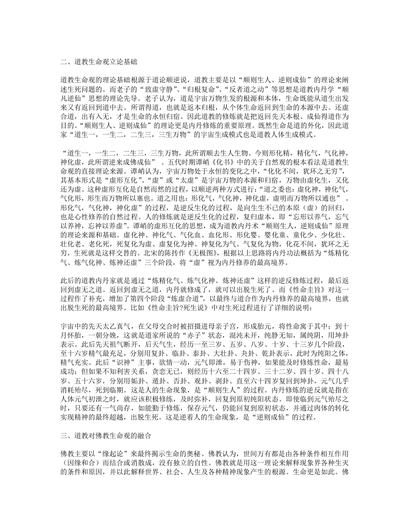 教认为,生命的起灭源于“阿赖耶识”种子,人的生死都是由“阿赖耶识”主宰。“此有故彼有,此生故彼生:此无故彼无,此灭故彼灭”。道教把佛教的生命观也拉入到自己的理论框架中,做了道教式的分析。比如《性命圭旨》中就有这样的分析:人生之初,游荡于轮回流转中的“阿赖耶识”因一丝妄念,和父母的血气结合,在母腹中形成胎元,转为人身:人死之时,“阿赖耶识”依人所作善恶业的不同,脱离人身,继续在“三界”和“六道”中轮回。“生则是第八识神阿赖耶主之,死亦是第八识神阿赖耶主之。投胎则此识先来,舍身则此识后去,故曰:‘此后来先作主公’”,那么佛教的修炼就是使得“阿赖耶识”脱离生死轮回,永恒存在。由此可知,佛教所谓的“不死”,不是指肉体的不死,而是指“阿赖耶识”种子的不生不灭,此种子和其他宗教里所谓的‘灵魂’似乎有点相似。但是,依据佛教教义,这个再生的东西并不是灵魂,而是前生行为(业)累积产生的效应(果),佛教其实是从本质上否定灵魂的存在的。佛教唯识把人的意识分为眼识、耳识、鼻识、舌识、身识、意识、末那识、阿赖耶识“八识”,道教内丹家也借此表示修丹中元神、识神之间的关系。佛教的前六识都属内丹的识神范围:内丹所说的“元神”相当于佛教唯识学指的“阿赖耶识”,内丹家又把它叫做“元性”、“先天之性”、“一点灵明”、“主人公”等。道教内丹注重人体肉身的修炼,认为这是修炼的基础,而不是视其为随时可弃的“臭皮囊”。而是通过对人体自身的开发和锻炼,“以天命元神而战退无明业识”,获得第九识“白净识”(内丹称为“阳神”)。因此但凡内丹家所指的炼神,即指炼“元神”。“阳神”是“元神”的凝聚体,可以脱离人身存在,具有突破时空障碍的巨大神通。由此可知,道家内丹所谓的“不死”,同样不是指肉体的不死,而是指“元神”或“阳神”而言。应该说肉体生命只能延长,而不可能永恒,而真正超出生死轮回的是人的精神生命。由此可知,佛道两家在某种程度上都是“返本还源”的修养功夫,也就是谋求从我们这个有限生命返还到无限的道体本性,从而使生命获得永恒和超越。四、道教生命观的实质佛教认为“生”是人生痛苦的根源,“死”才可以得到最后的解脱,所以佛家力求解脱生死,其人生修养的最高境界是成佛。而道教生命观的实质是追求肉体长生和精神不死的统一,不是以“死”来追求“生”的解脱,其成就生死、解脱生死之道,在于超越生死,即生而超生,即死而超死,即世间而超世间,不主入世,也不主出世,即入即出,即出即入,所以不离世间而能解脱世间,即所谓“不离日用常行内,直到先天未画前”。道教内丹学从人的肉体入手,探索生命超越的根本宗旨,从生命层面进入精神层面,最终通过精神与肉体的统一,以逆向回归的方式来契证原初的大道。内丹学以达到人和宇宙的自然本性相契合、人同自然一体化为最高目的,将人体和宇宙的内在节律相调谐,使自己的身心和宇宙相通,返回先天的初始状态,这样才能同宇宙的自然本性契合,进入道的境界。因此,以术证道的实践精神,是道教内丹的一个很重要的内在特征。对于道教内丹的“长生”和“不死”问题,萧天石先生曾作过深入探讨。他认为,尽管道教内丹首先肯定人生可以长生久视,但道教的上乘境界,不只限于如何能“长生久视”,而在于如何能“圣化神功”。也就是说,道教养生的工夫,是在“超凡入圣”之上,还有“超圣入神”“超神入化”的工夫,即与道合一的“真人境界”,萧天石先生称之为“道世界”,认为这是道教养生学的最高境界。萧天石把道教内丹学的长生术分为“留形住世”和“留神住世”两个层面:
