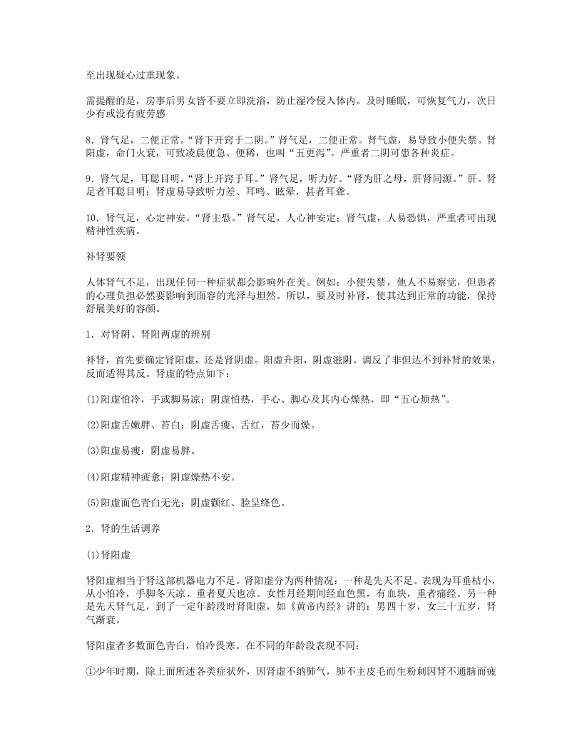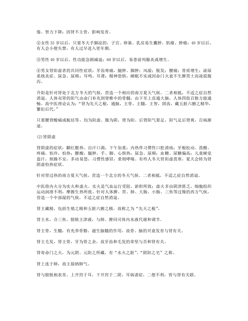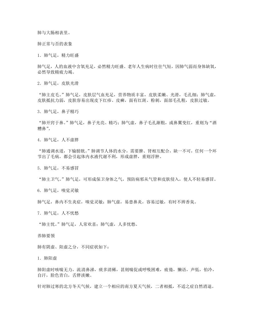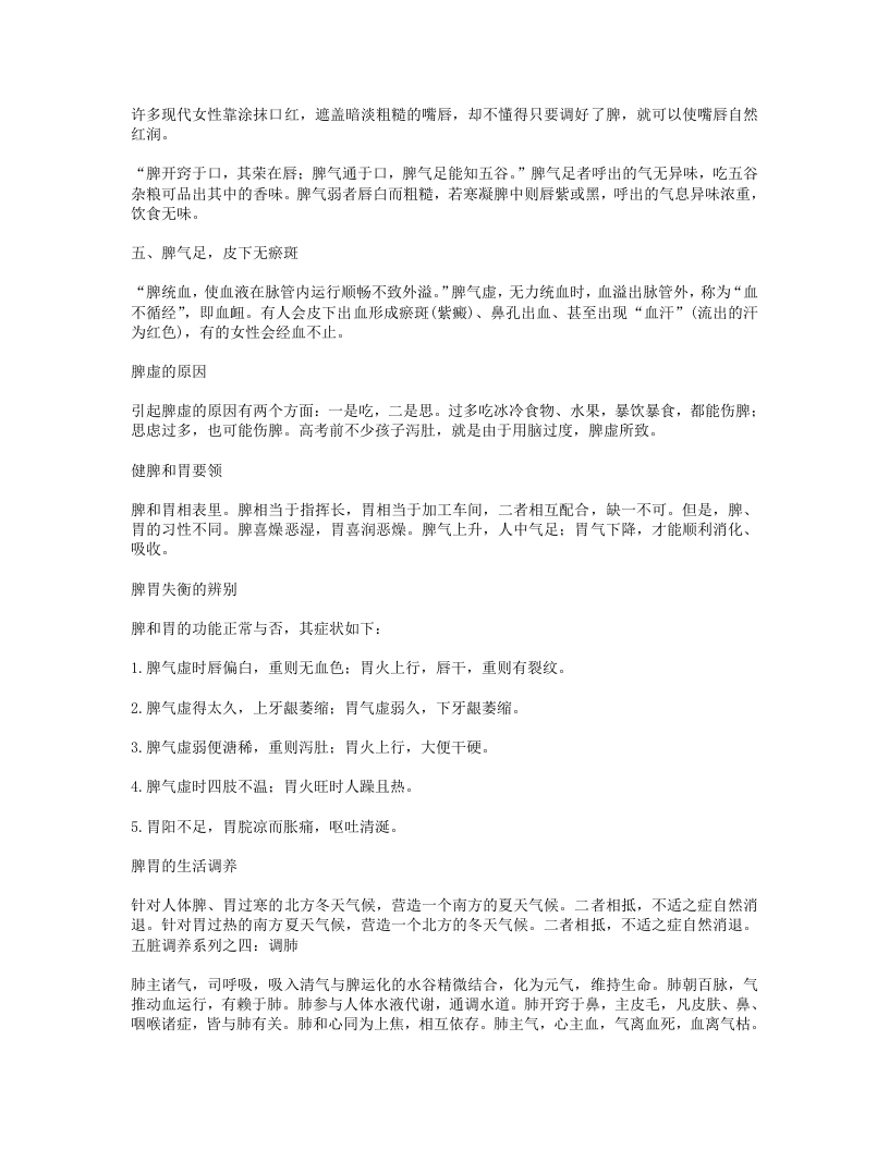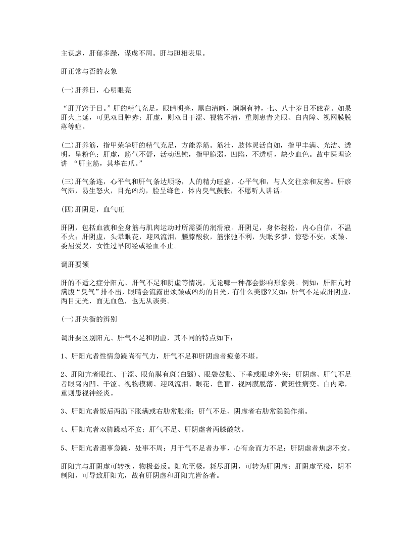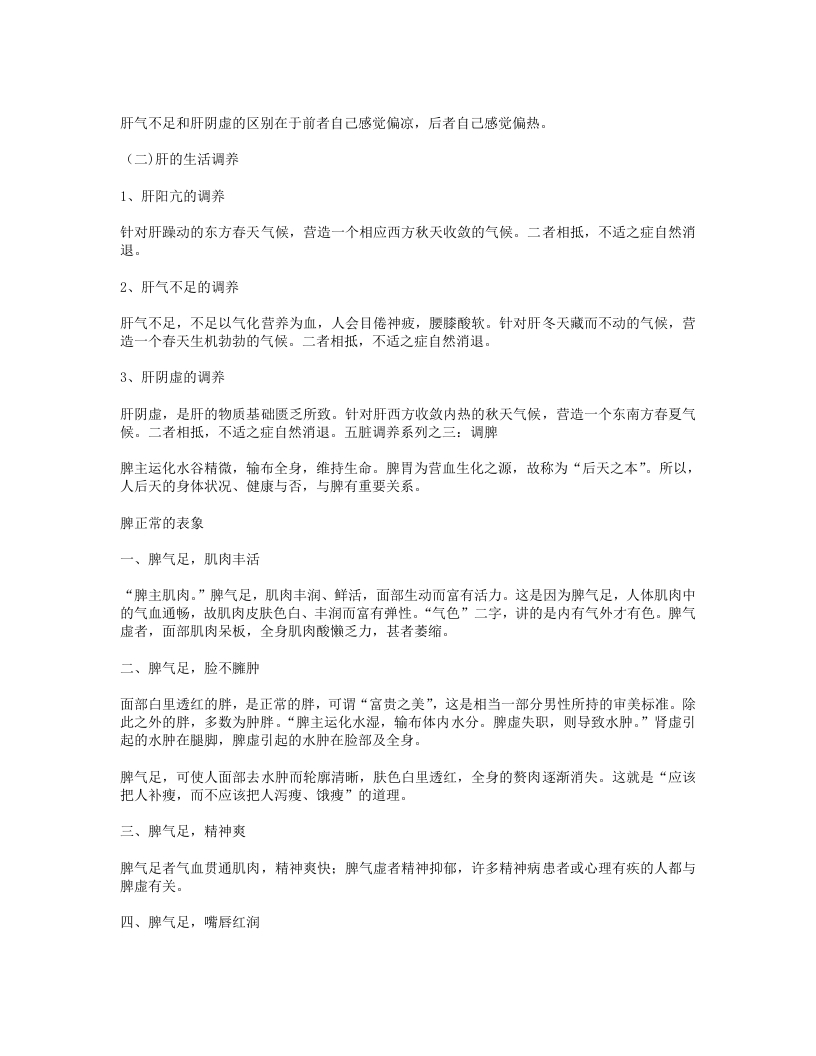肝气不足和肝阴虚的区别在于前者自己感觉偏凉,后者自己感觉偏热。(二)肝的生活调养1、肝阳亢的调养针对肝躁动的东方春天气候,营造一个相应西方秋天收敛的气候。二者相抵,不适之症自然消退。2、肝气不足的调养肝气不足,不足以气化营养为血,人会目倦神疲,腰膝酸软。针对肝冬天藏而不动的气候,营造一个春天生机勃勃的气候。二者相抵,不适之症自然消退。3、肝阴虚的调养肝阴虚,是肝的物质基础匮乏所致。针对肝西方收敛内热的秋天气候,营造一个东南方春夏气候。二者相抵,不适之症自然消退。五脏调养系列之三:调脾脾主运化水谷精微,输布全身,维持生命。脾胃为营血生化之源,故称为“后天之本”。所以,人后天的身体状况、健康与否,与脾有重要关系。脾正常的表象一、脾气足,肌肉丰活“脾主肌肉。”脾气足,肌肉丰润、鲜活,面部生动而富有活力。这是因为脾气足,人体肌肉中的气血通畅,故肌肉皮肤色白、丰润而富有弹性。“气色”二字,讲的是内有气外才有色。脾气虚者,面部肌肉呆板,全身肌肉酸懒乏力,甚者萎缩。二、脾气足,脸不臃肿面部白里透红的胖,是正常的胖,可谓“富贵之美”,这是相当一部分男性所持的审美标准。除此之外的胖,多数为肿胖。“脾主运化水湿,输布体内水分。脾虚失职,则导致水肿。”肾虚引起的水肿在腿脚,脾虚引起的水肿在脸部及全身。脾气足,可使人面部去水肿而轮廓清晰,肤色白里透红,全身的赘肉逐渐消失。这就是“应该把人补瘦,而不应该把人泻瘦、饿瘦”的道理。三、脾气足,精神爽脾气足者气血贯通肌肉,精神爽快:脾气虚者精神抑郁,许多精神病患者或心理有疾的人都与脾虚有关。四、脾气足,嘴唇红润