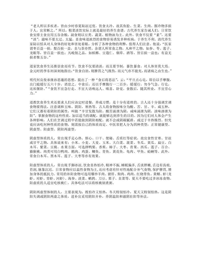道教养生方法是道教徒在长期的理论和实践的探索过程中形成的养生方法体系。道教养生方法在历史上流派和类别甚多,但其行功方法,主要包括四个方面的内容,一是气功,二是服食,三是房中,四是摄养。这四个方面构成道教养生方法的核心内容。1,道教药饵服食与饮食养生(1)道教药饵服食服食是道教养生术中的重要内容。其目的是通过服用特定的食物和药物,来达到长生久驻的目的。道教服食,包含养生和成仙两大内涵,照葛洪的看法,服食药物分草木之药和金石之药。草木之药的功效在于“救亏缺”,亦即治病补养,而金石之药的功效在于不死成仙。又照《抱朴子》和《博物志》所引《神农四经》的说法,服食的药饵分为上、中、下三等,上药令人身安命延,中药养性,下药治病。所谓“救亏缺”,意在补养元气、滋阴壮阳、调利五脏、和荣精血以及治病疗疾。所谓服食金丹羽化登仙是早期道教的炼养之术,在实践中逐渐被道教养生家所抛弃。道教养生家着重研究那些有明显补养功效的药物,从而形成了独特的道教服食养生学。如《太玄宝典》论茯苓之制法服法:“服之得法,能生神明,轻便四肢。茯苓末之烂,研青松叶水和煮之,惟茯苓碧绿色透为度,暴干以末,蜜和丸,日三服如橡子大,清旦水下。通神不老不饥,辟谷去五味。服之三百日,体生青毛,无寒暑。更加梨子,无暑,加浮萍,无寒矣。”该书还指出:柏木仁可以秘精不泄,椒子可以通神明目,甘菊可以生精益髓,地黄可以荣血脉泽肢体。并皆有配方与服法。(2)道教饮食养生俗语云:“药补不如食补。”说明饮食营养是身健体康的根本。在古代养生家看来:“毒药攻邪,五谷为养,五果为助,五畜为益,五菜为充,气味合而服之,以补益精气。”这是说,药物的作用只在“攻邪”,而人的机体要得到补益,精气要获得充实,必须服用“五谷”(粳米、麦、小豆、大豆、黄黍)、“五果”(桃、李、杏、栗、枣)“五畜”(牛、羊、豕、鸡、犬)、“五菜”(葵、藿、薤、葱、韭)。金元时期的医学家李东垣认为,人的健康长寿全在脾胃健旺,元气没有损耗,而达到这一点的根本就在于胃对饮食进行消化、吸收,把营养物补充进人体。所以,人们必须不断地摄取营养以求健康长寿。孙思邈指出:“安生之本,必资于食”:“不知食宜者,不足以生存也。”中国饮食养生术首先要求饮食的清淡。《黄帝内经》中就说过:“膏粱之变,足生大疗,受如持虚。”意思是那些长期以鱼肉莹腥为食者、贪图膏粱厚味者,足以在身上发出大疗疮来。他们生病就好像用空的容器接受东西一样十分容易。古代帝王多沉迷于山珍海味、花天酒地的生活,但长寿者又有几人?倒是深山古刹修炼的道士、幽静村庄里勤奋的农夫多获高寿。古代养生家指出:“人们嗜食肥美厚味,容易产生半身不遂、痿厥、气精喘逆、痈疮等疾病。”孙思邈指出: