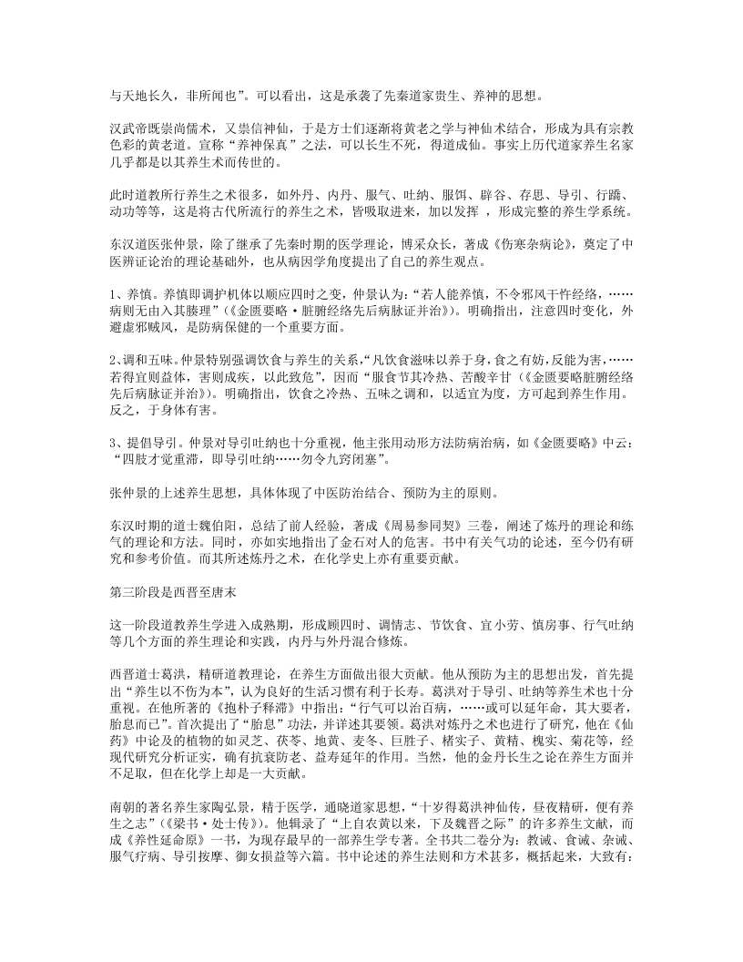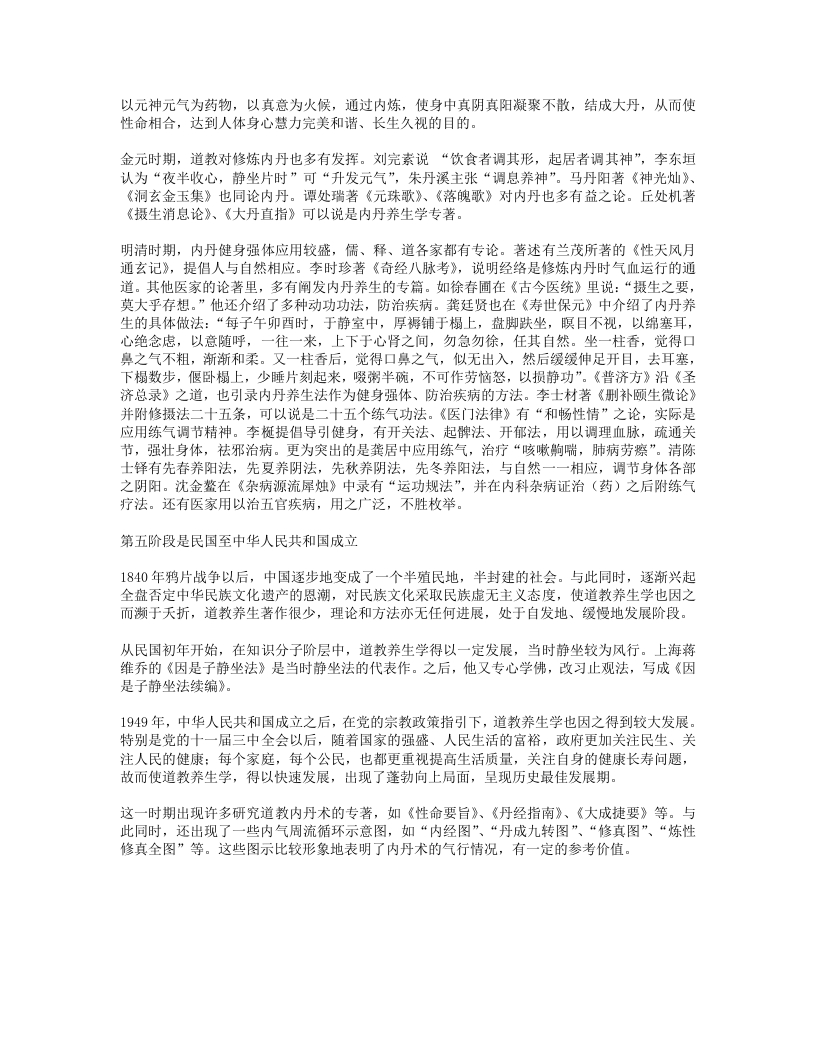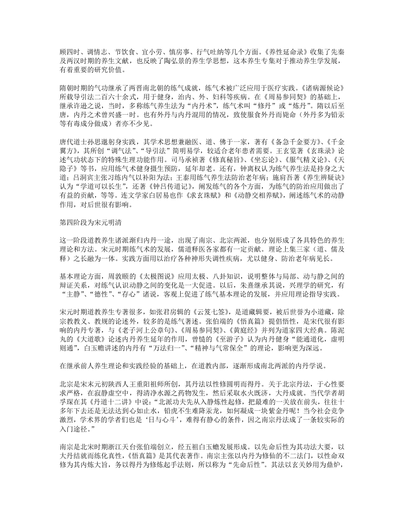 顾四时、调情志、节饮食、宜小劳、慎房事、行气吐纳等几个方面。《养性延命录》收集了先秦及两汉时期的养生文献,也反映了陶弘景的养生学思想,这本养生专集对于推动养生学发展,有着重要的研究价值。隋朝时期的气功继承了两晋南北朝的练气成就,练气术被广泛应用于医疗实践。《诸病源候论》所载导引法二百六十余式,用于健身,治内、外、妇科等疾病。在《周易参同契》的基础上,继承许逊之说,当时,多称练气养生法为“内丹术”,练气术叫“修丹”或“炼丹”。隋以后至唐,内丹之术曾兴盛一时。也有外丹与内丹混用的情况,致使服食外丹而毙命(外丹多为铅汞等有毒成分做成)者亦不少见。唐代道士孙思邈躬身实践,其学术思想兼融医、道、佛于一家,著有《备急千金要方》、《千金翼方》,其所创“调气法”、“导引法”简明易学,较适合老年患者需要。王玄览著《玄珠录》论述气功状态下的特殊生理功能作用。司马承祯著《修真秘旨》、《坐忘论》、《服气精义论》、《天隐子》等书,应用练气术健身摄生预防,延年却老。还有,钟离权认为练气养生法是持身之大道:吕洞宾主张习练内气以补阳为法:王泰用练气养生法防治老年病:施肩吾著《养生辨疑诀》认为“学道可以长生”,还著《钟吕传道记》,阐发练气的各个方面,为练气的防治应用做出了有益的贡献,等等。连文学家白居易也作《求玄珠赋》和《动静交相养赋》,阐述练气术的动静作用,对后世很有影响。第四阶段为宋元明清这一阶段道教养生诸派渐归内丹一途,出现了南宗、北宗两派,也分别形成了各具特色的养生理论和方法。宋元时期练气术的发展,儒道释医各家都有一定贡献。理论上集三家(道、儒及释)之长融为一体。实践方面用以治疗各种神形失调性疾病,尤以健身、防治老年病见长基本理论方面,周敦颐的《太极图说》应用太极、八卦知识,说明整体与局部、动与静之间的辩证关系,对练气认识动静之间的变化是一大促进。以后,朱熹继承其说,兴理学的研究,有“主静”、“德性”、“存心”诸说,客观上促进了练气基本理论的发展,并应用理论指导实践。宋元时期道教养生专著很多,如张君房辑的《云笈七签》,是道藏辑要,被后世誉为小道藏,除宗教教义、教规的论述外,较多的是练气著述。张伯端的《悟真篇》提倡悟性,是宋代很有影响的内丹专著,与《老子河上公章句》、《周易参同契》、《黄庭经》并列为道家四大经典。陈泥丸的《大道歌》论述内丹养生延年的作用,曾慥的《至游子》认为内丹健身“能通道化,虚明则通”,白玉赡讲述的内丹有“万法归一”、“精神与气常保全”的理论,影响更为深远。在继承前人养生理论和实践经验的基础上,在道教内部,逐渐形成南北两派的内丹学说。北宗是宋末元初陕西人王重阳祖师所创,其丹法以性修圆明而得丹。关于北宗丹法,于心性要求严格,在寂静虚空中,得清净水源之药物发生,然后采取水火既济,大丹成就。当代学者胡孚琛在其《丹道十二讲》中说:“北派功夫先从入静炼性起修,把最难的一关放在前头,往往十多年下去还是无法达到心如止水,铅虎不生难降汞龙,如何凝成一块紫金丹呢!当今社会竞争激烈,学术界的学者们也是‘日与心斗’,难得有静心的条件,因之南宗丹法成了一条较实际的入门途径。”南宗是北宋时期浙江天台张伯端创立,经五祖白玉蟾发展形成。以先命后性为其功法大要,以大丹结就而练化真性,《悟真篇》是其代表著作。南宗主张以内丹为修仙的不二法门,以性命双修为其内炼大旨,务以得丹为修炼起手法则,所以称为“先命后性”。其法以玄关妙用为鼎炉,