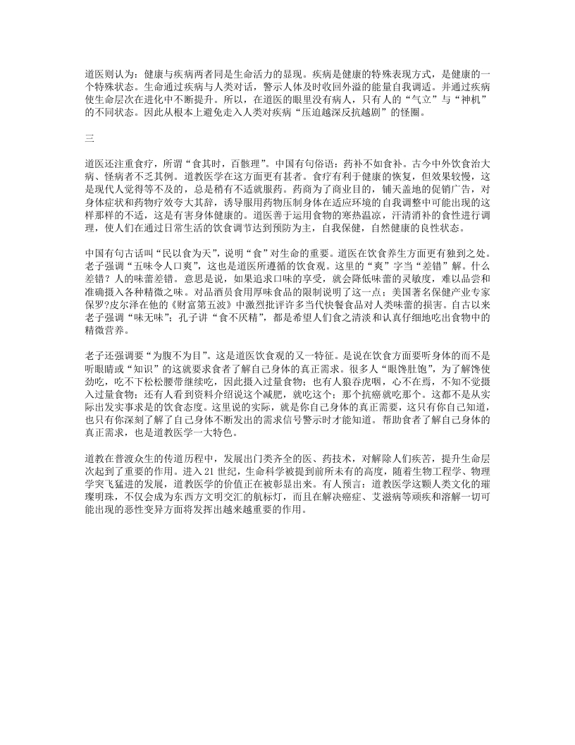 道教医学的形成与发展是以其对生命和宇宙的本质认识为基础的。认为人与天地万物同源于气。注重对“上药三品,神与气精”的把握。强调“不治己病治未病”,要求为医者“不知年之所加,气之盛衰,虚实之所起,不可为工”和“审查病机,勿失气宜”。并把修练内丹的成就用于诊治疾病,从而形成了庞大复杂的道教医学体系。道医理论主要由两大部分组成:一是医学理论,包括“精、气、神理论”、“经络理论”和“脏腑理论”,其中以“精、气、神理论”最为突出。二是丹道理论,包括“丹道”理论派生出来的“性命双修”理论、“后天返先天”理论、外丹制药技术理论等。共同构成道医祛病养生的理论基础。道医的诊治始终不离“一阴一阳谓之道”范畴,一方面,在“气”位上,把阴阳之气的“开”、“合”、“枢”的调节与和谐作为入手处。尊重人体自身的自治机制,“寒者热之,热者寒之,审其阴阳,以别刚柔,阳病治阴,阴病治阳,定其血气,各守其乡,血实宜决之,气虚宜擎引之”不时地调整机体气机,帮助其恢复自治的能力:而另一方面,在“神”位上,从阴阳未分处下手,直接进行灵性的调整,解除“因果链”对健康状态的影响,使生命层次得到提升。这才是道医无为而治的精妙之处。在入手处,道医始终把疾病与健康放在天地的大系统中整体考虑,遵循“审查病机,勿失气宜”的原则。运用道医技术使人体的气机的“生、长、收、藏”循行无滞,与时偕进,疾病自然不复存在。在气机调节的“开、合、枢”方面,更强调“枢”的作用,枢不灵则开合不利:在“生、长、收、藏”的四种状态中更注重“藏”的功用,藏不强则生长不壮。在“究竞”位,道医注重的则是心灵的洗涤。通过忏悔,通过守一、内视、存思、存神、行气、胎息、导引、按摩、辟谷、服食、房中术、调摄、外丹术、内丹术等措施。借助身体“练精化气,练气化神,练神还虚”,从而达到康者健,健者寿,寿者仙的境界。二实际上,道医真正注重的不是治病,而是养生。养生就是对生命的滋养。涉及养生的机制也包含了两方面的理论,一方面是涉及导致人体出现疾病状况的原因、机制及其过程的理论:另一方面是涉及消除导致人体疾病衰老死亡的原因,延缓和制止衰老死亡过程的方法及理论。其着眼点是正向的,是立足于人体内在的“精气神”及其在宇宙气运构架中的关系,对待疾病的态度只是作为生命动态的一种辩证加以考虑。长期以来,尤其是进入现代医学时代以来,疾病与人类展开了游击战术。简单的疾病被治愈,然后就会产生困难的疾病。你治好一种疾病,另外一种就会进来,而比第一个来的更复杂。第一种是身体的自然反应,第二个则是身体不自然的异常的反应。你压制了第二个。第三个就会出现,而第三个就会更难对付…就这样继续下去。目前癌症是最难对付的,如果癌症被压制住了,那么更困难的疾病将会被生物体制造出来…