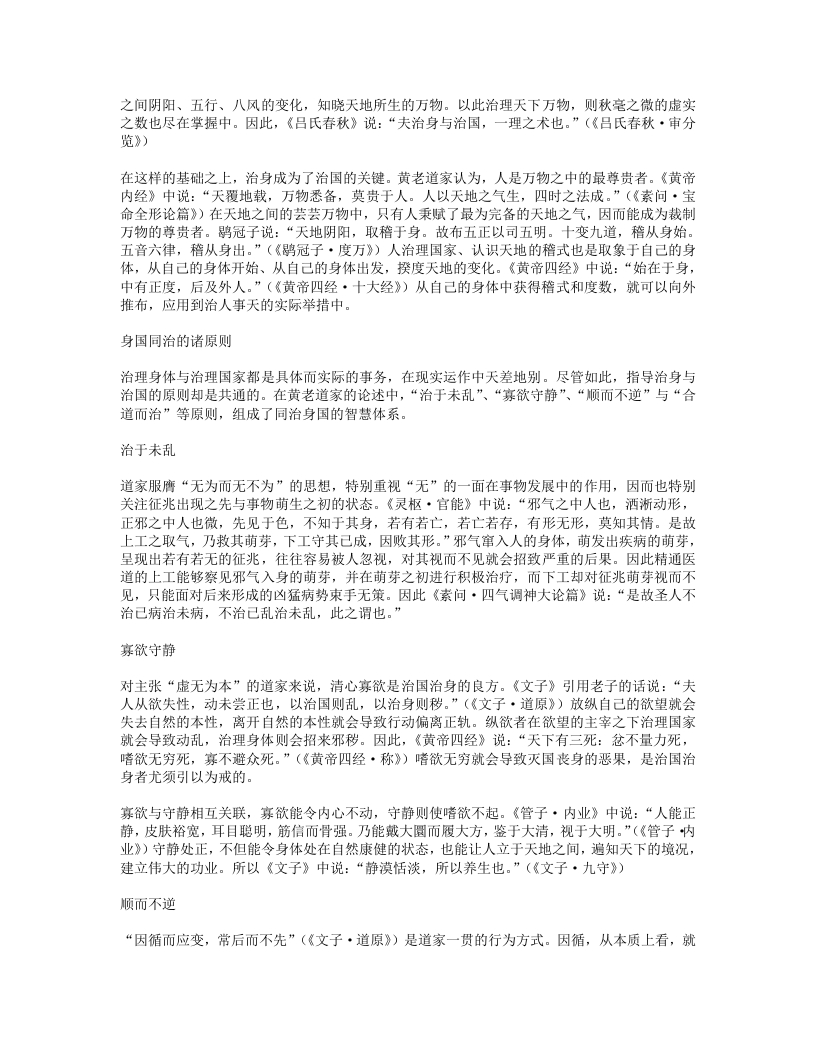 是顺应事物自然本性和发展趋势。在治国治身的实践中,顺应民众和身体之自然,是特别重要的原则。岐伯说:“夫治与民,自治,治彼与治此,治小与治大,治国与治家,未有逆而能治之也,夫惟顺而己矣。顺者,非独阴阳脉,论气之逆顺也,百姓人民,皆欲顺其志也。”(《灵枢师传》)在岐伯看来,无论是治理自身还是治理民众,无论是治国还是治家,都必须顺应治理的对象,切不可倒行逆施。对于治身而言,需要顺应经脉的阴阳、气行的逆顺:对于治国而言,则要顺应民众的志意,不能独断专行。合道而治在万物背后发现大道,并最终与道相合,是道家最高的理想。道是产生万物的本原,也是作用于万物的规律。合于大道,并以道来作为治国治身的指导,是道家的最终门径。《灵枢·外揣》中记载了黄帝向岐伯请问九针之道的故事,黄帝认为内容丰富的九针之学其实是可以“浑束为一”、“一以贯之”的。这一观点得到了岐伯的肯定,岐伯并点破了治身之针道与治国之政道能够一以贯之的关窍。无论是针道或是治国之道,最终都是大道的示现,要靠大道的作用,才能实现“小大深浅,杂合而为一”,殊途同归,最终都回归到大道之中。所以文子说:“故圣人持养其神,和弱其气,平夷其形,而与道浮沉,如此万物之化,无不偶也,百事之变,无不应也。”(《文子·九守》)圣人修持自己,逐渐达到与道浮沉的境界并合道而治,就能与道一起观察万事万物的变化发展,并与一切变化相偶相应,实现妥贴而有效的治理。至治的境界在黄老道家那里,治国治身的最终目标是达到一种极为圆满的境界,即“至治”。《黄帝内经》中描述了两种“至治”。第一种“至治”是治理身体的最高境界:“察其所痛,以知其应,有余不足,当补则补,当泻则泻,无逆天时,是谓至治。”(《灵枢·百病始生》)治身的原则非常简单,即根据病痛的具体情况知晓相对应的病证:探察身中阴阳之气的有余与不足,并根据损益的道理进行补泻:辨证施治顺应天时的变化而不违逆,这其实是医家至高的治疗原则。第二种“至治”则己经超越了“治”,而走向了“不治而治”:“阴阳和平之人,居处安静,无为惧惧,无为欣欣,婉然从物,或与不争,与时变化,尊则谦谦,谭而不治,是谓至治。”(《灵枢通天》)对阴阳和平之人而言,他身中禀赋的阴阳之气是和谐持平的,因而居处安泰,内心和静,没有过分的畏惧,也没有过分的欣喜,婉然顺从万物而不与其争夺,因顺天时的变化而变化,始终保持谦和的态度,从不主动地去治理什么。显然,这位“阴阳和平之人”其实是一位无为而治的得道之士。治国治身最终要从“有所治有所不治”上升到“无治无不治”。文子说:“是以圣人内修其本,而不外饰其末。厉其精神,偃其知见,故淡然无为而无不为也。所谓无为者,不先物为也。无治者,不易自然也。无不治者,因物之相然也。”(《文子·道原》)道是无为的,却又是无不为的。在文子的理想中,圣人勒修根本,舍弃末节,内守精神,平息智巧,达到无为而无不为的合道境界,从而实现“无治无不治”。所谓“无治”就是不去刻意改变事物自然的本性和趋势:无不治,就是因循物与物之间自然的作用和联系,使其相互影响制约:由此,治国治身也将达到极致的境界。道家理念的践行者最终会在治国治身的过程中达到精神与生命的飞跃,与道同游,融会在道的循环运动中。