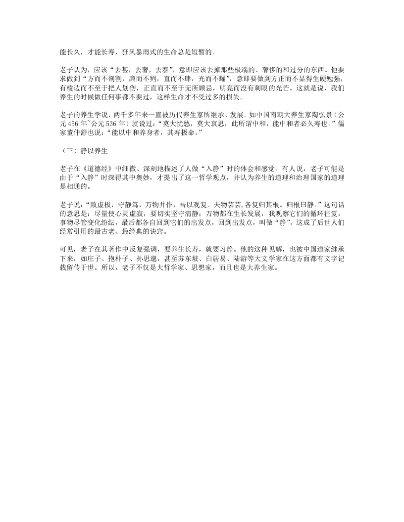 养生,古称“摄生”、“道生”、“保生”,即调摄保养自身生命的意思。其意义在于通过各种调摄保养,增强自身的体质,提高正气,从而增强对外界环境的适应能力和抗病能力,减少或避免疾病的发生:或通过调摄保养,使自身体内阴阳平衡,身心处于一个最佳的状态,从而延缓衰老。养生一要“养正性”,二要“顺自然”。所谓养正性,就是要人们实行正常的、有规律的思维活动和生活方式,也就是说要保养正气。二要“顺自然”,就是要求人们养生不仅要顺从一年四季的气候变化,而且还要随时适应周围的环境。尤其在对待外界事物的影响方面,要有自我控制、调适情绪的能力。情志坦荡,随遇而安,这就是顺应自然的精华所在。人们最宝贵的莫过于生命,因此,古代许多帝王经常希望找到“长生不老”之术。“长生不老”是不可能的,但老子的养生观确实值得今天的人们借鉴。老子是中国春秋战国时代著名的哲学家、思想家,也是道家创始人。《史记》中记载:老子,姓李,名耳,字聃,做过周朝王室的守藏宝之吏,负责征集、保管和整理周王朝及诸侯典籍。曾收孔子做学生。据《史记》记述:“老子百有六十余岁或二百余岁,以自修道而养寿也。”老子对养生,特别是养生哲学,提出了不少宝贵的见解,对后世医学、养生学的发展产生了重大的影响。他的养生哲学后来被中国道家养生派几乎全部继承了下来。老子的养生哲学,都记录在《老子》一书中,深为后世所重视。在1973年长沙汉墓出土的文物中,发现《老子》的两种抄本。远在两千多年前的汉代,人死后就要陪葬《老子》抄本,可见,老子在汉代就受到人们的推崇。老子的养生哲学大致说来有以下三个方面:(一)清心寡欲健康长寿,除了身体外,精神也要健康。人们只知道保养身体,不知道保养精神,只知道爱护身体,不知道爱护精神,不知道身体就好像载有精神的车一样,精神一去,人就死了。要健康长寿,既要讲究饮食、睡眠、生活环境等物质条件,还要重视人的思想和情绪等精神条件,两者缺一不可。老子说:“祸莫大于不知足,咎莫大于欲得。”这就是说,灾祸莫过于不知足,罪过莫过于贪欲太大,身体的大祸恐怕就要临头了。现代生理学家曾做过这样一个有趣的实验,即将一只装有兔子的笼子放在一个装有猛虎的笼子旁边,让这兔子成天看着老虎而惶惶不可终日,对任何“美味”也不爱吃,也睡不好,结果不多久这兔子就萎靡不振,缩成一团,消瘦无力。作为对照研究,另一只兔子则被放养在自然的环境里,结果十分健壮。从这个实验即可看出,精神、情绪对于人的健康长寿是多么的重要。(二)强调守中老子说“多言致穷,不如守中”,意即言多必行不通,还不如保持适中。他还说“飘风不终期,骤雨不终日”,意即狂风刮不到一个早晨,暴雨下不到一个整天,所以还是守中好,“守中”才