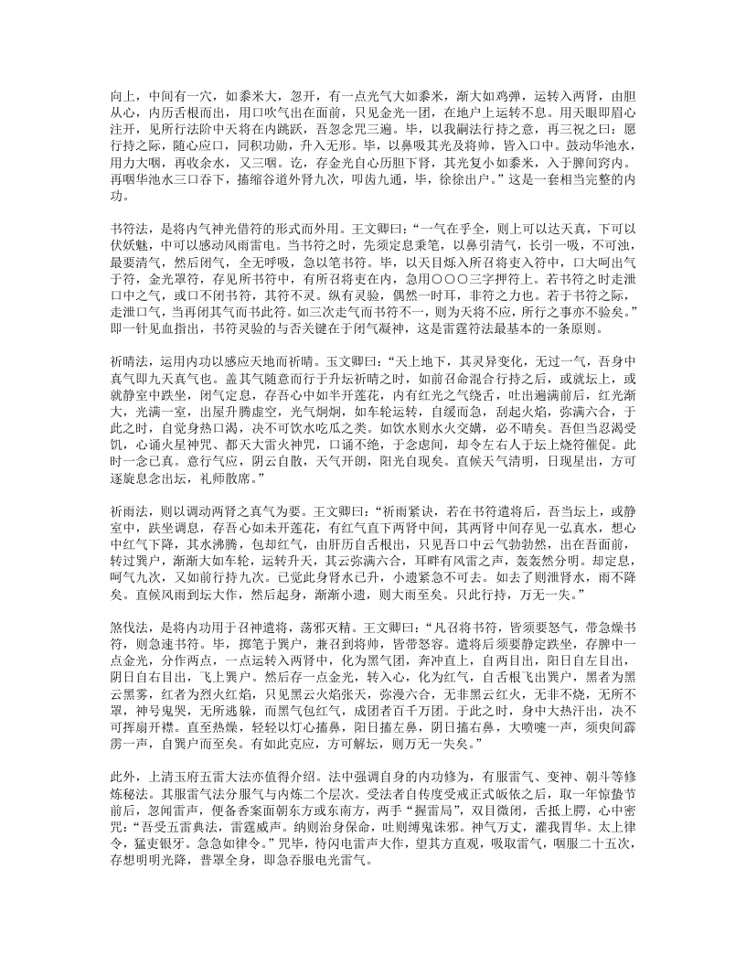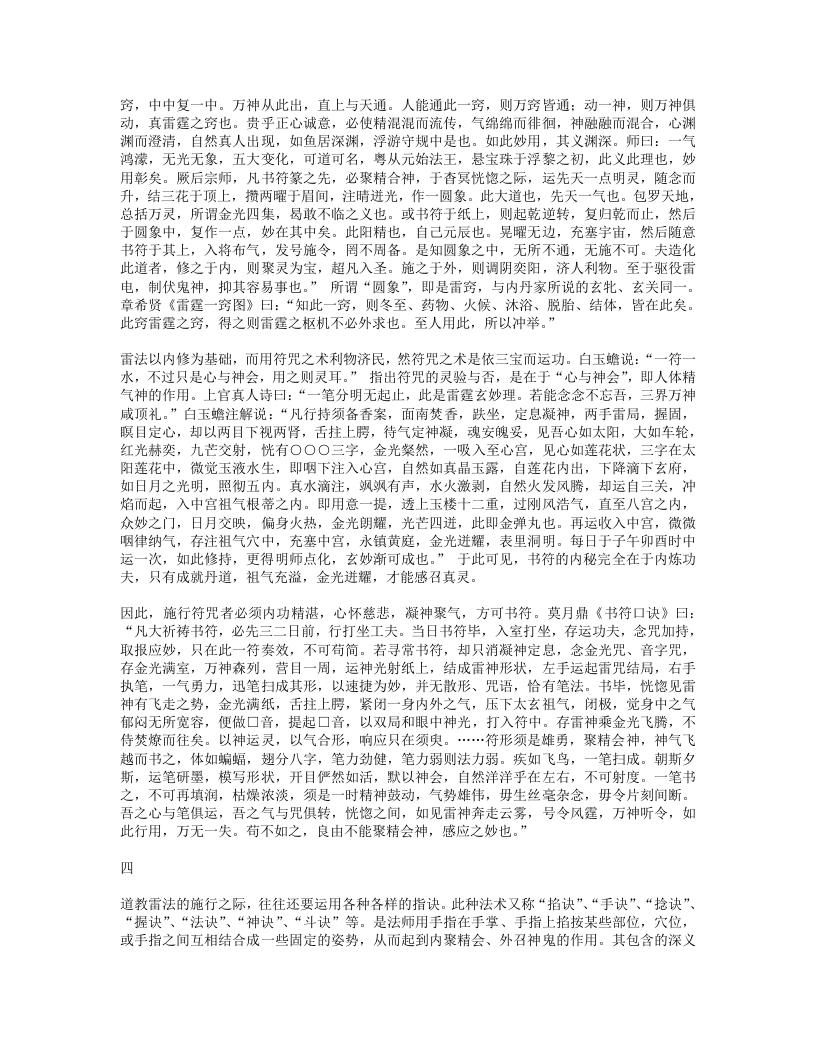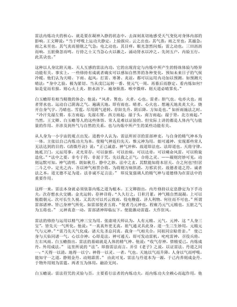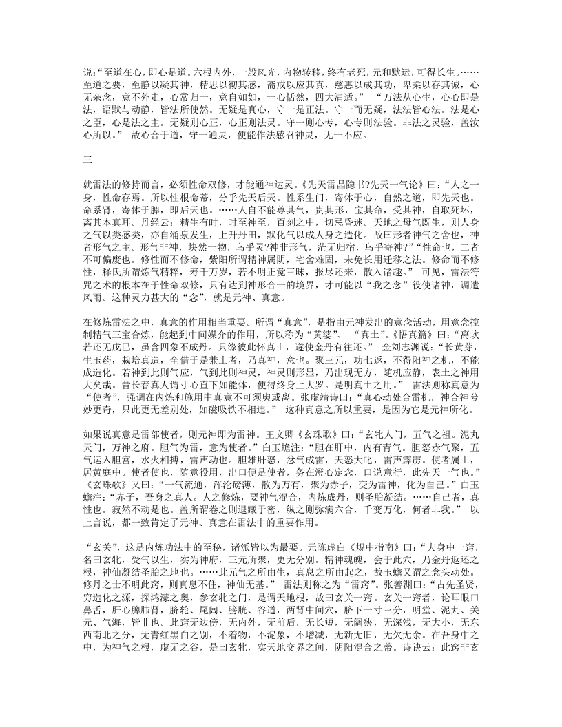 说:“至道在心,即心是道。六根内外,一般风光,内物转移,终有老死,元和默运,可得长生。至道之要,至静以凝其神,精思以彻其感,斋戒以应其真,慈惠以成其功,卑柔以存其诚,心无杂念,意不外走,心常归一,意自如如,一心恬然,四大清适。”“万法从心生,心心即是法,语默与动静,皆法所使然。无疑是真心,守一是正法。守一而无疑,法法皆心法。法是心之臣,心是法之主。无疑则心正,心正则法灵。守一则心专,心专则法验。非法之灵验,盖汝心所以。”故心合于道,守一通灵,便能作法感召神灵,无一不应。三就雷法的修持而言,必须性命双修,才能通神达灵。《先天雷晶隐书?先天一气论》曰:“人之身,性命存焉。所以性根命蒂,分乎先天后天。性系生门,寄体于心,自然之道,即先天也。命系肾,寄体于脾,即后天也。…人自不能尊其气,贵其形,宝其命,受其神,自取死坏,离其本真耳。丹经云:精生有时,时至神至,百刻之中,切忌昏迷。天地之母气既生,则人身之气以类感类,亦自涌泉发生,上升丹田,默化气以成人身之造化。故曰形者神气之舍也,神者形气之主。形气非神,块然一物,乌乎灵?神非形气,茫无归宿,乌乎寄神?”“性命也,二者不可偏废也。修性而不修命,紫阳所谓精神属阴,宅舍难固,未免长用迁移之法。修命而不修性,释氏所谓炼气精粹,寿千万岁,若不明正觉三味,报尽还来,散入诸趣。”可见,雷法符咒之术的根本在于性命双修,只有达到神形合一的境界,才可能以“我之念”役使诸神,调造风雨。这种灵力甚大的“念”,就是元神、真意。在修炼雷法之中,真意的作用相当重要。所谓“真意”,是指由元神发出的意念活动,用意念控制精气三宝合炼,能起到中间媒介的作用,所以称为“黄婆”、“真土”。《悟真篇》曰:“离坎若还无戊巳,虽含四象不成丹。只缘彼此怀真土,遂使金丹有往还。”金刘志渊说:“长黄芽,生玉药,栽培真造,全借于是兼土者,乃真神,意也。聚三元,功七返,不得阳神之机,不能成造化。若神到此则气应,气到此则神灵,神灵则形显,乃出现无方,随机应静,表土之神用大矣哉。昔长春真人谓寸心直下如能体,便得终身上大罗。是明真土之用。”雷法则称真意为“使者”,强调在内炼和施用中真意不可须臾或离。张虚靖诗曰:“真心动处合雷机,神合神兮妙更奇,只此更无差别处,如磁吸铁不相违。”这种真意之所以重要,是因为它是元神所化。如果说真意是雷部使者,则元神即为雷神。王文卿《玄珠歌》曰:“玄牝人门,五气之祖。泥丸天门,万神之府。胆气为雷,意为使者。”白玉蟾注:“胆在肝中,内有青气。胆怒赤气聚,五气运入胆宫,水火相搏,雷声动也。胆雄肝怒,忿气成雷,天怒大此,雷声霹雳。使者属土,居黄庭中。使者使也,随意役用,出口便是使者,务在澄心定念,口说意行,此先天一气也。”《玄珠歌》又曰:“一气流通,浑沦磅薄,散为万有,聚为赤子,变为雷神,化为自己。”白玉蟾注:“赤子,吾身之真人。人之修炼,要神气混合,内炼成丹,则圣胎凝结。…自己者,真性也。寂然不动是也。盖所谓卷之则退藏于密,纵之则弥满六合,千变万化,何者非我。”以上言说,都一致肯定了元神、真意在雷法中的重要作用。“玄关”,这是内炼功法中的至秘,诸派皆以为最要。元陈虚白《规中指南》曰:“夫身中一窍,名曰玄牝,受气以生,实为神府,三元所聚,更无分别。精神魂魄,会于此穴,乃金丹返还之根,神仙凝结圣胎之地也。…此元气之所由生,真总之所由起之,故玉蟾又谓之念头动处。修丹之士不明此窍,则真息不住,神仙无基。”雷法则称之为“雷窍”。张善渊曰:“古先圣贤,穷造化之源,探鸿濛之奥,参玄牝之门,是谓天地根,故曰玄关一窍。玄关一窍者,论耳眼口鼻舌,肝心脾肺肾,脐轮、尾闾、膀胱、谷道,两肾中间穴,脐下一寸三分,明堂、泥丸、关元、气海,皆非也。此窍无边傍,无内外,无前后,无长短,无阔狭,无深浅,无大小,无东西南北之分,无青红黑白之别,不着物,不泥象,不增减,无新无旧,无欠无余。在吾身中之中,为神气之根,虚无之谷,是曰玄牝,实天地交界之间,阴阳混合之蒂。诗诀云:此窍非玄