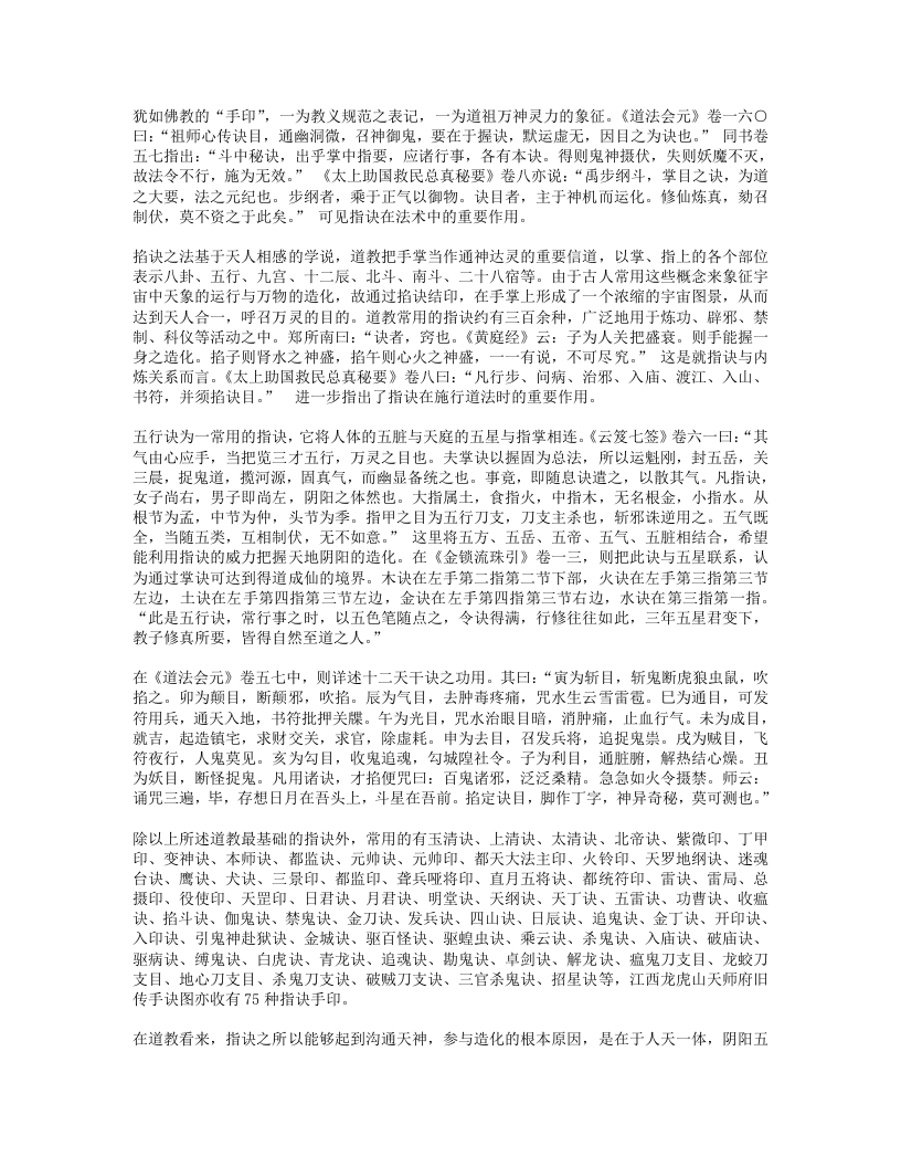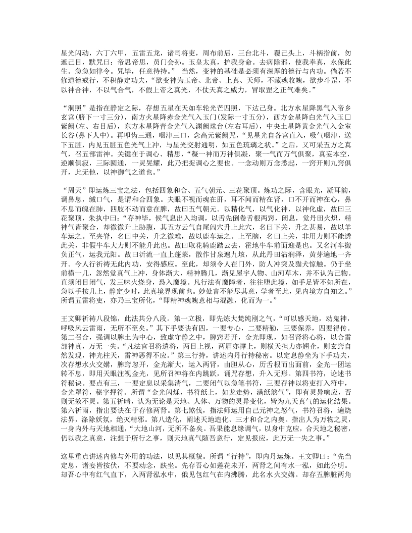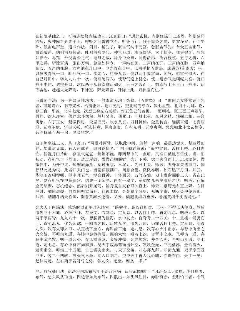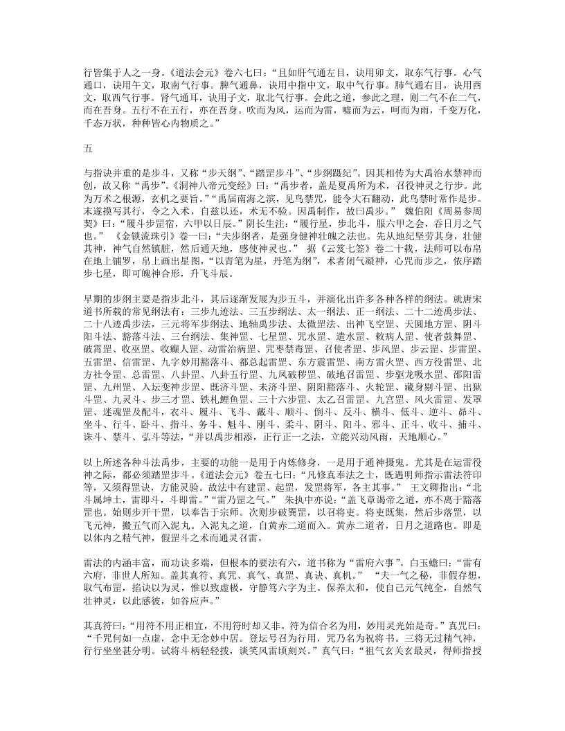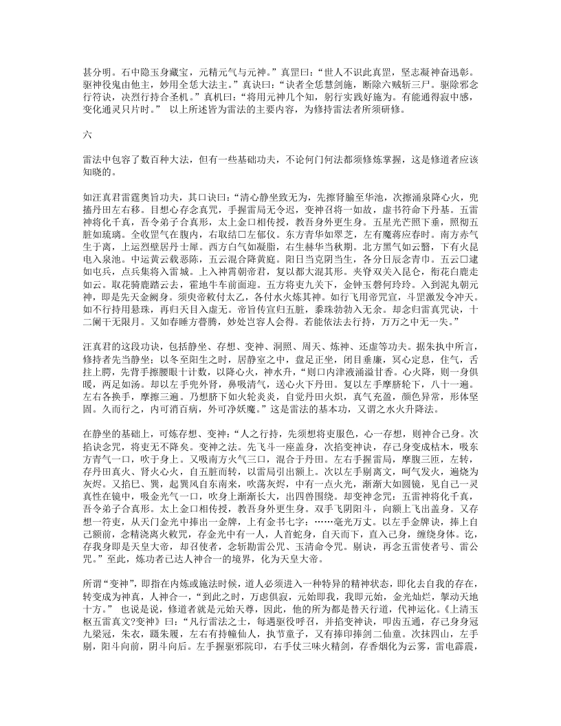 说:“至道在心,即心是道。六根内外,一般风光,内物转移,终有老死,元和默运,可得长生。至道之要,至静以凝其神,精思以彻其感,斋戒以应其真,慈惠以成其功,卑柔以存其诚,心无杂念,意不外走,心常归一,意自如如,一心恬然,四大清适。”“万法从心生,心心即是法,语默与动静,皆法所使然。无疑是真心,守一是正法。守一而无疑,法法皆心法。法是心之臣,心是法之主。无疑则心正,心正则法灵。守一则心专,心专则法验。非法之灵验,盖汝心所以。”故心合于道,守一通灵,便能作法感召神灵,无一不应。三就雷法的修持而言,必须性命双修,才能通神达灵。《先天雷晶隐书?先天一气论》曰:“人之身,性命存焉。所以性根命蒂,分乎先天后天。性系生门,寄体于心,自然之道,即先天也。命系肾,寄体于脾,即后天也。…人自不能尊其气,贵其形,宝其命,受其神,自取死坏,离其本真耳。丹经云:精生有时,时至神至,百刻之中,切忌昏迷。天地之母气既生,则人身之气以类感类,亦自涌泉发生,上升丹田,默化气以成人身之造化。故曰形者神气之舍也,神者形气之主。形气非神,块然一物,乌乎灵?神非形气,茫无归宿,乌乎寄神?”“性命也,二者不可偏废也。修性而不修命,紫阳所谓精神属阴,宅舍难固,未免长用迁移之法。修命而不修性,释氏所谓炼气精粹,寿千万岁,若不明正觉三味,报尽还来,散入诸趣。”可见,雷法符咒之术的根本在于性命双修,只有达到神形合一的境界,才可能以“我之念”役使诸神,调造风雨。这种灵力甚大的“念”,就是元神、真意。在修炼雷法之中,真意的作用相当重要。所谓“真意”,是指由元神发出的意念活动,用意念控制精气三宝合炼,能起到中间媒介的作用,所以称为“黄婆”、“真土”。《悟真篇》曰:“离坎若还无戊巳,虽含四象不成丹。只缘彼此怀真土,遂使金丹有往还。”金刘志渊说:“长黄芽,生玉药,栽培真造,全借于是兼土者,乃真神,意也。聚三元,功七返,不得阳神之机,不能成造化。若神到此则气应,气到此则神灵,神灵则形显,乃出现无方,随机应静,表土之神用大矣哉。昔长春真人谓寸心直下如能体,便得终身上大罗。是明真土之用。”雷法则称真意为“使者”,强调在内炼和施用中真意不可须臾或离。张虚靖诗曰:“真心动处合雷机,神合神兮妙更奇,只此更无差别处,如磁吸铁不相违。”这种真意之所以重要,是因为它是元神所化。如果说真意是雷部使者,则元神即为雷神。王文卿《玄珠歌》曰:“玄牝人门,五气之祖。泥丸天门,万神之府。胆气为雷,意为使者。”白玉蟾注:“胆在肝中,内有青气。胆怒赤气聚,五气运入胆宫,水火相搏,雷声动也。胆雄肝怒,忿气成雷,天怒大此,雷声霹雳。使者属土,居黄庭中。使者使也,随意役用,出口便是使者,务在澄心定念,口说意行,此先天一气也。”《玄珠歌》又曰:“一气流通,浑沦磅薄,散为万有,聚为赤子,变为雷神,化为自己。”白玉蟾注:“赤子,吾身之真人。人之修炼,要神气混合,内炼成丹,则圣胎凝结。…自己者,真性也。寂然不动是也。盖所谓卷之则退藏于密,纵之则弥满六合,千变万化,何者非我。”以上言说,都一致肯定了元神、真意在雷法中的重要作用。“玄关”,这是内炼功法中的至秘,诸派皆以为最要。元陈虚白《规中指南》曰:“夫身中一窍,名曰玄牝,受气以生,实为神府,三元所聚,更无分别。精神魂魄,会于此穴,乃金丹返还之根,神仙凝结圣胎之地也。…此元气之所由生,真总之所由起之,故玉蟾又谓之念头动处。修丹之士不明此窍,则真息不住,神仙无基。”雷法则称之为“雷窍”。张善渊曰:“古先圣贤,穷造化之源,探鸿濛之奥,参玄牝之门,是谓天地根,故曰玄关一窍。玄关一窍者,论耳眼口鼻舌,肝心脾肺肾,脐轮、尾闾、膀胱、谷道,两肾中间穴,脐下一寸三分,明堂、泥丸、关元、气海,皆非也。此窍无边傍,无内外,无前后,无长短,无阔狭,无深浅,无大小,无东西南北之分,无青红黑白之别,不着物,不泥象,不增减,无新无旧,无欠无余。在吾身中之中,为神气之根,虚无之谷,是曰玄牝,实天地交界之间,阴阳混合之蒂。诗诀云:此窍非玄