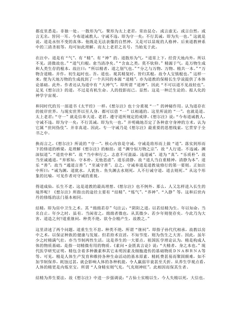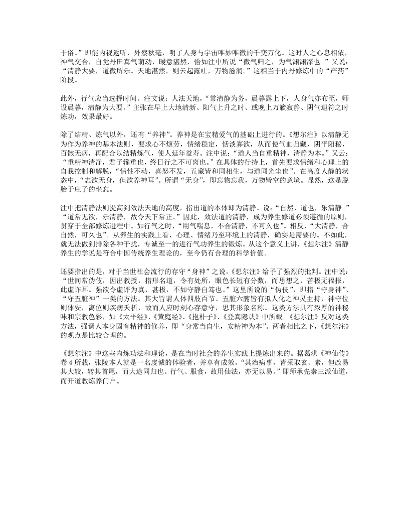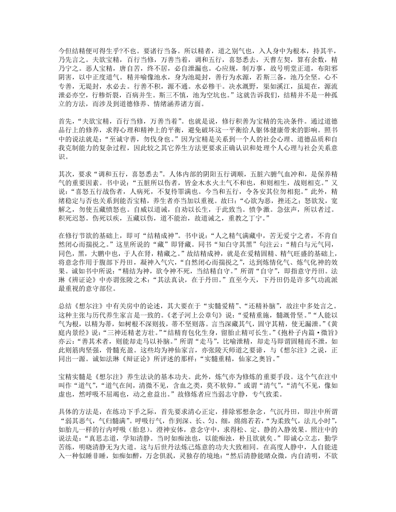 今但结精便可得生乎?不也。要诸行当备。所以精者,道之别气也,入人身中为根本,持其半,乃先言之。夫欲宝精,百行当修,万善当着,调和五行,喜怒悉去,天曹左契,算有余数,精乃宁之。恶人宝精,唐自苦,终不居,必自泄漏也。心应规,制万事,故号明堂正道,布阳邪阴害,以中正度道气。精并喻像池水,身为池堤封,善行为水源,若斯三备,池乃全坚。心不专善,无堤封,水必去。行善不积,源不通。水必糁干。决水溉野,渠如溪江,虽堤在,源流泄必亦空,行糁炘裂,百病并生。斯三不慎,池为空坑也。”这就告诉我们,结精并不是一种孤立的方法,而涉及到道德修养、情绪涵养诸方面。首先,“夫欲宝精,百行当修,万善当着”。也就是说,修行积善为宝精的先决条件。通过道德品行上的修养,求得心理和精神上的平衡,避免破坏这一平衡给人躯体健康带来的影响。照书中的说法就是:“至诚守善,勿伐身也。”因为宝精是关系到一个人的社会心理、道德品质和自我克制能力的复杂过程,因此较之其它养生方法更要求正确认识和处理个人心理与社会关系意识。其次,要求“调和五行,喜怒悉去”。人体内部的阴阳五行调顺,五脏六腑气血冲和,是保养精气的重要因素。书中说:“五脏所以伤者,皆金木水火土气不和也,和则相生,战则相克。”又说:“喜怒五行战伤者,人病死,不复待罪满也。今当和五行,令各安其位勿相犯。”此外,精绪稳定与否也关系到能否宝精,养生者亦当加以重视。故曰:“心欲为恶,挫还之:怒欲发,宽解之,勿使五藏愤怒也。自威以道诫,自劝以长生,于此致当。愤争激。急弦声,所以者过。积死迟怒。伤死以疾,五藏以伤,道不能治,故道诫之,重教之丁宁。”在修行节欲的基础上,即可“结精成神”。书中说:“人之精气满藏中,苦无爱宁之者,不肯自然闭心而揣税之。”这里所说的“藏”即肾藏。同书“知白守其黑”句注云:“精白与元气同,同色,黑,大鹏中也,于人在肾,精藏之。”故结精成神,就是在爱精固精、精气旺盛的基础上,将意念作用于腹部下丹田,凝神入气穴,“自然闭心而揣捝之”,达到炼情化气、炼气化神的效果。诚如书中所说:“精结为神,欲令神不死,当结精自守。”所谓“自守”,即指意守丹田。法琳《辨证论》中亦谓张陵之术:“其法真诀,在于丹田。”直至今天,下丹田仍是许多气功流派最重视的意守部位。总结《想尔注》中有关房中的论述,其大要在于“实髓爱精”、“还精补脑”,故注中多处言之。这种主张与历代养生家言是一致的。《老子河上公章句》说:“爱精重施,髓溉骨坚。”“人能以气为根,以精为蒂,如树根不深则拔,蒂不坚则落。言当深藏其气,固守其精,使无漏泄。”《黄庭内景经》说:“三神还精老方壮。”“结精育包化生身,留胎止精可长生。”《抱朴子内篇·微旨》亦云:“善其术者,则能却走马以补脑。”所谓“走马”,比喻泄精,却走马即谓固精而不泄,如此则筋肉坚强,骨髓充盈。这些均为神仙家言,亦张陵天师道之要谛,与《想尔注》之说,正同出一源。诚如法琳《辩证论》所评述的那样:“实髓重精,仙家之奥旨。”宝精实髓是《想尔注》养生法诀的基本功夫。此外,炼气亦为修炼的重要手段。这个气在注中叫作“道气”,“道气在间,清微不见,含血之类,莫不软仰。”或谓“清气”,“清气不见,像如虚也,然呼吸不屈竭也,动之愈益出。”故修炼者应当弱志守静,专气致柔。具体的方法是,在练功下手之际,首先要求清心正定,排除邪想杂念,气沉丹田,即注中所谓“弱其恶气,气归髓满”。呼吸行气,作到深、长、匀、细,绵绵若若,“为柔致气,法儿小时”,如胎儿一样的行内呼吸(胎息)。澄神安体,意念守中,求得松、定、静的入静效果。照注中的说法是:“真思志道,学知清静。当时如痴浊也,以能痴浊,朴且欲就矣。”即诚心立志,勤学苦练,明晓清静无为大道。这与后世丹法炼己炼意的功夫大致相同。在高度人静中,人自能进入一种似睡非睡,如痴如醉,万念俱泯,灵独存的境地:“然后清静能睹众微,内自清明,不欲