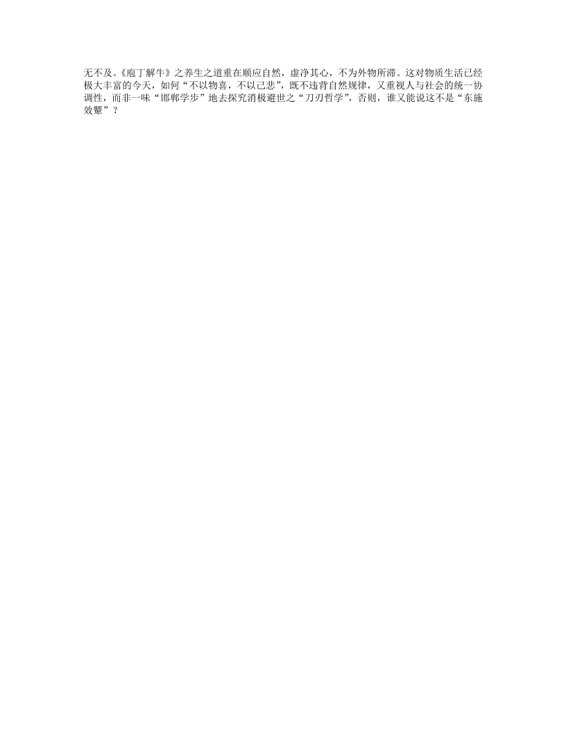 年少轻狂,不知老之将至:年逾半百,忽念养生之道。若论养生,则非老庄莫属:而于庄生,唯《养生主》独尊。于是,起身找来《庄子》,直奔《内篇》之三,却不曾料想开篇《庖丁解牛》乃中学《语文》之名篇,至今读来仍朗朗上口,甚至尚能背诵若干。只是好奇:以前中学读此文,只知《庖丁解牛》乃庄子用寓言寓意任何事物只需经反复之实践,掌握其客观规律后,定就能得心应手、运用自如,却从未去思考庖丁解牛与养生有何关联。时隔三十多年,再次从头至尾反复诵读《庖丁解牛》,许是经过岁月冲刷、人生积淀,竞有了些新的感悟:“臣之所好者道也,进乎技矣。始臣之解牛之时,所见无非牛者。三年之后,未尝见全牛也…”其“所好者道也”,或正是老庄哲学中的“道”之所在。老子创立道家学说,认为“道”乃宇宙一切变化之源:庄子继承、发展老子之思想,并用浅显的寓言形式,通俗易懂地阐述了“道”:我喜好探究事物的规律,这比起一般的技巧又进了一层。从一开始的放眼整牛到后来的目无全牛,是完全按照牛的生理结构,筋脉经络相连的地方及筋骨结合的地方,刀刃都未曾碰过,所以这把用了十九年、宰了几千头牛的刀,依然锋利得如同刚磨好。庖丁面对交错聚结的牛之筋骨游刃有余,是“依乎天理”、“因其固然”,且审慎秉持了“怵然为戒”之态度。庄子通过“依乎天理”的庖丁,把看不见、摸不着之“自然之道”,诠释得生动而又浅显,不愧为先秦的思想、哲学和散文大家。而我更惊讶于庄子的文学魅力和丰富的想象力:文风活泼风趣,比喻形象生动,读来奇趣横生,喻意睿智深刻,且极尽奇特浪漫。能将“非常道”、“非常名”之说不清、道不明之“道”,托寓言以广其意,把微妙难言的哲理说得如此引人入胜,是庄子作为寓言大师的功夫所在。从庖丁这把用了十九年却“刀刃若新发于硎”的刀入手,顺应自然之道,善于在筋骨交错聚结的空隙中,避实就虚,集中精力,刀起肉落,骨肉像泥土散落在地上,豁啦一声一下子就解开了,而刀刃毫发未损。庄子“以无厚入有间”来说明人的生命是有限的,要善于避开一切矛盾瓜葛和是非曲直,既不因为善而去追求功名利禄,更不因为恶而遭受刑罚屈辱,这样才能“保身”、“全生”、“养亲”、“尽年”:以“依乎天理”、“安时处顺”来达到“技”与“道”的和谐统一,这是一种“大巧若拙、大智若愚”、看似无技巧实是“技巧高到看不出技巧”的“无为而无不为”的境界。故而,文惠君曰:“善哉,吾闻庖丁之言,得养生焉。”“不同时期读哈姆莱特就会有不同的哈姆莱特”,莎士比亚“一千个人读哈姆雷特就会有一千个哈姆雷特”的名言,倘若能再加上这一句,我觉得就更完美了。庄子《庖丁解牛》究竞是说养生之道,还是通过养生寓意消极避世?此时我读到了庄子的养生之道,当然,也有人从中读到了“刀刃哲学”。所谓“刀刃哲学”,无非说要使自己在这纷繁芜杂的现实社会里生存并游刃有余,就必须避开“技经肯綮”与“大辄”,避开各种矛盾、利害、是非、名利的世俗冲突,只找空隙处下刀,保全自身这把“刀刃”永“若新发于硎”。“刀刃哲学”的确曾给一些身处战乱危世、悲观失意者,在避世免祸时以莫大的精神慰藉。而我以为,“刀刃哲学”作为一种处世哲学,实不可取。中国社会从来不缺“立身行一”的正直士大夫,他们无论是居“庙堂之高”还是处“江湖之远”,其“先天下之忧而忧,后天下之乐而乐”之其忧国忧民之心始终如一,他们为社会的发展、民族的进步、人民的福祉而将个人的安危、幸福置之度外,尤其是在今天和平建设和发展年代,更需要万众一心、众志成城,为中华民族的伟大复兴而积极进取。诚然,道家在中国哲学史上的地位并不及儒家,但作为一种养生之道,其影响比儒家有过之而