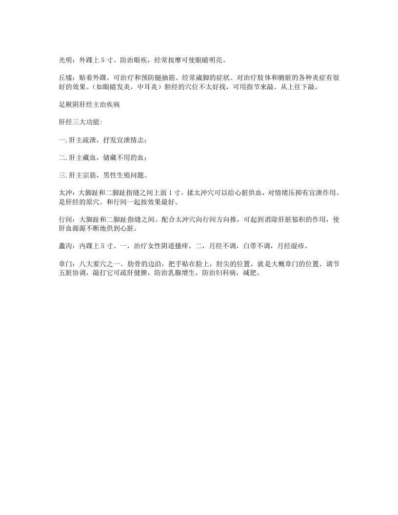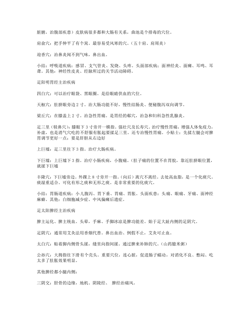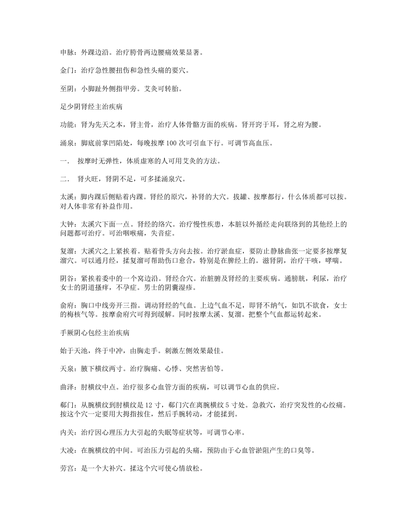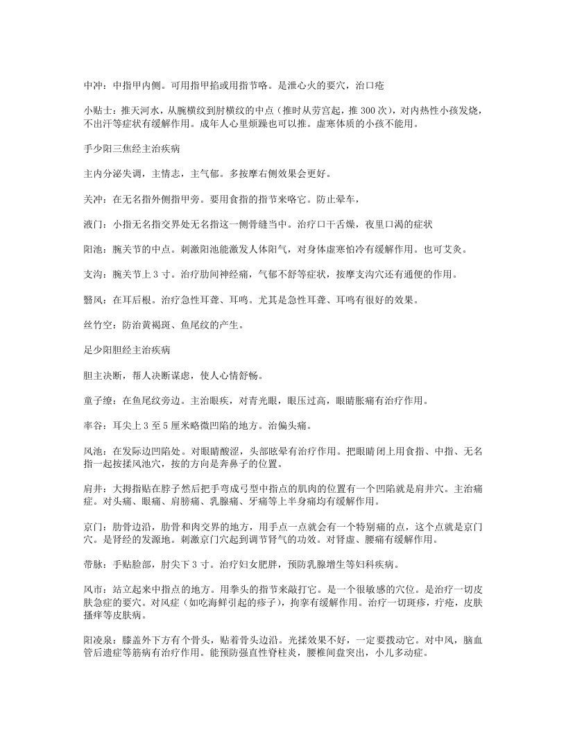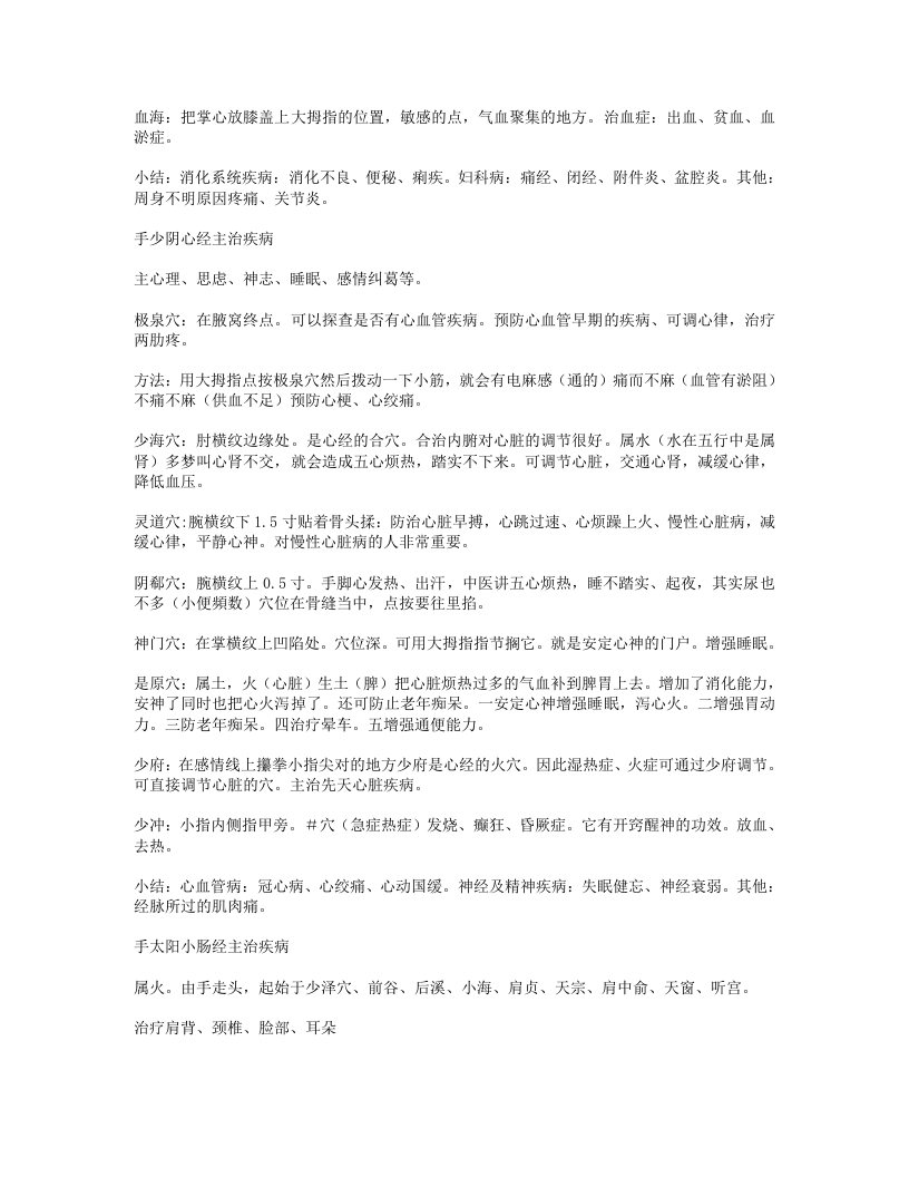 血海:把掌心放膝盖上大拇指的位置,敏感的点,气血聚集的地方。治血症:出血、贫血、血淤症。小结:消化系统疾病:消化不良、便秘、痢疾。妇科病:痛经、闭经、附件炎、盆腔炎。其他:周身不明原因疼痛、关节炎。手少阴心经主治疾病主心理、思虑、神志、睡眠、感情纠葛等。极泉穴:在腋窝终点。可以探查是否有心血管疾病。预防心血管早期的疾病、可调心律,治疗两肋疼。方法:用大拇指点按极泉穴然后拨动一下小筋,就会有电麻感(通的)痛而不麻(血管有淤阻)不痛不麻(供血不足)预防心梗、心绞痛。少海穴:肘横纹边缘处。是心经的合穴。合治内腑对心脏的调节很好。属水(水在五行中是属肾)多梦叫心肾不交,就会造成五心烦热,踏实不下来。可调节心脏,交通心肾,减缓心律,降低血压。灵道穴:腕横纹下1.5寸贴着骨头揉:防治心脏早搏,心跳过速、心烦躁上火、慢性心脏病,减缓心律,平静心神。对慢性心脏病的人非常重要。阴郗穴:腕横纹上0.5寸。手脚心发热、出汗,中医讲五心烦热,睡不踏实、起夜,其实尿也不多(小便頻数)穴位在骨缝当中,点按要往里掐。神门穴:在掌横纹上凹陷处。穴位深。可用大拇指指节搁它。就是安定心神的门户。增强睡眠。是原穴:属土,火(心脏)生土(脾)把心脏烦热过多的气血补到脾胃上去。增加了消化能力,安神了同时也把心火泻掉了。还可防止老年痴呆。一安定心神增强睡眠,泻心火。二增强胃动力。三防老年痴呆。四治疗晕车。五增强通便能力。少府:在感情线上攥拳小指尖对的地方少府是心经的火穴。因此湿热症、火症可通过少府调节。可直接调节心脏的穴。主治先天心脏疾病。少冲:小指内侧指甲旁。#穴(急症热症)发烧、癫狂、昏厥症。它有开窍醒神的功效。放血、去热。小结:心血管病:冠心病、心绞痛、心动国缓。神经及精神疾病:失眠健忘、神经衰弱。其他:经脉所过的肌肉痛。手太阳小肠经主治疾病属火。由手走头,起始于少泽穴、前谷、后溪、小海、肩贞、天宗、肩中俞、天窗、听宫。治疗肩背、颈椎、脸部、耳朵