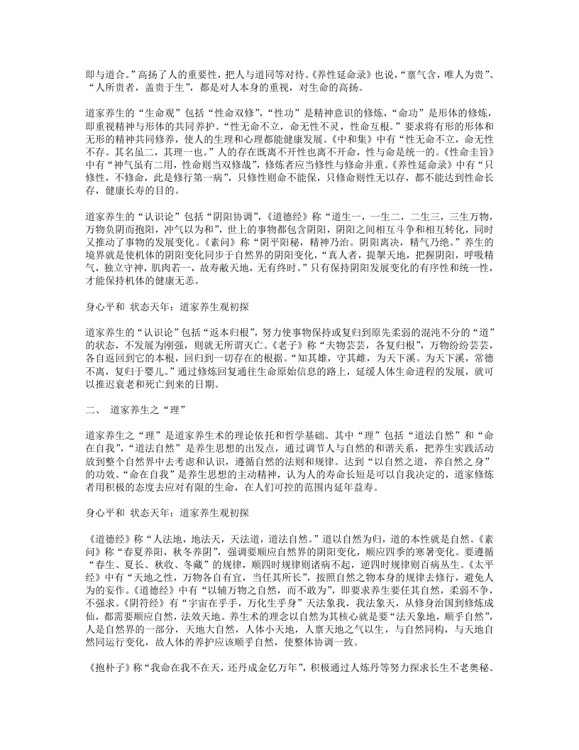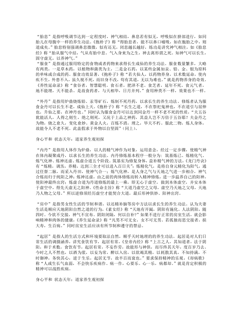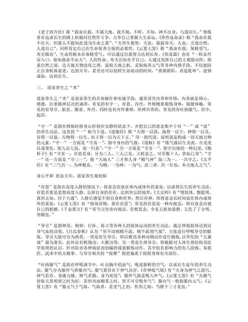 《老子西升经》称“我命在我,不属天地。我不视,不听,不知,神不出身,与道同久。”修炼者在追求长生的路上积极同自然作斗争,力争自己掌握人生命运。《养性延命录》称“我命在我不在天。但愚人不能知此道为生命之要”、“夫形生愚智,天也,强弱寿天,人也。天道自然,人道自己”,同样肯定自己在生命保养方面的必要性。《云笈七签》称“我命在我,保精受气,寿无极也”,生命的根本在保精受气,可以通过自我努力达到长寿。《悟真篇》也有“一粒金丹吞入口,始知我命不由天”,人的性命、寿天长短在乎自己,人通过发挥自己的主观能动性,探求自然之道,达天地万物造化之理,盗取天地之机,采取炼养元气等各种内修手段,不仅能防止自身机体衰老,达到天年,甚至还可以扭转生命流动的时间,“重铸阴阳,再造乾坤”,逆修成仙,达到长生。三、道家养生之“术”道家养生之“术”是道家养生的具体操作和实施手段,通常讲究内养和外修,内养就是修心、修德,注重精神层次的涵养,常见的有守一、存思、内丹,外修侧重锻炼身体,强健体魄,常见的有导引、胎总、服食、外丹,同时也有内外兼修,形神共养的,常见的有吐纳服气、房中、起居。“守一”是指在修炼时将身心控制在安静的状态下,并把自己的意念集中于对“一”或“道”的养生功法。这里的“一”相当于道,《道德经》称“天得一以清,地得一以宁,神得一以灵,谷得一以盈,万物得一以生,侯王得一以为天下正。”用一指代道,说明道是构成一切天地万物的元素。“守一”一方面是“守真一”,指守身内的气液,《道枢》有“炼气液以生龙虎,合龙虎以成变化,使九还七返,混一归真”:“守一”另一方面是“守玄一”,指守出现的一种幻觉,《抱朴子》有“守玄一,并思其身,分为三人,三人己见,又转益之,可至数十人,皆如己身”:“守一还一方面是“守三一”,指“天地人”三才和人身“精气神”混三为一,一共守之,《太平经》有“三气共一,为神根也。一为精,一为神,一为气。此三者,共一位也,本天地人之气”。身心平和状态天年:道家养生观初探“存思”是指在高度入静的情况下,将意念存放在体内或体外的某处,以求得长生的养生功法。存思首要是思想高度入静,忘掉自身的存在,达到坐忘的境界,《大宗师》有“堕肢体,黜聪明,离形去知,同于大通”,入静后感觉不到自身和世界:然后存神,即将意念长时间放在体内或体外的某处,《云笈七签》有“修身济物,要在存思”:常见的存思是一种内视法,即以意念内视自己的脏腑,《千金要方》有“常当习皇帝内视法,存想思念,令见五脏如悬磐,五色了了分明,勿辍也。”“导引”是指伸屈、俯仰、行卧、倚立等各种人的肢体运动的养生功法,通过伸展肢体达到宣导气血的功效。《吕氏春秋》认为“形不动则精不流,精不流则气郁”,主张进行呼吸导引的锻炼。导引大致可分为两类,一类是仿生导引,即以模仿各种动物动作进行锻炼,以华佗的“五禽戏”最为著名,此外还有鹤翔功、大雁功等:另一类是生理导引,即根据对人体生理结构及医学原理的认识,针对防治各种病症而创编的成套锻炼动作,其中较有影响力的有八段锦、易筋经,武术中的太极拳。与导引相关的“按摩”则更偏重于按捏身体有关部位。“吐纳服气”是指在呼吸调节中,吐出胸中的浊气,吸进新鲜的空气,以求长生延年的养生功法,服气分为服外气和服内气。服气要旨在于神气具存,《存神炼气铭》有“夫身为神气之窟穴,神气若存,身康力健。神气若散,身乃死焉”:服外气就是吸入外气,《云笈七签》有“凡服气皆取天景明澄之时为好,若恒风雨晦雾之时,皆不可引吸外气”:服内气一般指服内元气,《云笈七签》有“服元气于气海。气海者,是受气之初,传形之始,当脐下三寸是也。”