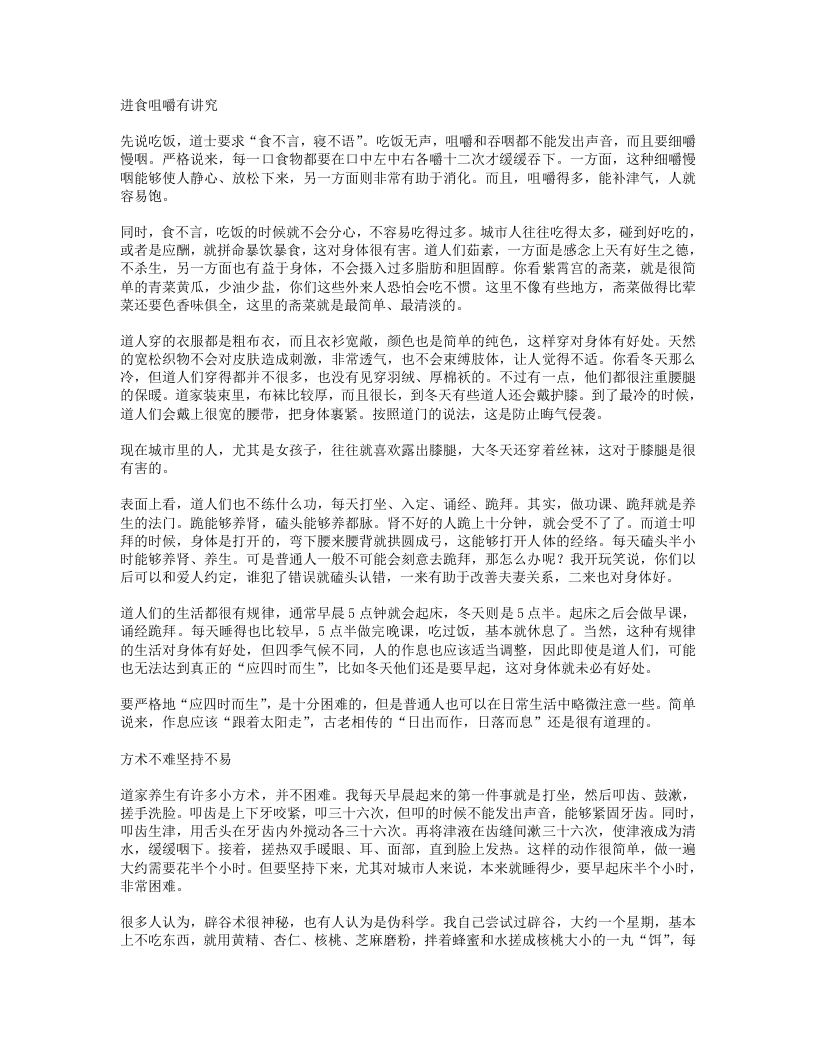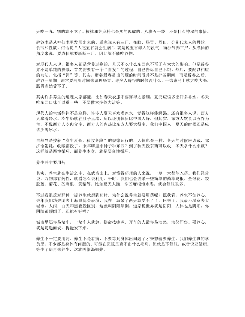 大吃一丸,别的就不吃了。核桃和芝艺麻粉也是买的现成的,八块五一袋,不是什么神秘的事情。辟谷术是从神仙术里发展出来的。道家说人有三尸,在脑、肠胃、丹田,分别代表人的思欲、食欲和性欲。俗话说“人吃五谷就会生病”,就是说五谷养人的浊气,而浊气养三尸。从成仙的角度来说,要成仙就要斩断三尸,因此就不能吃谷物。对现代人来说,很多人都是营养过剩的,几天不吃什么东西也不至于有太大的影响。但是辟谷并不是单纯的挨饿,首先需要有一个“自发”的过程,自己告诉自己不饿。然后,要配以相应的功法,包括“饵”等。其实,辟谷最容易出问题的时间段并不是辟谷期间,而是辟谷之后。辟谷一星期,通常要两周时间来调理肠胃。许多人辟谷的时候没什么,一结束马上就大吃大喝,肠胃当然受不了。其实许多养生的道理大家都懂,比如春天衣服不要穿得太紧绷,夏天应该多出汗多补水,冬天吃东西口味可以重一些,不要做太多体力活等。现代人的生活往往不是这样。许多人夏天喜欢喝冰水,觉得这样能解褐。还有很多人说,西方人拿着冷水、冷牛奶就往肚子里灌,所以证明体质比中国人好。但其实,东方人饮食以五谷为主,不像西方人吃肉食多,西方人的内热比东方人要大得多。我们中国人,夏天的时候还是应该少喝冰水。自然界是按着“春生夏长,秋收冬藏”的规律运行的,人体也是一样。冬天的时候应该藏,你拼命消耗,收藏都没了,来年哪里来种子种东西?到了秋天没东西可以收,冬天拿什么来藏?这样就是恶性循环。而养生本身,就是要良性循环。养生并非要用药其实,养生就在生活之中。在武当山上,对懂得药理的人来说,一草一木都能入药。我们经常说,万物都有药性,就看怎么去利用。平时,我们也会去采一些简单的药草葛根、金银花、绞股蓝、菊花、芝麻根、黄精等。比如夏天人躁,拿苎麻根泡水喝,就会舒服很多。不过我很反对那种一提养生就想到药材。为什么说养生就要用药呢?照我看,养生不如养心。去年我们功夫团去上海世博会表演,我在上海呆了两天就受不了了,回来了。我最不愿意去大城市,太闹,白天和黑夜没区别,这就叫阴阳颠倒。道家说世界就是阴阳,人体也是阴阳,你阴阳都颠倒了,还能有好吗?城市里还容易堵车,一堵车人就急,拼命按喇叭。开车的人最容易动怒,动怒即伤。要养心,就是随遇而安,得能安下来。养生不一定要用药。养生不是看病,不要等到身体出问题了才来想着要养生。我们养生班的学员里,不少都是身体有问题的。可能在医院里查不出什么毛病,但就是不舒服,或者说亚健康。等生了病再来养生,这就叫临渴掘井。