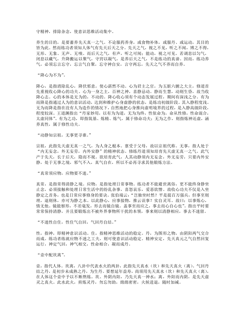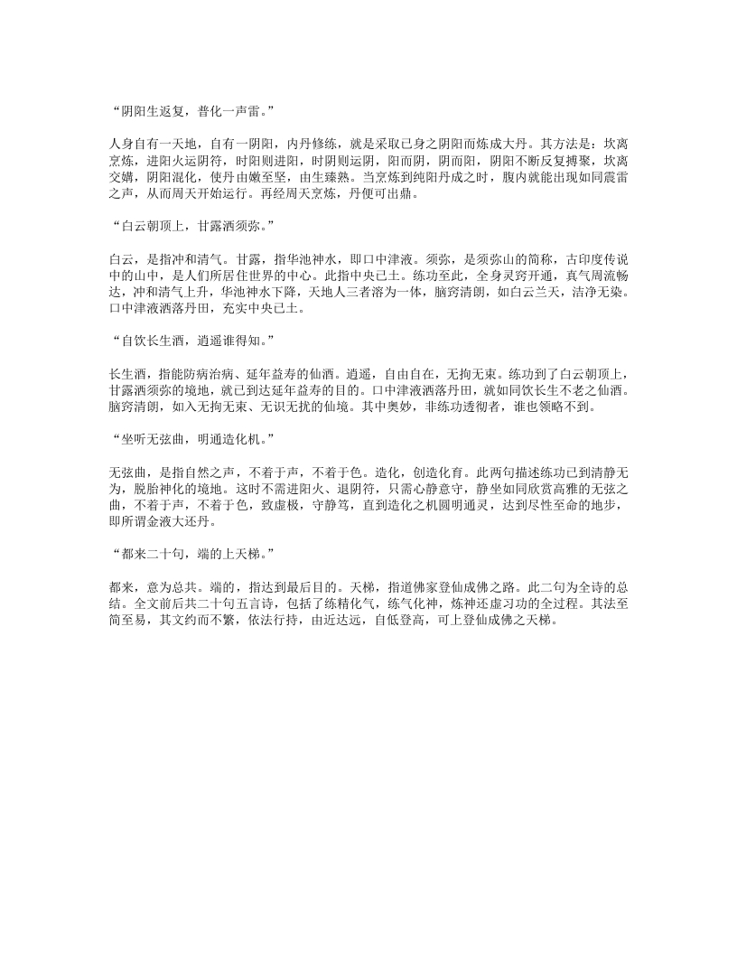 “阴阳生返复,普化一声雷。”人身自有一天地,自有一阴阳,内丹修练,就是采取己身之阴阳而炼成大丹。其方法是:坎离烹炼,进阳火运阴符,时阳则进阳,时阴则运阴,阳而阴,阴而阳,阴阳不断反复搏聚,坎离交媾,阴阳混化,使丹由嫩至坚,由生臻熟。当烹炼到纯阳丹成之时,腹内就能出现如同震雷之声,从而周天开始运行。再经周天烹炼,丹便可出鼎。“白云朝顶上,甘露洒须弥。”白云,是指冲和清气。甘露,指华池神水,即口中津液。须弥,是须弥山的简称,古印度传说中的山中,是人们所居住世界的中心。此指中央已土。练功至此,全身灵窍开通,真气周流畅达,冲和清气上升,华池神水下降,天地人三者溶为一体,脑窍清朗,如白云兰天,洁净无染。口中津液洒落丹田,充实中央己土。“自饮长生酒,逍遥谁得知。”长生酒,指能防病治病、延年益寿的仙酒。逍遥,自由自在,无拘无束。练功到了白云朝顶上,甘露洒须弥的境地,就己到达延年益寿的目的。口中津液洒落丹田,就如同饮长生不老之仙酒。脑窍清朗,如入无拘无束、无识无扰的仙境。其中奥妙,非练功透彻者,谁也领略不到。“坐听无弦曲,明通造化机。”无弦曲,是指自然之声,不着于声,不着于色。造化,创造化育。此两句描述练功已到清静无为,脱胎神化的境地。这时不需进阳火、退阴符,只需心静意守,静坐如同欣赏高雅的无弦之曲,不着于声,不着于色,致虚极,守静笃,直到造化之机圆明通灵,达到尽性至命的地步,即所谓金液大还丹。“都来二十句,端的上天梯。”都来,意为总共。端的,指达到最后目的。天梯,指道佛家登仙成佛之路。此二句为全诗的总结。全文前后共二十句五言诗,包括了练精化气,练气化神,炼神还虚习功的全过程。其法至简至易,其文约而不繁,依法行持,由近达远,自低登高,可上登仙成佛之天梯。