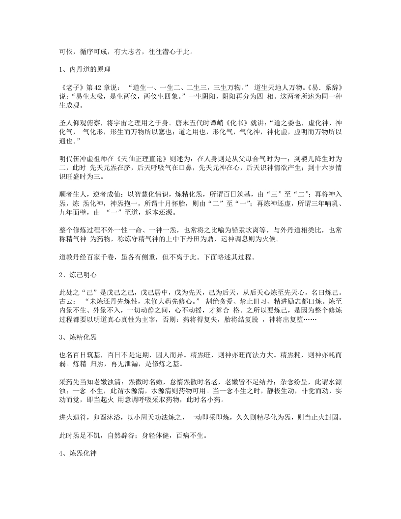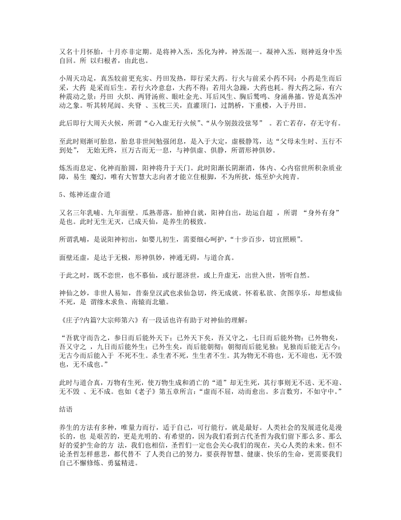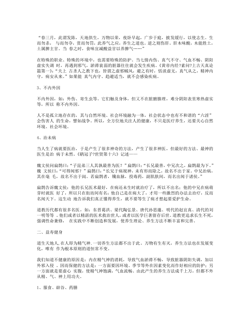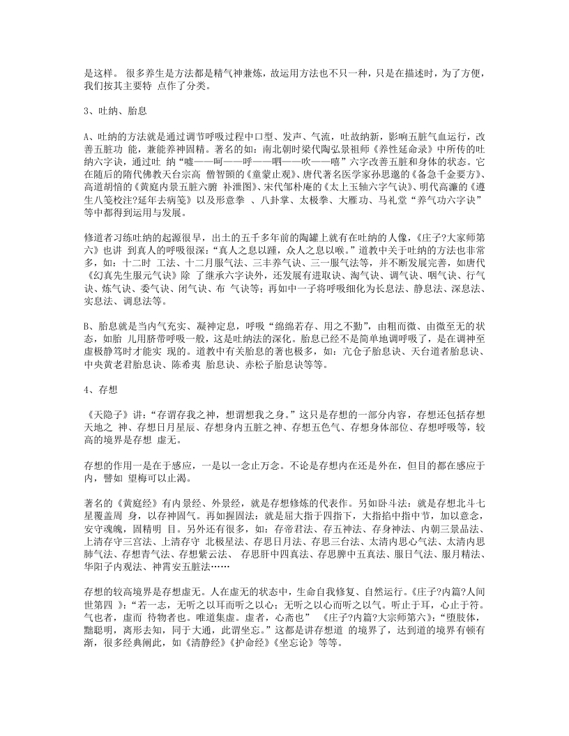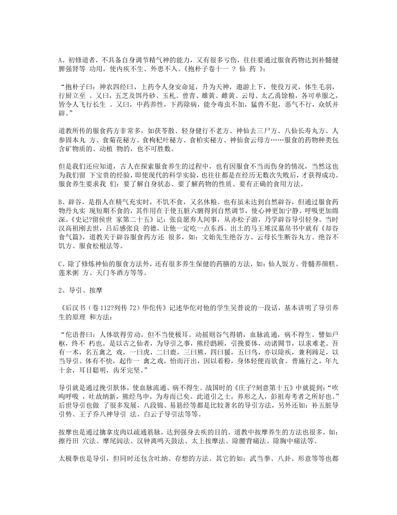 A、初修道者,不具备自身调节精气神的能力,又有很多亏伤,往往要通过服食药物达到补髓健脾强肾等功用,使内疾不生、外患不入。《抱朴子卷十一?仙药》:“抱朴子曰:神农四经曰,上药令人身安命延,升为天神,遨游上下,使役万灵,体生毛羽,行厨立至。又曰,五芝及饵丹砂、玉札、曾青、雄黄、雌黄、云母、太乙禹馀粮,各可单服之皆令人飞行长生。又曰,中药养性,下药除病,能令毒虫不加,猛兽不犯,恶气不行,众妖并辟。”道教所传的服食药方非常多,如茯苓散、轻身健行不老方、神仙去三尸方、八仙长寿丸方、人参固本丸方、食菊花秘方、食枸杞叶秘方、食柏实秘方、神仙食云母方…服食的药物种类包含矿物质的、动植物的,也不可胜数。但是我们还应知道,古人在探索服食养生的过程中,也有因服食不当而伤身的情况,当然这也为我们留下宝贵的经验,即使现代的科学实验,也往往都是在经历无数次失败后,才获得成功。服食养生要求我们:要了解自身状态、要了解药物的性质、要有正确的食用方法。B、辟谷,是指人在精气充实时,不饥不食,又名休粮。也有虽未达到自然辟谷,但通过服食药物丹丸实现短期不食的,其作用在于使五脏六腑得到自然调节,使心神更加宁静、呼吸更加绵深。《史记?留侯世家第二十五》记:张良愿弃人间事,从赤松子游,乃学辟谷导引轻身。当时汉高祖刚去世,吕后感张良的德,让他一定吃一点东西。出土的马王堆汉墓帛书中就有《却谷食气篇》,道教关于辟谷服食药方还很多,如:文始先生绝谷方、云母长生断谷丸方、绝谷不饥方、服食松根法等。C、除了修炼神仙的服食方法外,还有很多养生保健的药膳的方法,如:仙人饭方、骨髓养颜糕、莲米粥方、天门冬酒方等等。2、导引、按摩《后汉书(卷112?列传72)华佗传》记述华佗对他的学生吴普说的一段话,基本讲明了导引养生的原理和方法:“佗语普曰:人体欲得劳动,但不当使极耳。动摇则谷气得销,血脉流通,病不得生。譬如戶枢,终不朽也。是以古之仙者,为导引之事,熊经鸱顾,引挽要体,动诸闋节,以求难老。吾有一术,名五禽之戏,一曰虎,二曰鹿,三曰熊,四曰猨,五曰鸟,亦以除疾,兼利蹄足,以当导引。体有不快,起作一禽之戏,怡而汗出,因以着粉,身体轻便而欲食。普施行之,年九十余,耳目聪明,齿牙完坚。”导引就是通过挽引肤体,使血脉流通、病不得生。战国时的《庄子?刻意第十五》中就提到:“吹响呼吸,吐故纳新,熊经鸟申,为寿而己矣。此道引之士,养形之人,彭祖寿考者之所好也。”后世导引也做了很多发展,八段锦、易筋经等都是比较著名的导引方法,另外还如:补五脏导引势、王子乔八神导引法、白云子导引法等等。按摩也是通过擒拿皮肉以疏通筋脉,达到强身去疾的目的。道教中按摩养生的方法也很多,如:擦丹田穴法、摩尾闾法、汉钟离鸣天鼓法、太上按摩法、除腰背痛法、除胸中痛法等。太极拳也是导引,但同时还包含吐纳、存想的方法。其它的如:武当拳、八卦、形意等等也都
