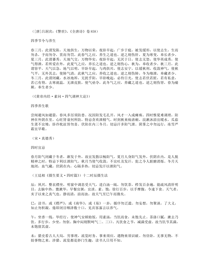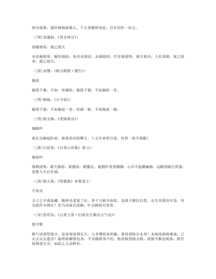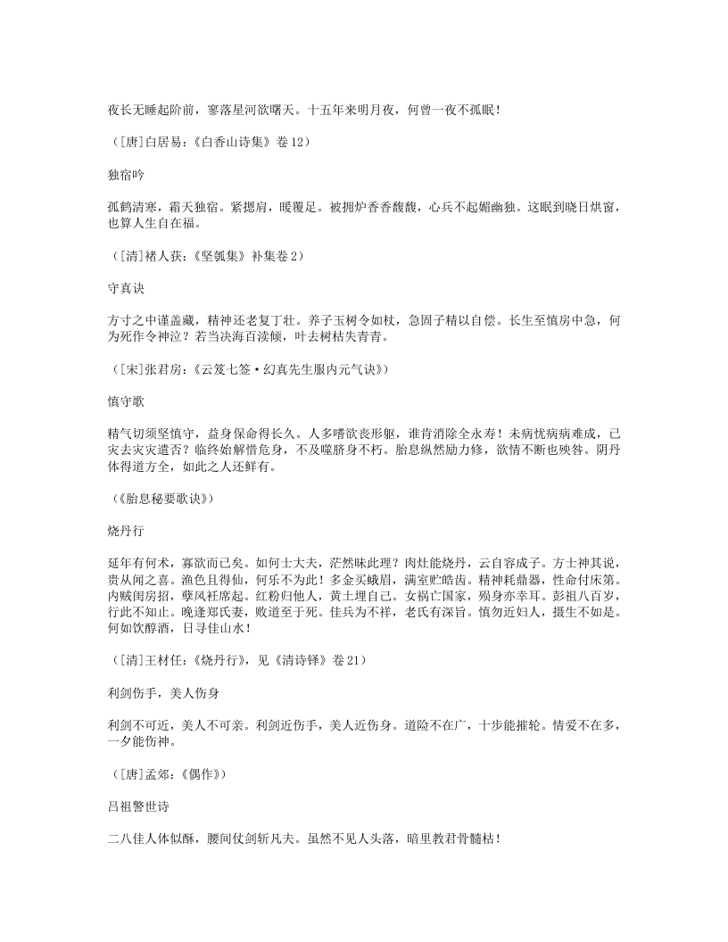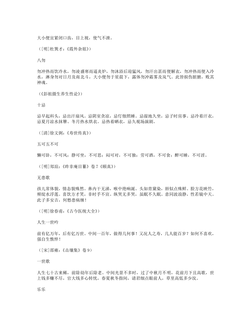 新沐浴形适外无羌,心恬内无忧。夜来新沐浴,肌发舒且柔。宽裁夹乌帽,厚絮长白裘。裘温裹我足帽暖履我头。先进酒一杯,次举粥一瓯。半酣半饱时,四体春悠悠。是月岁阴暮,惨冽天地愁。白日冷无光,黄河冻不流。何处征戌行,何人羁旅游。穷途绝粮客,寒狱无烟囚。劳生彼何苦,遂性我何忧!抚心但自婉,孰知其所由。([唐]白居易:《白香山诗集》卷24)新浴老来喜沐浴,又复畏风寒。门户齐扃闭,日光尽遮拦。不自见形槁,岂复生长叹。骤浴未甚适,徐浴始陶然。兰汤三益后,颓然如醉眠。问我何所以?如与妇交欢。交欢竭精髓,沐浴泽容颜。起来披衣坐,自觉生羽翰。矫然欲上升,但若力稍绵。乘此力稍绵,觅枕游邯郸。我意在辟谷,且勿劝加餐。([清]李渔:《笠翁一家言全集》卷5)洗脚上床真一快老人不复事农桑,点数鸡豚亦未忘。洗脚上床真一快,稚孙渐长解烧汤。([宋]陆游:《剑南诗稿·泛舟过金家埂赠卖薪王翁》)能寐吟大惊不寐,大忧不寐。大伤不寐,大病不寐。大喜不寐,大安能寐。何故不寐?湛于有累。何故能寐?行于无事。([宋]邵雍:《击壤集》)睡诀《鸿书》:花竹幽窗午梦长,此中与世暂相忘。华山处士如容见,不觅仙方觅睡方。西山蔡季通有睡诀云:“先睡心,后睡眠。”晦庵以为此古今未发之妙,然其语本《千金方》,云:半醉酒,独自宿。软枕头,暖盖足。能息心,自暝目。此睡诀也。([清]褚人获:《坚瓠集》四集卷3)睡如猫睡如猫,精不逃。睡如狗,精不走。([清]无名氏《养生秘旨》)紧闭口齿,开眼而溺