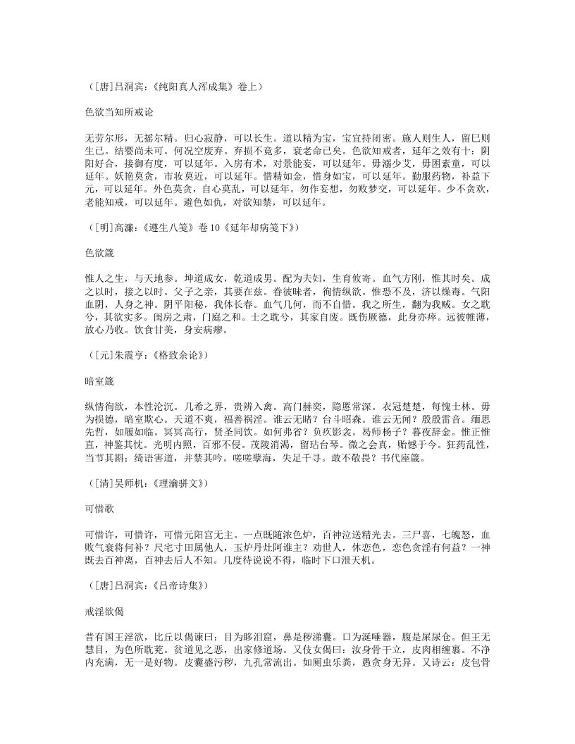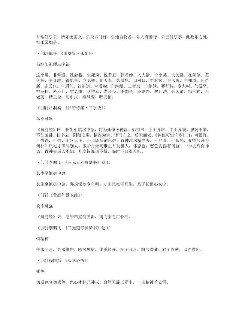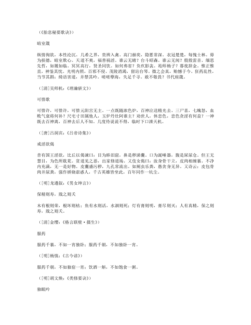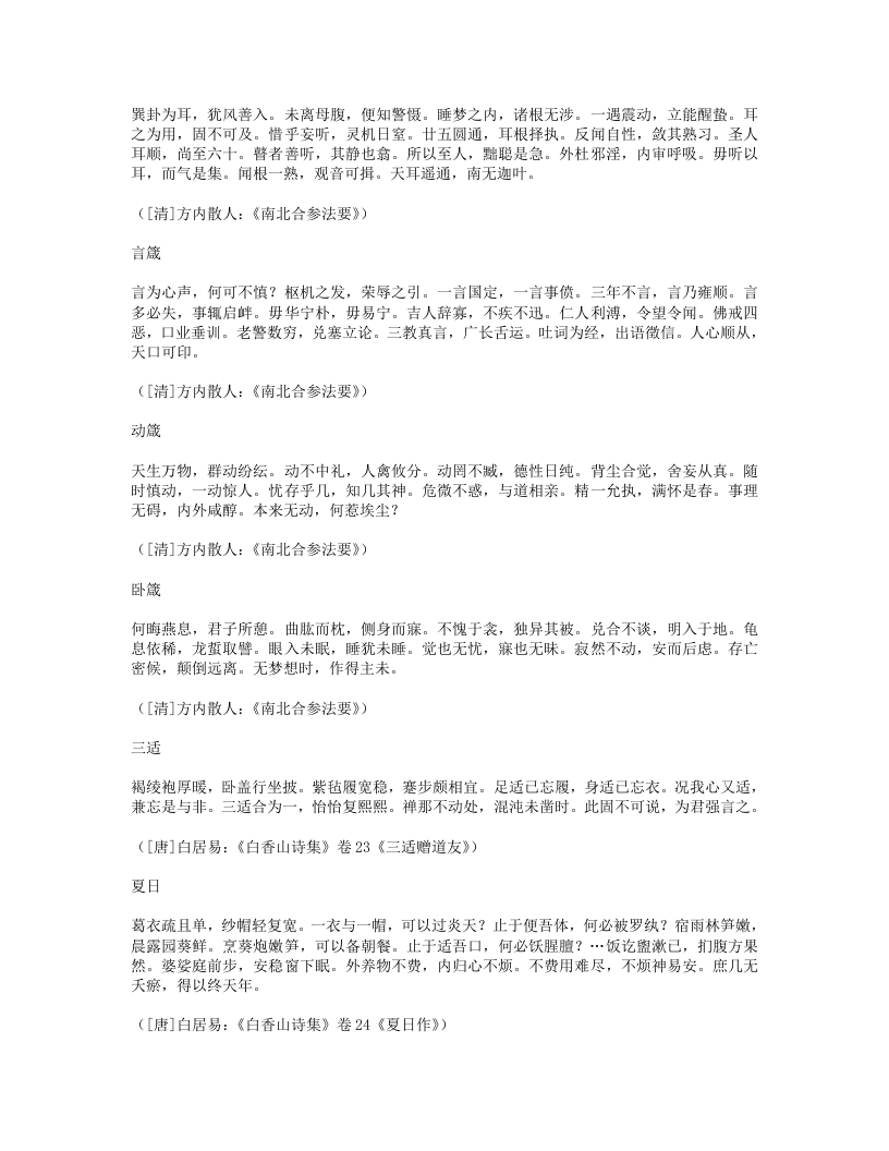 新沐浴形适外无羌,心恬内无忧。夜来新沐浴,肌发舒且柔。宽裁夹乌帽,厚絮长白裘。裘温裹我足帽暖履我头。先进酒一杯,次举粥一瓯。半酣半饱时,四体春悠悠。是月岁阴暮,惨冽天地愁。白日冷无光,黄河冻不流。何处征戌行,何人羁旅游。穷途绝粮客,寒狱无烟囚。劳生彼何苦,遂性我何忧!抚心但自婉,孰知其所由。([唐]白居易:《白香山诗集》卷24)新浴老来喜沐浴,又复畏风寒。门户齐扃闭,日光尽遮拦。不自见形槁,岂复生长叹。骤浴未甚适,徐浴始陶然。兰汤三益后,颓然如醉眠。问我何所以?如与妇交欢。交欢竭精髓,沐浴泽容颜。起来披衣坐,自觉生羽翰。矫然欲上升,但若力稍绵。乘此力稍绵,觅枕游邯郸。我意在辟谷,且勿劝加餐。([清]李渔:《笠翁一家言全集》卷5)洗脚上床真一快老人不复事农桑,点数鸡豚亦未忘。洗脚上床真一快,稚孙渐长解烧汤。([宋]陆游:《剑南诗稿·泛舟过金家埂赠卖薪王翁》)能寐吟大惊不寐,大忧不寐。大伤不寐,大病不寐。大喜不寐,大安能寐。何故不寐?湛于有累。何故能寐?行于无事。([宋]邵雍:《击壤集》)睡诀《鸿书》:花竹幽窗午梦长,此中与世暂相忘。华山处士如容见,不觅仙方觅睡方。西山蔡季通有睡诀云:“先睡心,后睡眠。”晦庵以为此古今未发之妙,然其语本《千金方》,云:半醉酒,独自宿。软枕头,暖盖足。能息心,自暝目。此睡诀也。([清]褚人获:《坚瓠集》四集卷3)睡如猫睡如猫,精不逃。睡如狗,精不走。([清]无名氏《养生秘旨》)紧闭口齿,开眼而溺