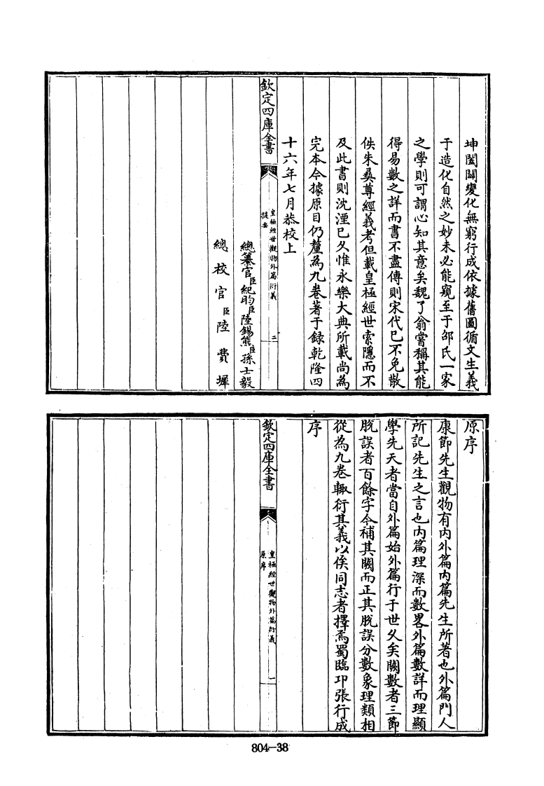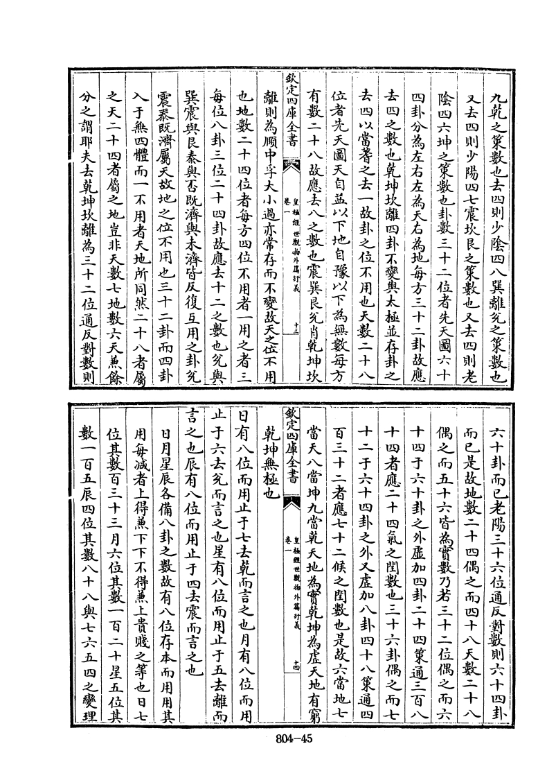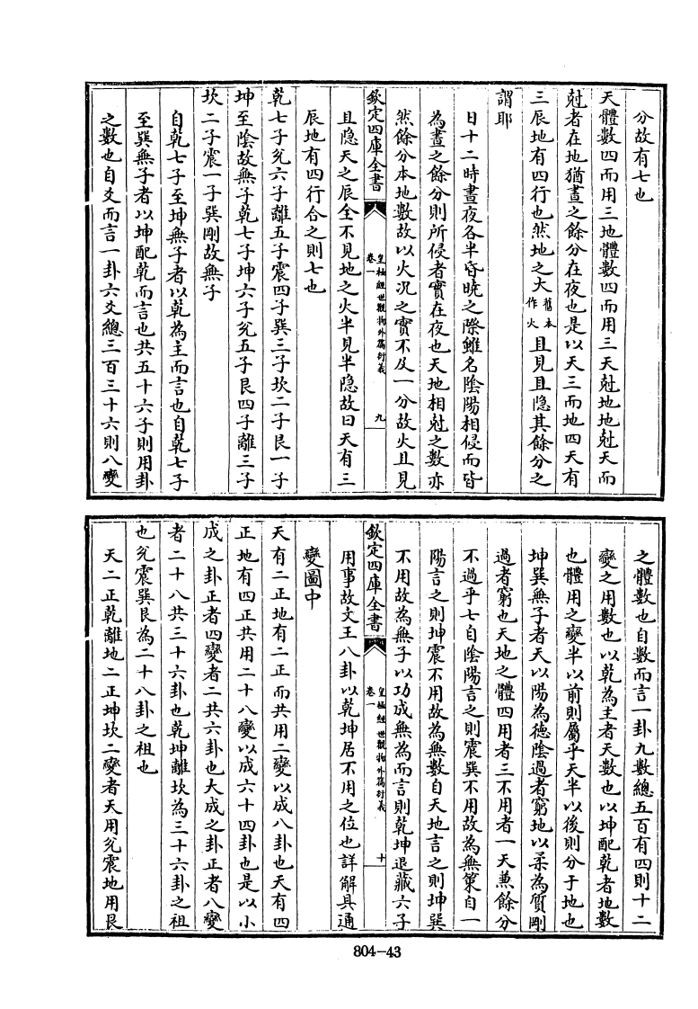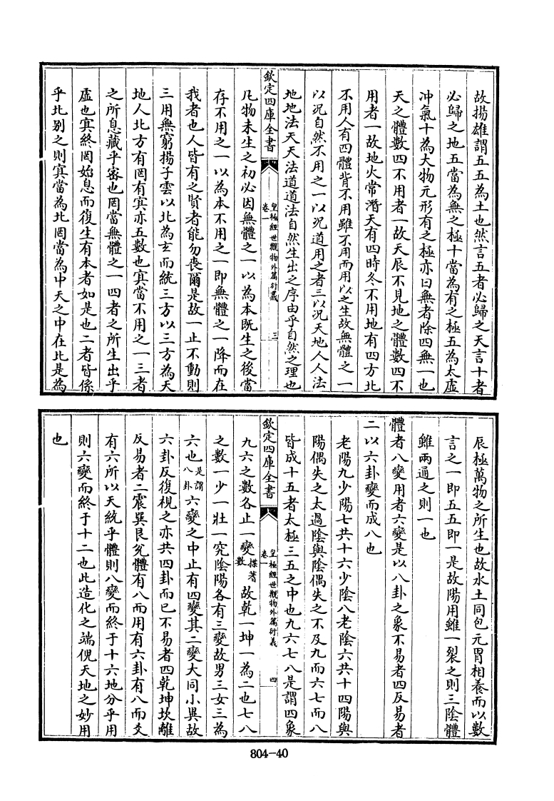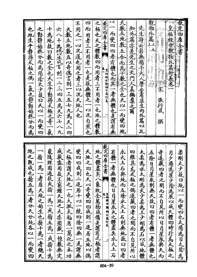 也地生乎静得太極之偶一氣之静動始然公而為之動静始然分而為陽陰太少故曰天以一而變四十為地故曰数之全也天生乎動得太極之奇一氣六八+地以歲言则一二三四五為天六七八九天数五地數五以奇偶言则一三五七九為天二四不用之一以犯道也用之者三以犯天地人也四而用者三不用者一也是故無體之一以况自然也之極也天之體数四而用者三不用者一也地之體定四車全書人以一而變四四者有體也而其一者無體也是謂有無天数五地数五合而為十最之全也天以一而變四地知外篇亦是先生之文門人盖翻集之爾先生詩云若無楊子天人學安有莊生内外篇以比皇極經世觀物外高新義卷張行成撰她之既成也猫五為一者分天分地各以一而爽四一猫一為一者原天地之始生也描十為一者總天象隨理圆通故或指一為一或指五福一或指十為成藏家用敌不窮羅天地之大亦須我一惟数無定之極者謂天地之一也大批太極居一萬化之本功變四四成则二退居十以一統四除四無一是謂無天地之四也天以奇交四四成则一退居五地以偶地之體盡矢八象既全萬物咸備是謂有之極者謂致定四庫全書《皇福祖世觀物外满好義有體一者無體也日月星辰天之體盡实水火土石水火土石與地而五除水火土石則無地故曰四者四維具為术極之偶退藏四者之間而不自見所以太柔為水太剛為火少柔為土少剛為石以成地體五除日月星辰則無天故曰四者有體一者無體也奇退藏四者之關而不自見所以日月星辰與天而月少陽為星少陰為辰以成天體四時行高太極之柔剛太少故曰地以一而變四也太陽為日太陰為804-39
