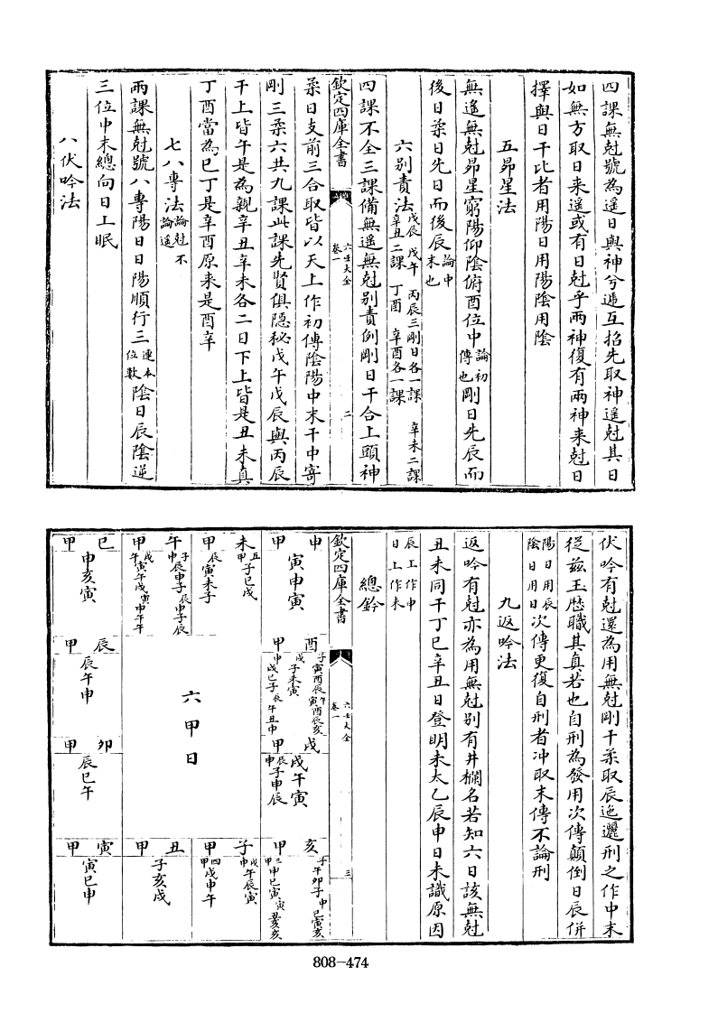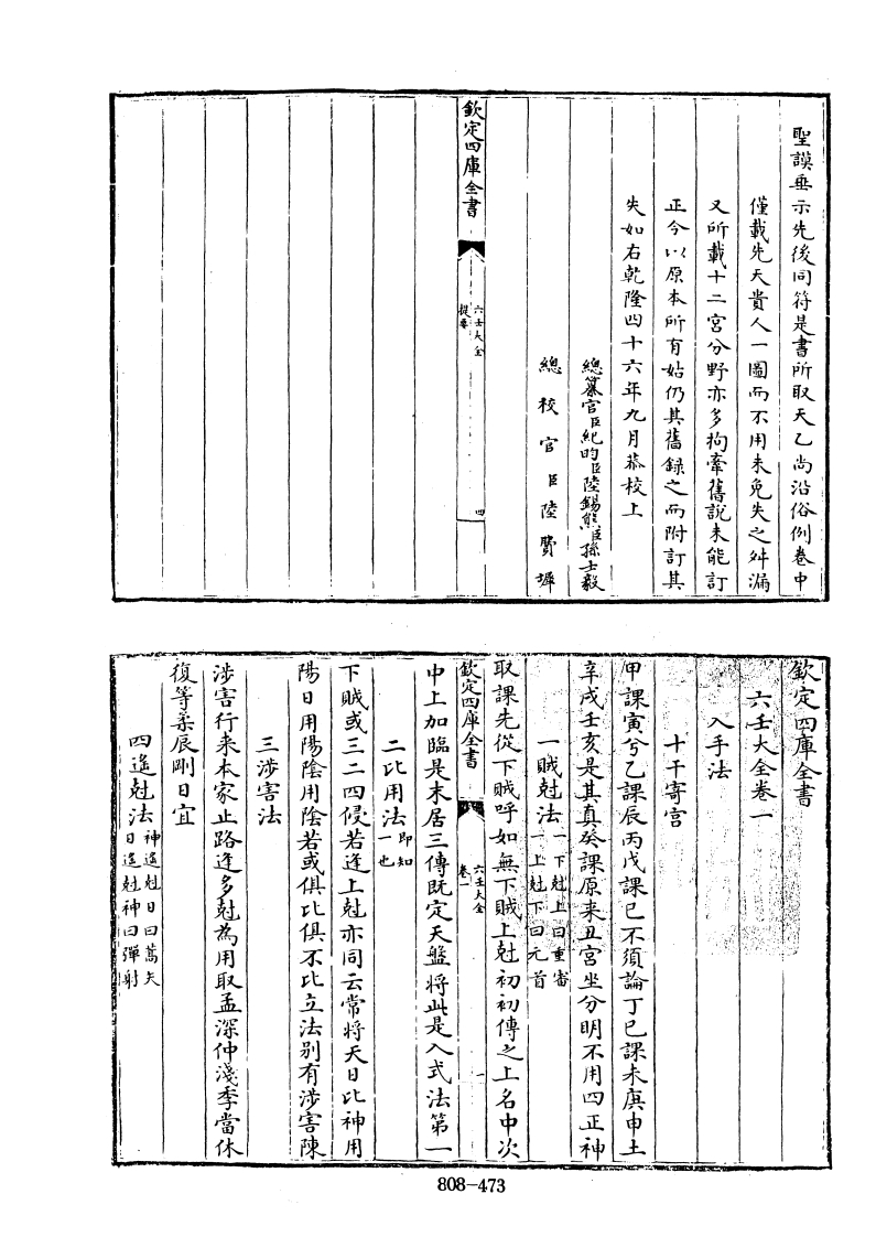敬定回鼻全書附話以区總慕官E紀时臣陸錫医孫士教失如为乾隆四十六年九月恭校上正今以原本所有始仍其舊録之而附韵其又所載十二宫分野亦多狗章舊說未能新懂載先天贵人一國而不用未免失之外漏聖旗垂示先後同符是書所取天乙尚沿俗例表中復等亲辰刚日宜涉書行来木家止路達多刺為用取孟深仲滚季當休三涉害法佛日用陽陰用陰若或俱比俱不此立法别有涉害陳下贼或三二四侵若達上灶亦同云常将天日比神用二就用法晴中上加臨是木居三傳既定天盤将此是入式法第改定四鼻全書取课先從下眠呼如無下藏上魅初初傅之上名中次一晚活法一千以七文部辛成士亥是其真癸课原来丑宫坐分明不用四正神甲课寅兮乙课辰丙戊课已不須始丁已课未滨申土十干守宫入手语六壬大全卷一敬定四庫全書808-473