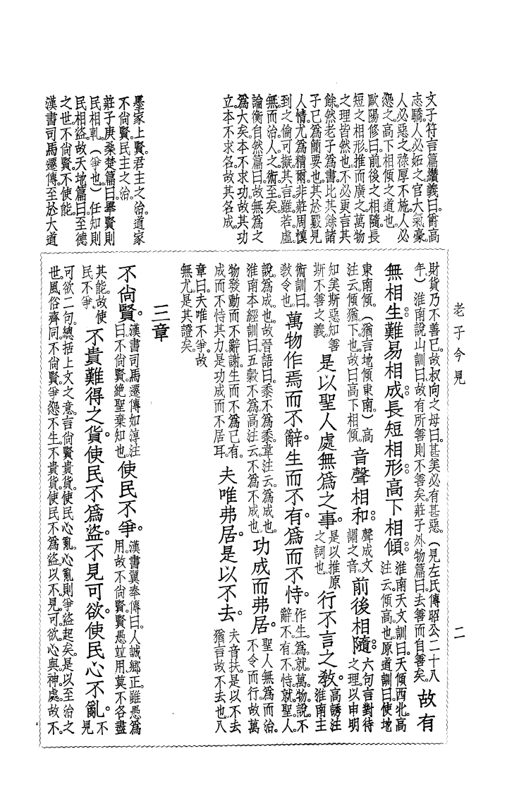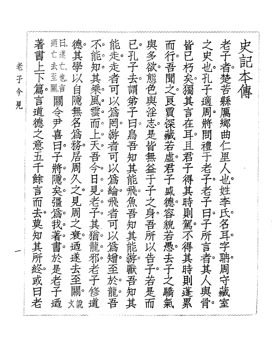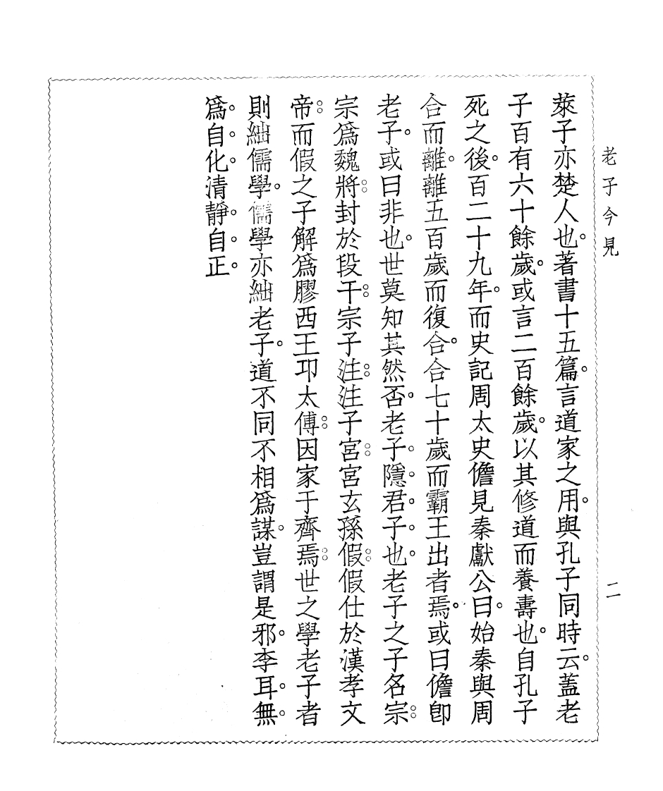 儒自化清静自正則絀儒學儒學亦絀老子道不同不相爲謀豈謂是邪本耳無帝而假之子解儒膜西王太傅因家于齊焉世之學老子者宗儒魏將封於段干宗子往往子宫宫玄孫假假仕於漢孝文老子或曰非也世莫知其然否老子隱君子也老子之子名宗合而離離玉百歲而復合合七十歲而霸王出者焉或曰儋即死之後百二十九年而史記周太史僧見秦獻公日始秦與周子百有六十餘歲或言二百餘歲以其修道而養壽也自孔子恭子亦楚人也著書十五篇言道家之用與孔子同時云蓋老老子今見