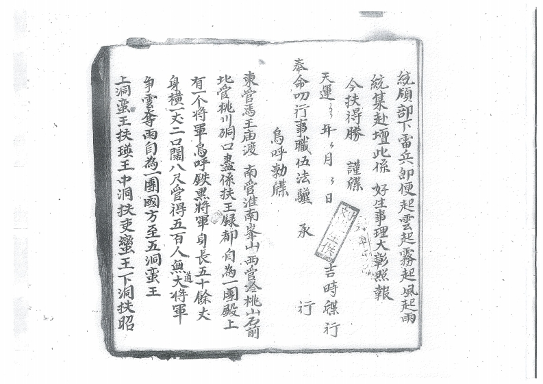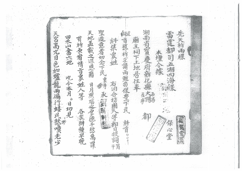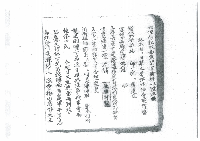 教济下民海此合行具得禄文照會梅山島呼大王恐愿失信於下民苗缘轉加苦楚事于蒙总今經日父道熙雷两到球龍王问種下馬返日連腾法事所求會雨祈雨租師前去,處,洞灵潭迎取聖水行两天官上里雨即真同合登聖灵保豐法事一種理請三界高真下遠證盟感灵有欲祈求清雨驰海竭誠祈得使師于就,處建立道於本月。日禁止暑洁沐浩备孩行香烟煌恐秋双而魚望髙簡麓以難逃