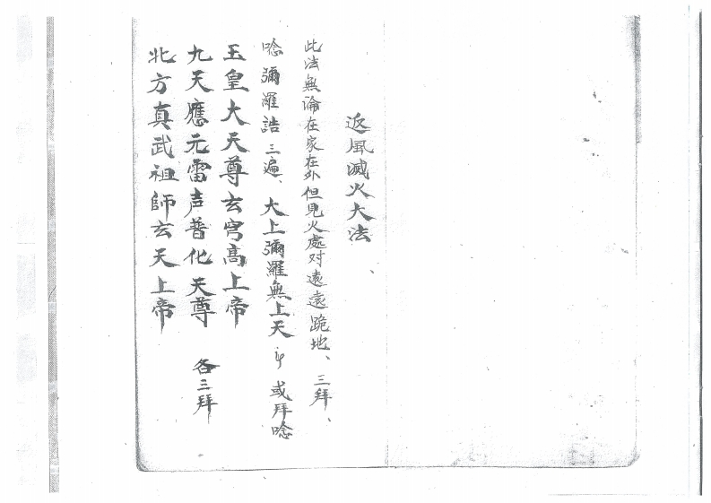 北方真武祖師玄天上帝九天應元雷声普化天尊玉皇大天尊女宫高上帝临通雁语三遍,大上滴羅典上天中或拜降比法照谕在家在外但見火處对遠遠跪地、三年。远風减火大法各三拜