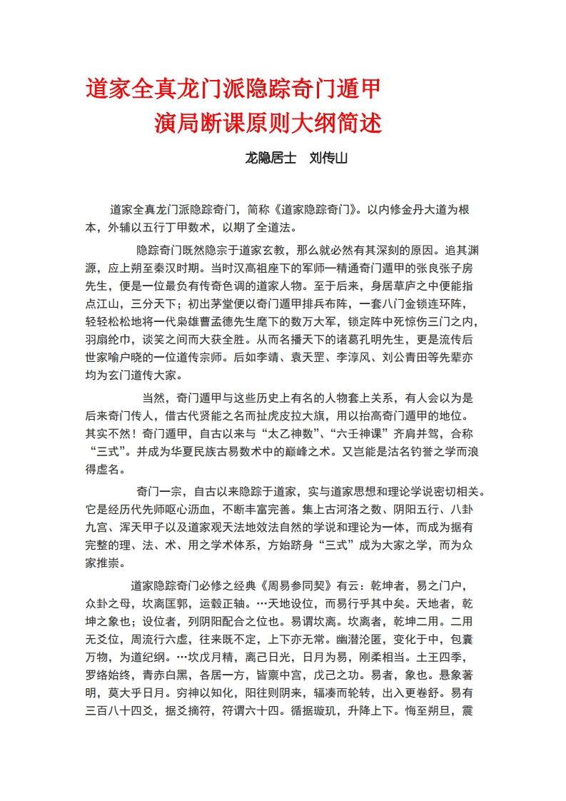 道家全真龙门派隐踪奇门遁甲演局断课原则大纲简述龙隐居士刘传山道家全真龙门派隐踪奇门,简称《道家隐踪奇门》。以内修金丹大道为根本,外辅以五行丁甲数术,以期了全道法。隐踪奇门既然隐宗于道家玄教,那么就必然有其深刻的原因。追其渊源,应上朔至秦汉时期。当时汉高祖座下的军师一精通奇门遁甲的张良张子房先生,便是一位最负有传奇色调的道家人物。至于后来,身居草庐之中便能指点江山,三分天下;初出茅堂便以奇门遁甲排兵布阵,一套八门金锁连环阵,轻轻松松地将一代枭雄曹孟德先生麾下的数万大军,锁定阵中死惊伤三门之内,羽扇纶巾,谈笑之间而大获全胜。从而名播天下的诸葛孔明先生,更是流传后世家喻户晓的一位道传宗师。后如李靖、袁天罡、李淳风、刘公青田等先辈亦均为玄门道传大家。当然,奇门遁甲与这些历史上有名的人物套上关系,有人会以为是后来奇门传人,借古代贤能之名而扯虎皮拉大旗,用以抬高奇门遁甲的地位。其实不然!奇门遁甲,自古以来与“太乙神数”、“六壬神课”齐肩并驾,合称“三式”。并成为华夏民族古易数术中的巅峰之术。又岂能是沽名钓誉之学而浪得虚名。奇门一宗,自古以来隐踪于道家,实与道家思想和理论学说密切相关。它是经历代先师呕心沥血,不断丰富完善。集上古河洛之数、阴阳五行、八卦九宫、浑天甲子以及道家观天法地效法自然的学说和理论为一体,而成为据有完整的理、法、术、用之学术体系,方始跻身“三式”成为大家之学,而为众家推崇。道家隐踪奇门必修之经典《周易参同契》有云:乾坤者,易之门户,众卦之母,坎离匡郭,运毂正轴。…天地设位,而易行乎其中矣。天地者,乾坤之象也;设位者,列阴阳配合之位也。易谓坎离。坎离者,乾坤二用。二用无爻位,周流行六虚,往来既不定,上下亦无常。幽潜沦匿,变化于中,包囊万物,为道纪纲。…坎戊月精,离己日光,日月为易,刚柔相当。土王四季,罗络始终,青赤白黑,各居一方,皆禀中宫,戊己之功。易者,象也。悬象著明,莫大乎日月。穷神以知化,阳往则阴来,辐凑而轮转,出入更卷舒。易有三百八十四爻,据爻摘符,符谓六十四。循据璇玑,升降上下。悔至朔旦,震