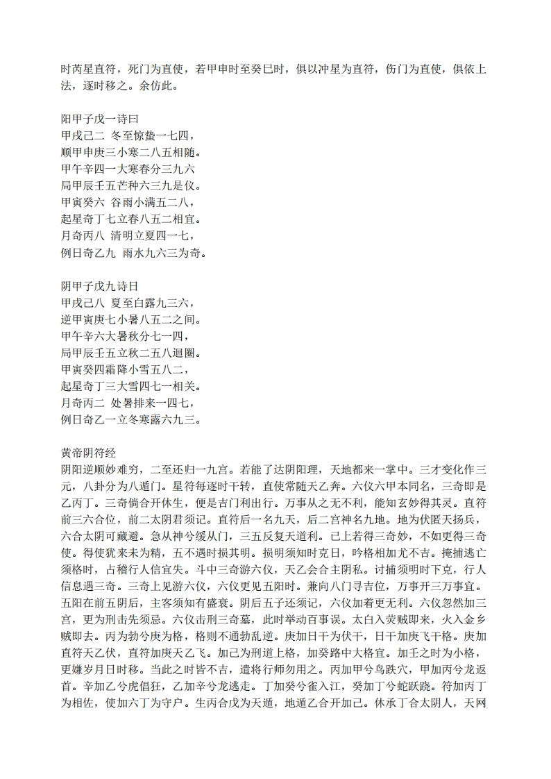 奇门遁甲全书遁甲源流昔黄帝始创奇门,四千三百二十局法,乃岁按八卦分八节,节有三气,岁大率二十四气也。气有天地人三候,岁大率七十二候也。候有五日,岁大率三百六十日也。日有十二时,岁大率四千三百二十时也。一时一局,故奇门四千三百二十局也。风后制奇门为一千八十局者,以冬至阳生,起坎艮震巽四卦,统气一十二,候计三十六,分局五百四十,为阳遁;以夏至阴生,起离坤兑乾四卦,统气一十二,候计三十六,分局五百四十,为阴遁。合阴阳二遁为一千八十定局也。此盖撮四候而共看六十时定局,四个一千八十定局,则依旧为四千三百二十局矣。周太公谙兵法,善布奇门,以八卦分八节,节分三气,气分三候,岁计七十二候,立七十二活局,每局六十时,七十二局计四千三百二十时也。汉张子房删捷,冬至十二气,分三十六候,撮四候为阳遁九局。夏至十二气,分三十六候,撮四候为阴遁九局。此活图更捷也。夫一十八局七十二局,皆不越一千八十局矣。作硬局,则皆一千八十局:作活局,则有七十二局、一十八局。然一十八局虽简,以奇门星仪符使之,行悉定布于局中,其为课四千三百二十,举目在前,其所未为者,只加临一事耳。如欲加临,但依局所定,正转两盘,其课遂成。是风后之法,乃万世不易也。年家奇门上元一宫起甲子,中元四宫起甲子,下元七宫起甲子。俱逆飞六仪,顺布三奇。随三元内,各年支干,审在某甲旬内,则以其甲头为直符.符上之门为直使,将甲头直符之星,逐年干转,直使随年支逆飞,审其方向,得奇门到者吉。自嘉靖四十三年甲子起,杜门十年,一移万历甲午年移休。三元年遁,上元六十年,以阴遁一局加之。中元六十年,以阴遁四局加之。下元六十年,以阴遁七局加之。月家奇门三元分局,甲己遇四孟,为上元,在一宫起甲子。甲己遇四仲,为中元,在七宫起甲子。甲己遇四季,为下元,在四宫起甲子。俱逆布六仪,顺布三奇。每一元管五年。凡推月奇门,先审其年在何一元内,依前布门飞奇,次就其年遁月建,系某甲头直符,逐地下月干,转符上之门,为直使,随月支飞泊,看方向,得奇门,到大利。自嘉靖四十二年十一月甲子起休门,在坎三个月一移,至万历四十一年十一月甲子,起休门在坎。三元月遁,以五虎遁月建对之,六十年遁,乙丙丁奇,并同八门方位。日家奇门分阴阳二遁,按节推排,三日一局。顺行六甲,周而复始。休开生景吉,得生旺,合三奇加临更利。起诀:甲戊壬子居坎,丁辛乙卯坤裁。庚甲戊马震宫游,丁癸辛鸡巽在。庚丙鼠归乾六,己癸卯走西街。丙壬赤马艮安排,乙已鸡飞离界。其法自坎宫起甲子,每三日一换顺,飞八方,不入中五,看其日到何宫,便起休门一顺轮去,三吉门到方便出入行事吉。如甲子、乙丑、丙寅,在坎:丁卯戊辰、己已,在坤:之类,余仿此推。甲子、乙丑、