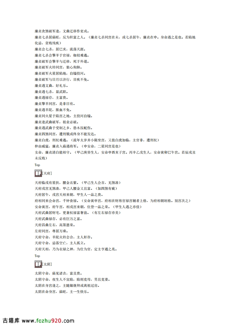 向实寻虚,从无取有。触类旁通,或体或用。紫微斗数论命要诀内外交争,斗转星移。钩深致远,限年月时。宫限变化,岂可执一。星类万象,斯为易理。周易预测及命理研究一一陈剑紫微天机太阳武曲天同廉贞天府太阴贪狼巨门天相天梁七杀破军文昌文曲左辅右弼天魁天钺天马禄存擎羊陀罗火星铃星化禄化权化科化忌天空地劫天伤天使天刑天姚天哭天虚红鸾天喜天才天寿恩光天贵天官天福命身限财田福四紫微]紫微居子午,科权禄照最为奇。紫微守命丑宫,前有吉曜来呼号,必当大权之职。紫微居午,无羊陀,甲丁己生人,位至公卿。紫微男亥女寅宫,壬甲生人富贵同。紫微居卯酉,遇劫空四煞,多为脱俗僧人。紫微无辅弼同行,则为孤君,美中不足紫微遇凶星,虽获吉而无道。紫微天府,全依辅弼之功。紫府同宫,终身福厚。紫府同宫,无煞凑,甲生人享福终身。紫府朝垣,食禄万钟。紫府朝垣活禄逢,终身福厚至三公。紫微与天府、左右、昌曲、禄马三合,极吉,食禄千钟,巨富大贵。紫府日月居旺地,断定公侯器。紫府夹命为贵格。紫微贪狼同宫于卯酉,不忠不义,屠近奸人。紫微贪狼为至淫,男女邪淫。女命,紫微与贪狼同宫,男女邪淫。紫微守命,天相左右来夹拱,为君臣庆会,有治国经邦之才。紫微七杀化权,反作祯祥。紫微七杀加空亡,虚名受荫。紫微七杀同宫会四煞,不贵,孤独、刑伤。紫破命临于丑未,再加吉曜,富贵堪期。紫微破军,无左右,无吉曜,凶恶胥吏之徒。紫微辰戌遇破军,富而不贵有虚名。紫微辰戌遇破军,君臣不义。紫微遇破军在辰戌丑未四墓宫,主为臣不忠,为子不孝。紫微吕曲,富贵堪期。紫微辅弼同宫,一呼百诺,居上品。